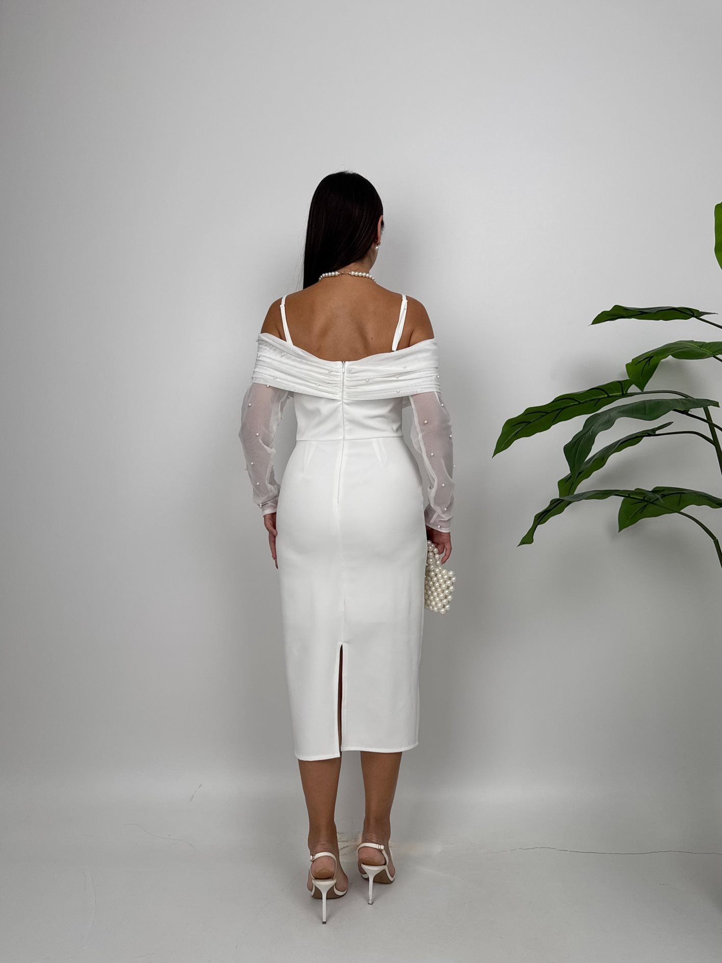 4017 OMUZ TÜLLÜ ASKI İNCİ DETAYLI ELBİSE WHİTE - BEYAZ