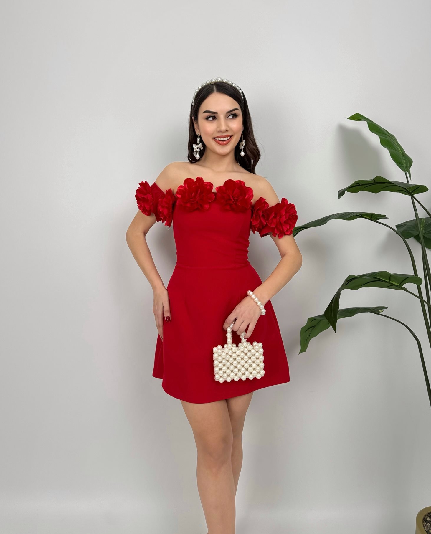 4022 STRAPLEZ YAKA GÜLLÜ MİNİ ELBİSE RED - KIRMIZI