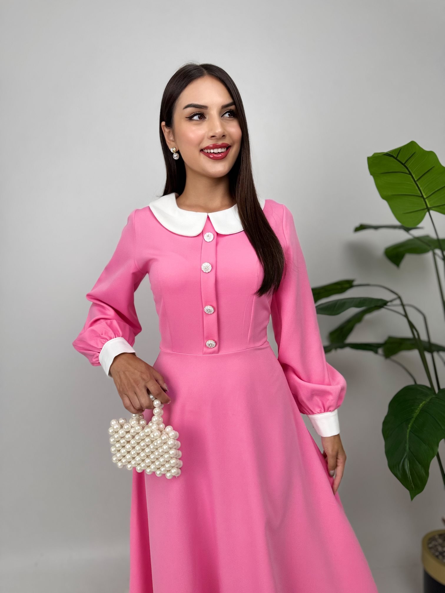 1001 MİDİ BEBE YAKA ELBİSE PİNK - PEMBE