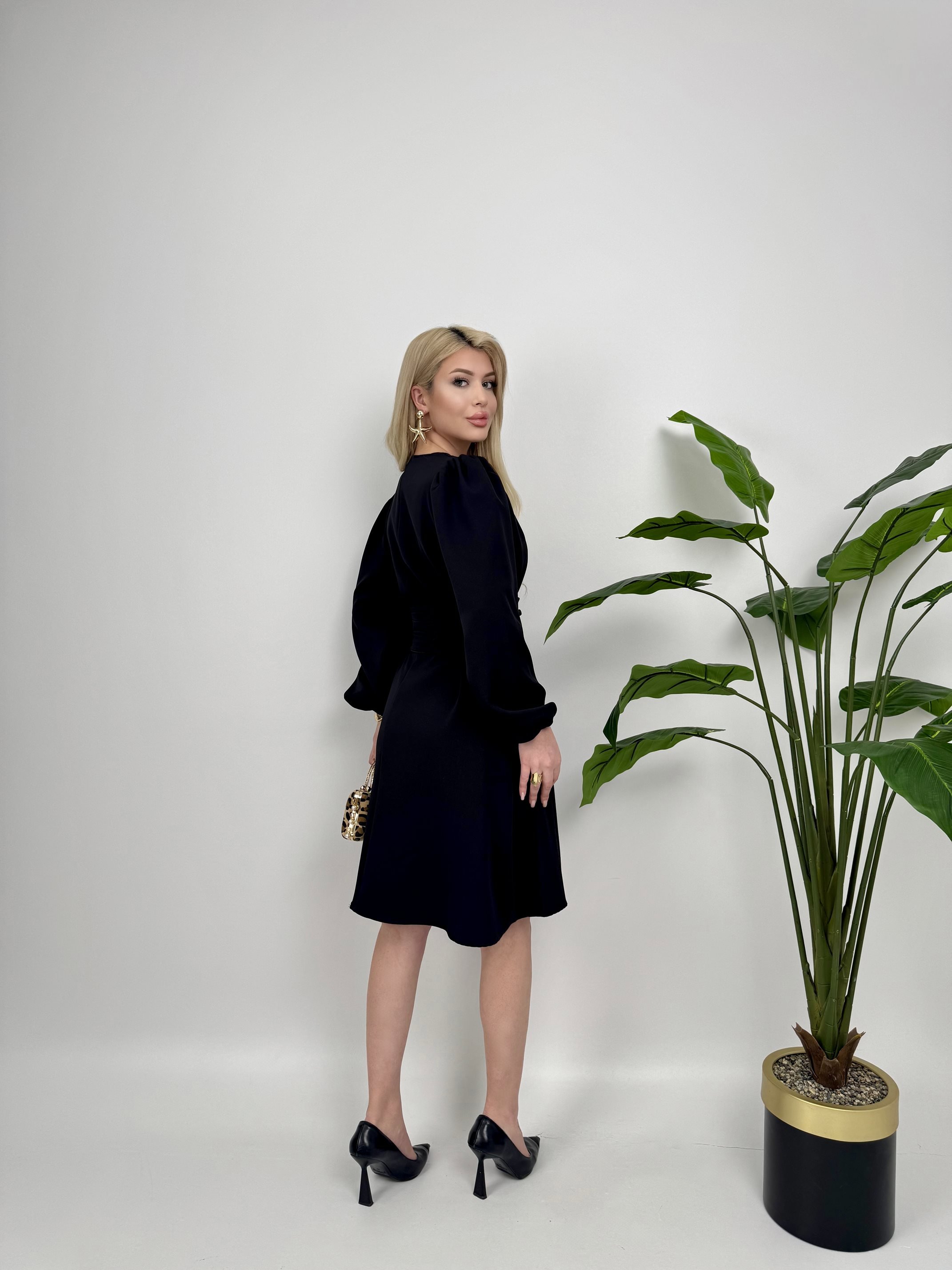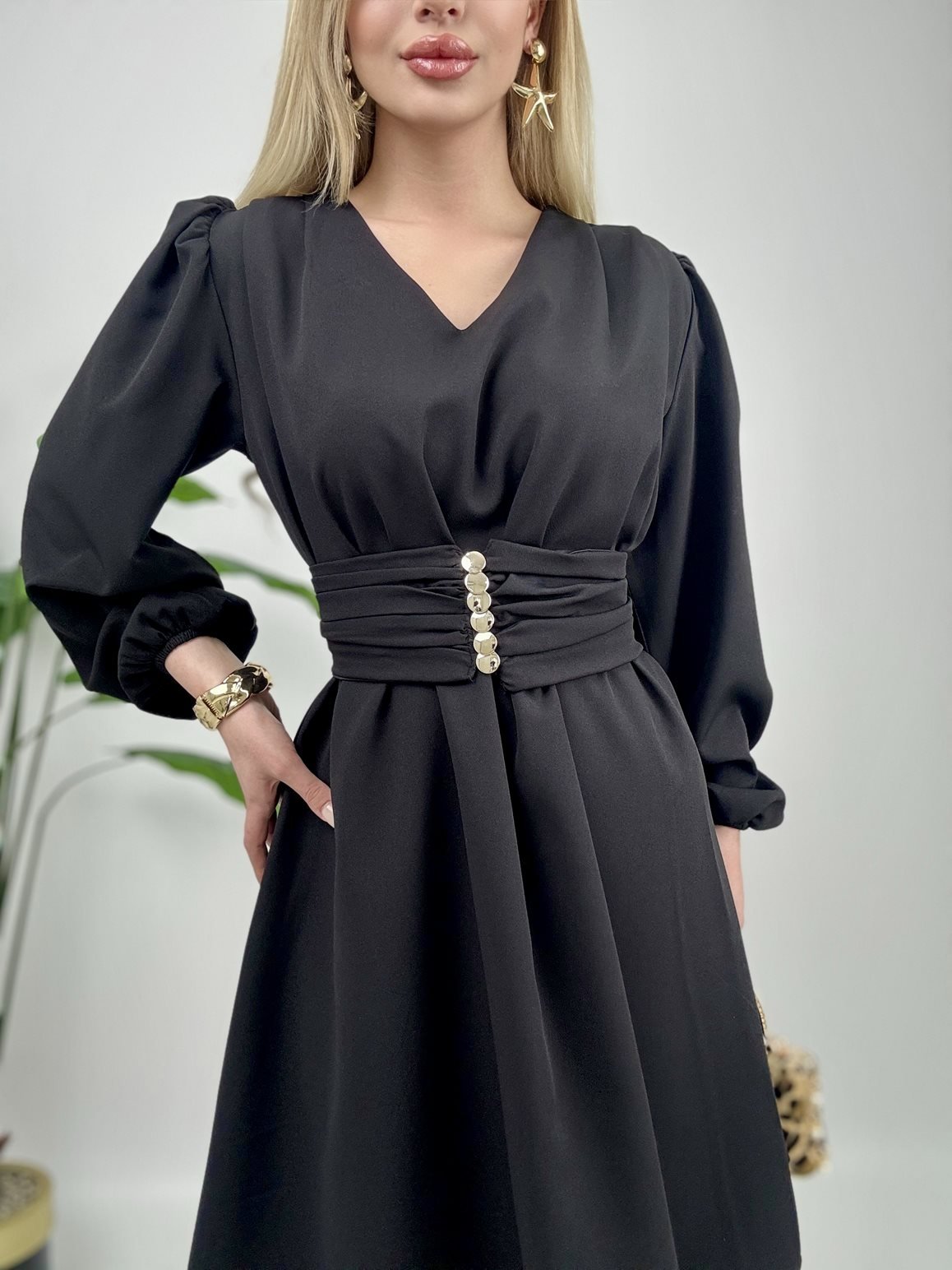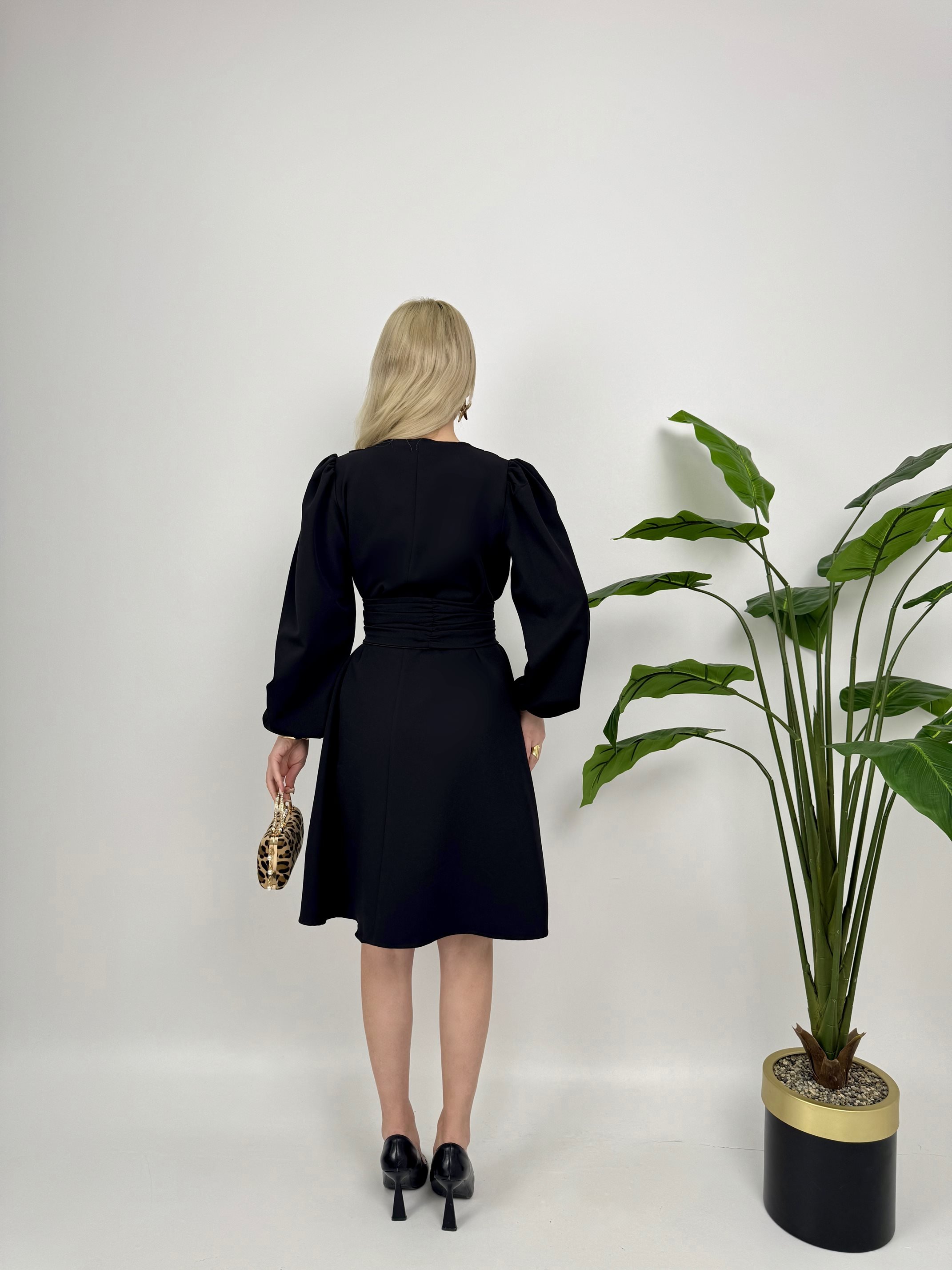 1003 OMUZ PİLE KUŞAKLI ELBİSE BLACK - SİYAH