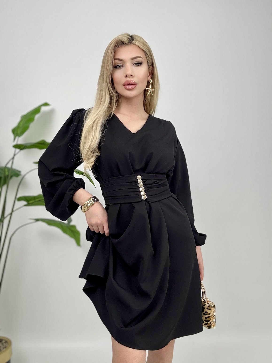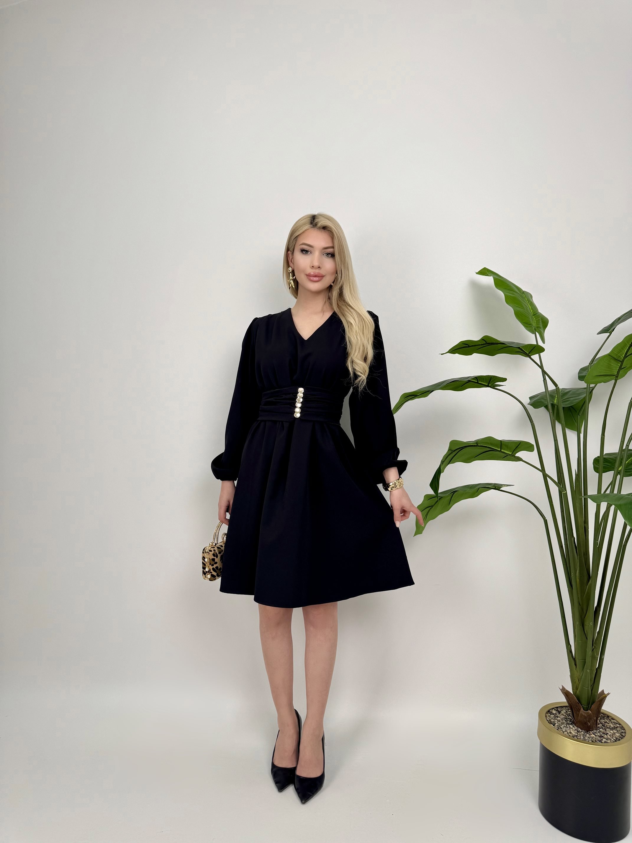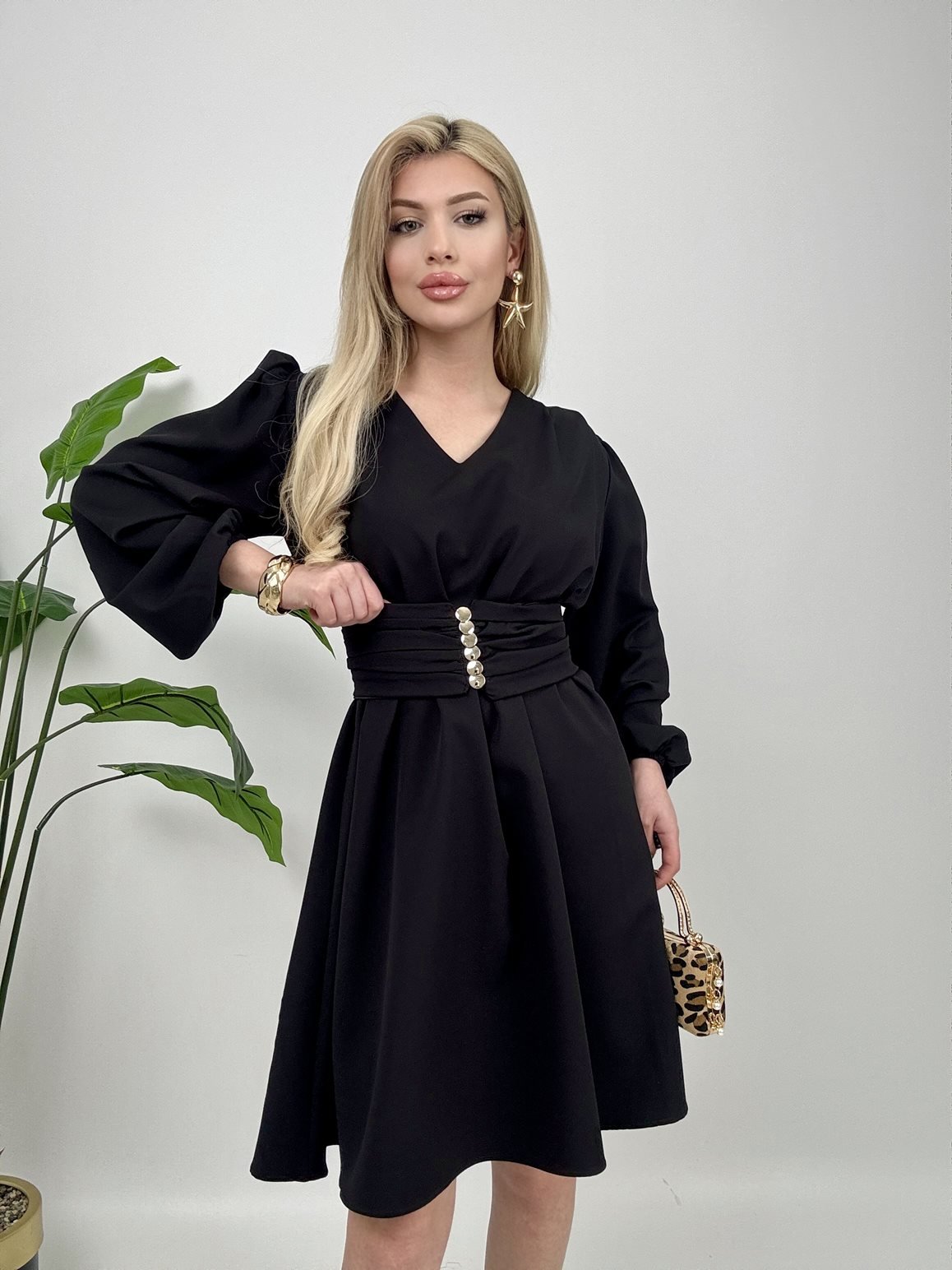 1003 OMUZ PİLE KUŞAKLI ELBİSE BLACK - SİYAH