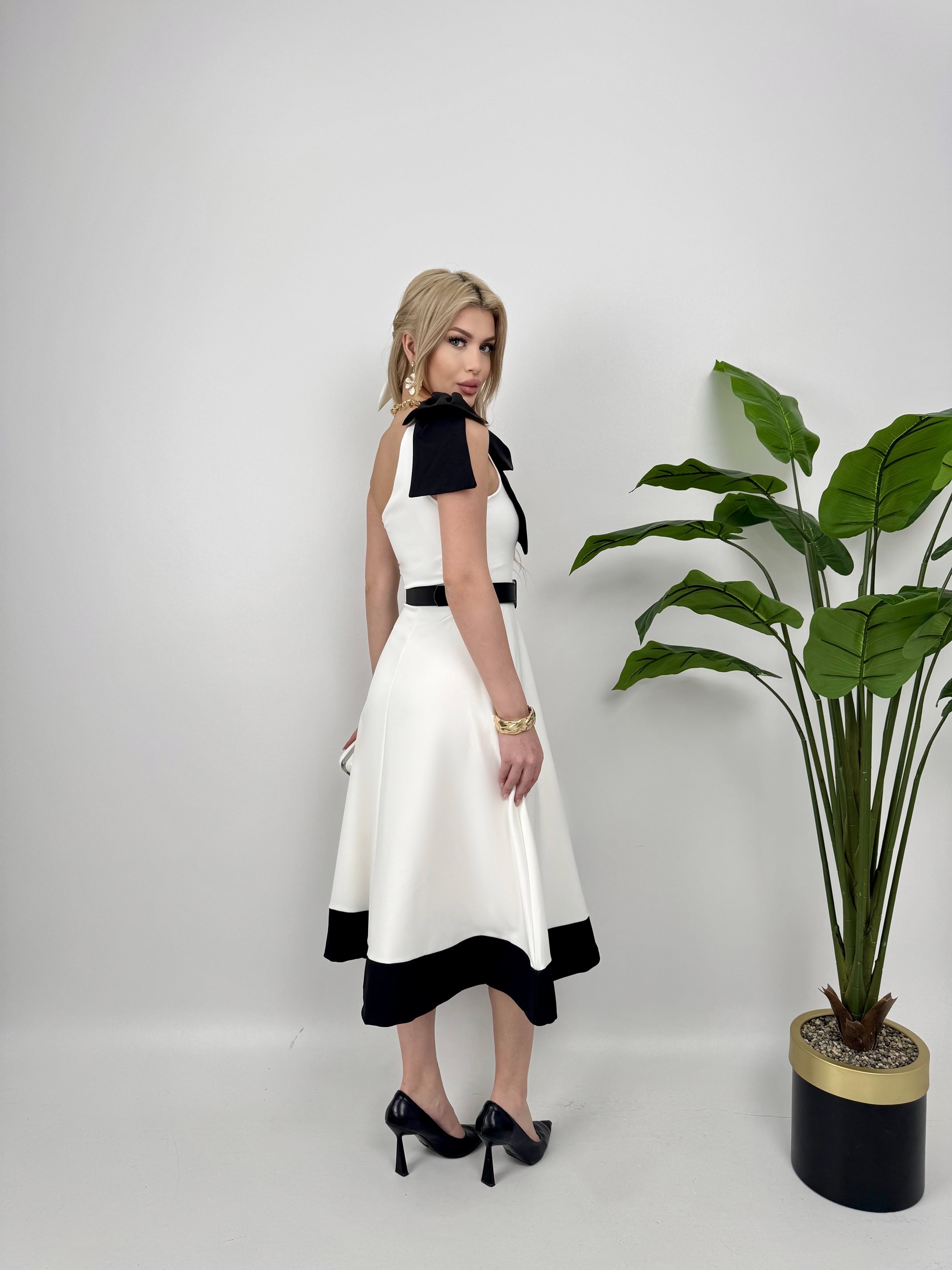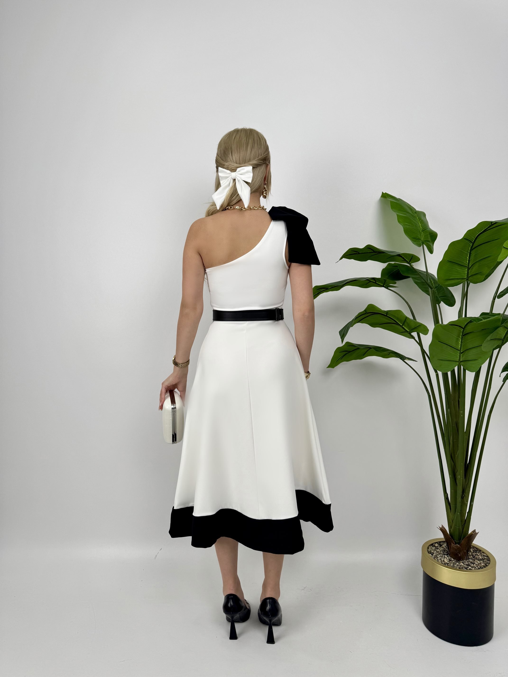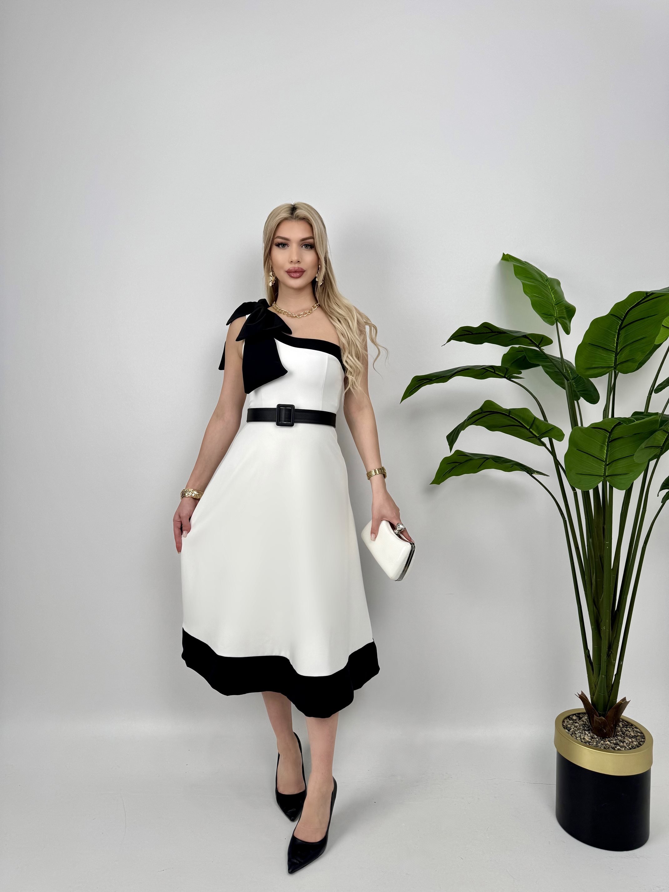 2040 TEK OMUZ FİYONKLU KEMERLİ ELBİSE WHİTE - BEYAZ