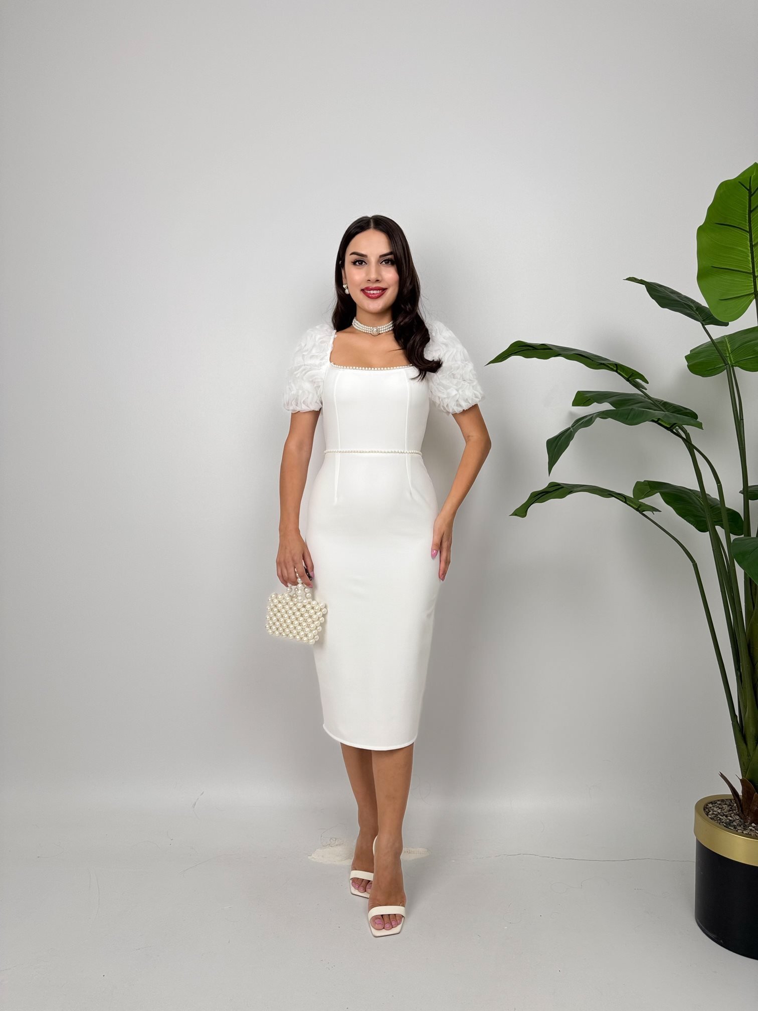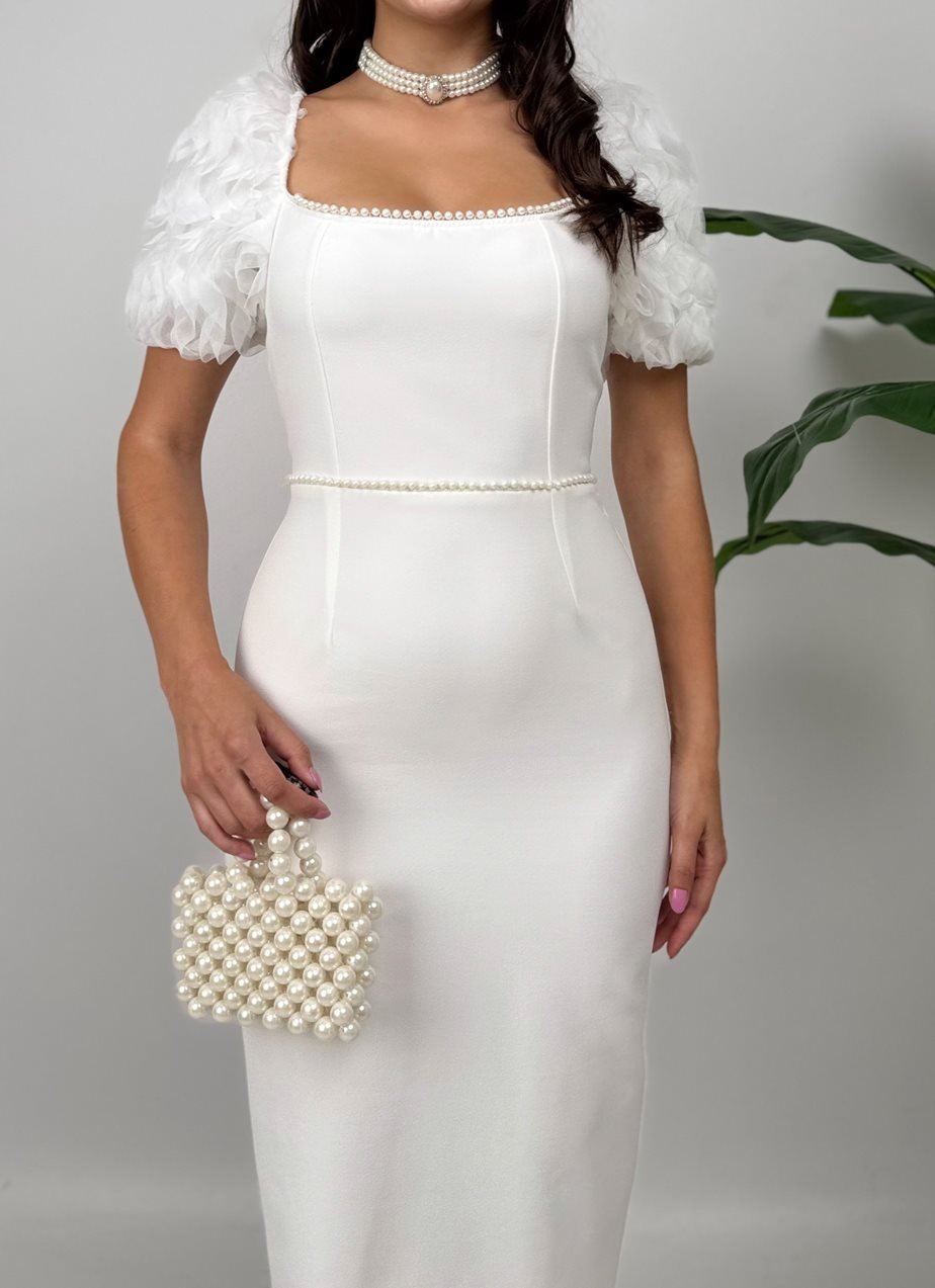2051 KOLLAR İTHAL KUMAŞ İNCİ DEYAT ELBİSE WHİTE - BEYAZ