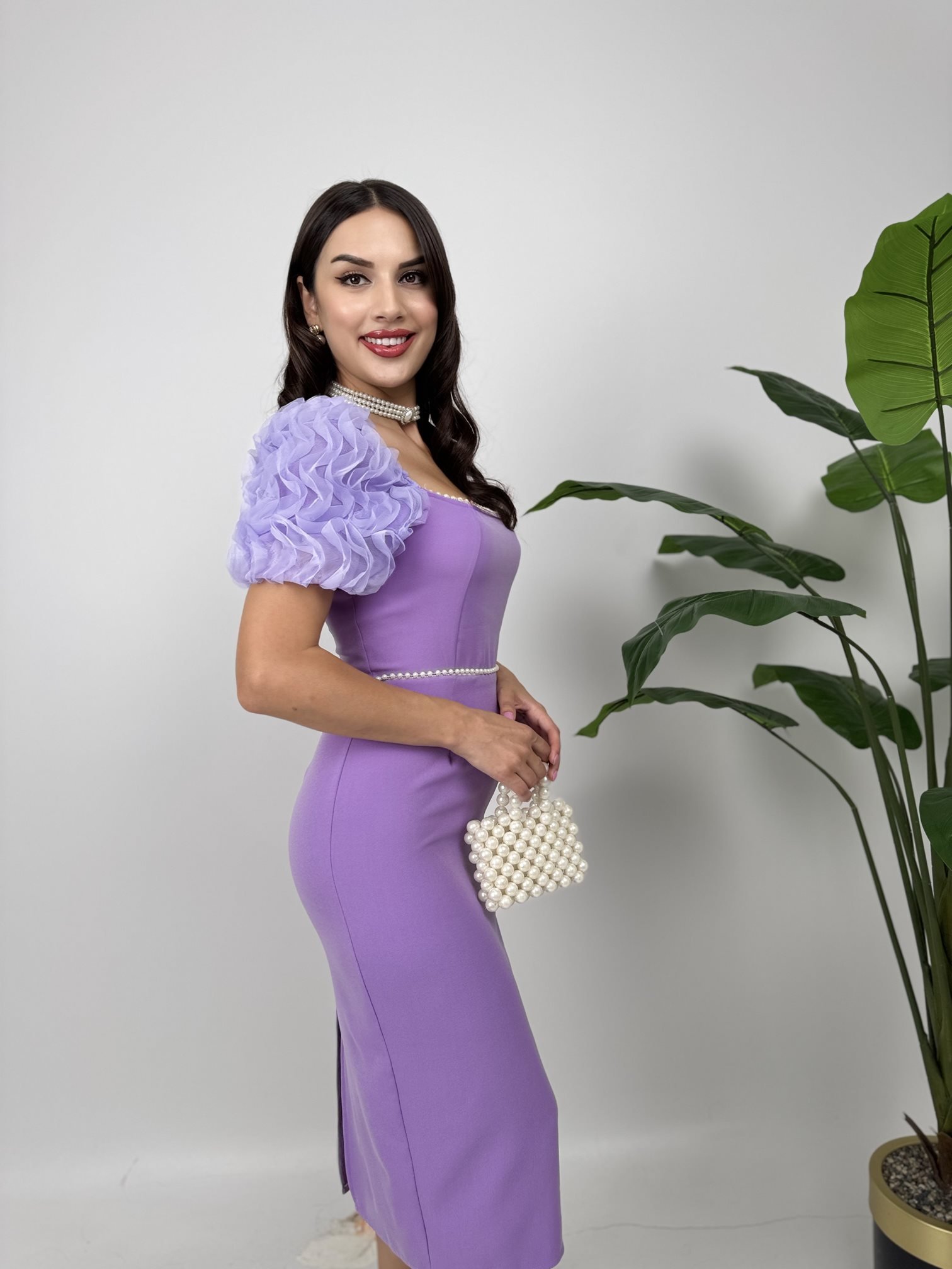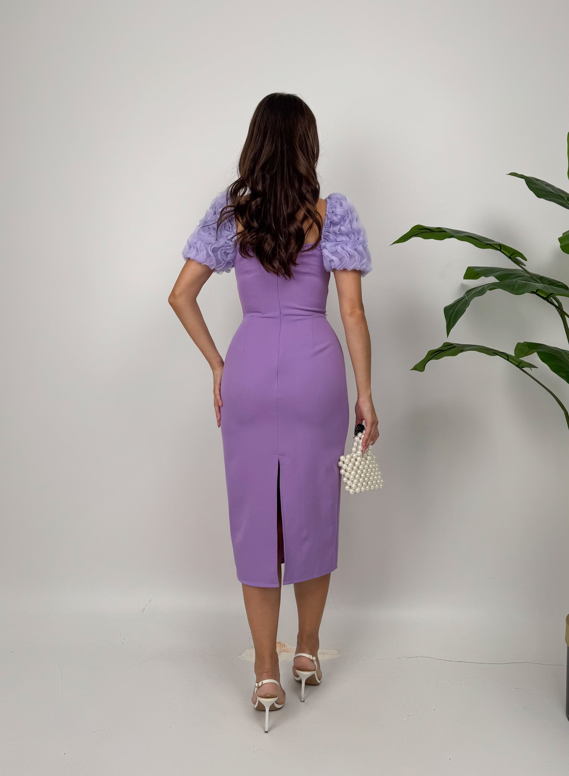 2051 KOLLAR İTHAL KUMAŞ İNCİ DEYAT ELBİSE LİLAC - LİLA