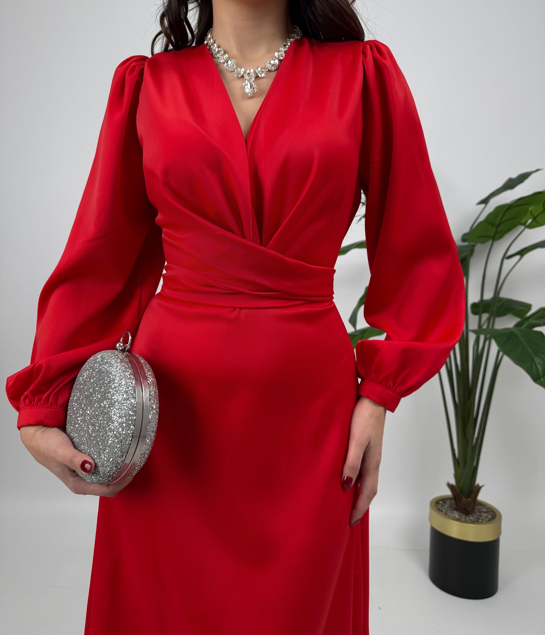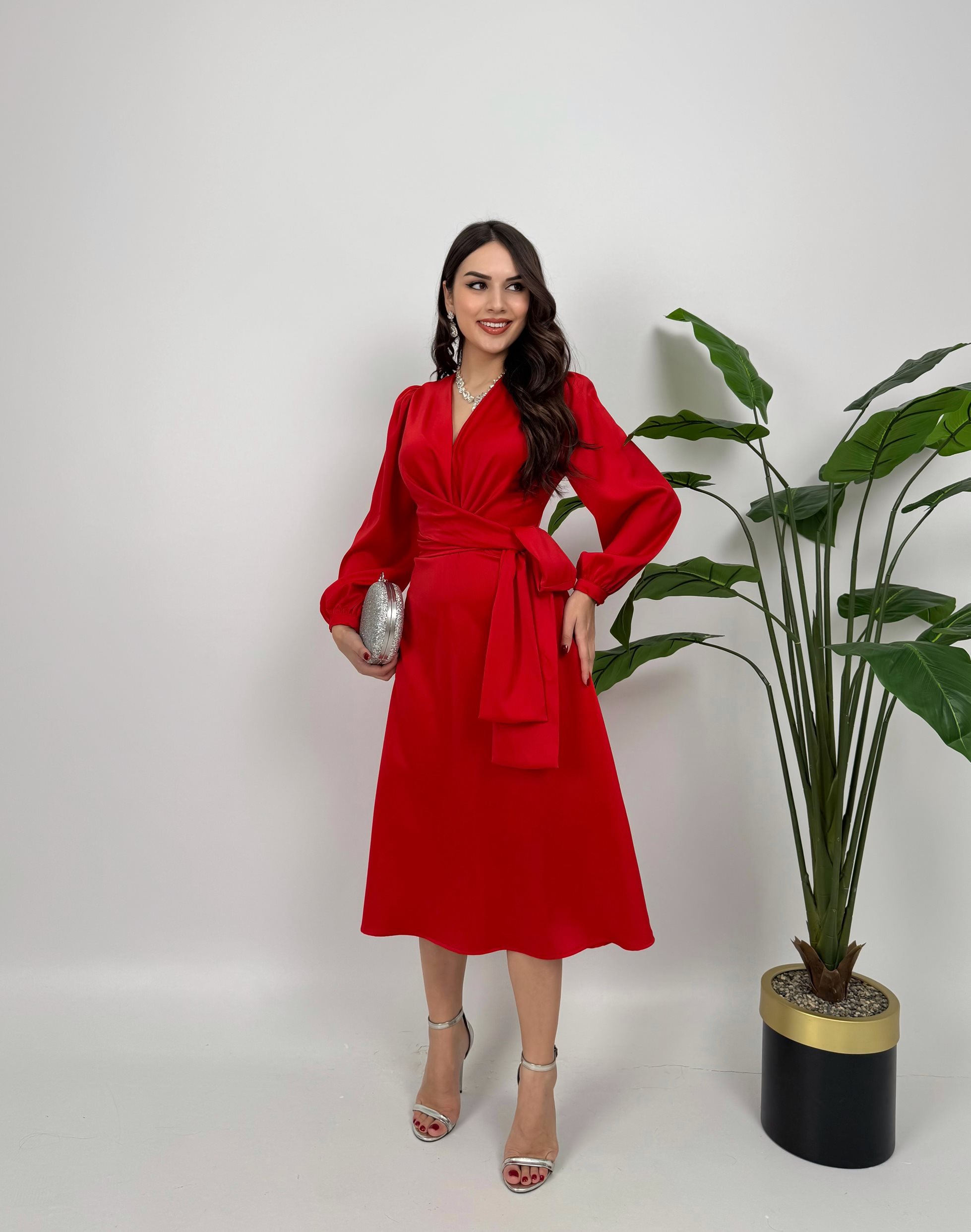 2052 SATEN KUŞAKLI ELBİSE RED - KIRMIZI