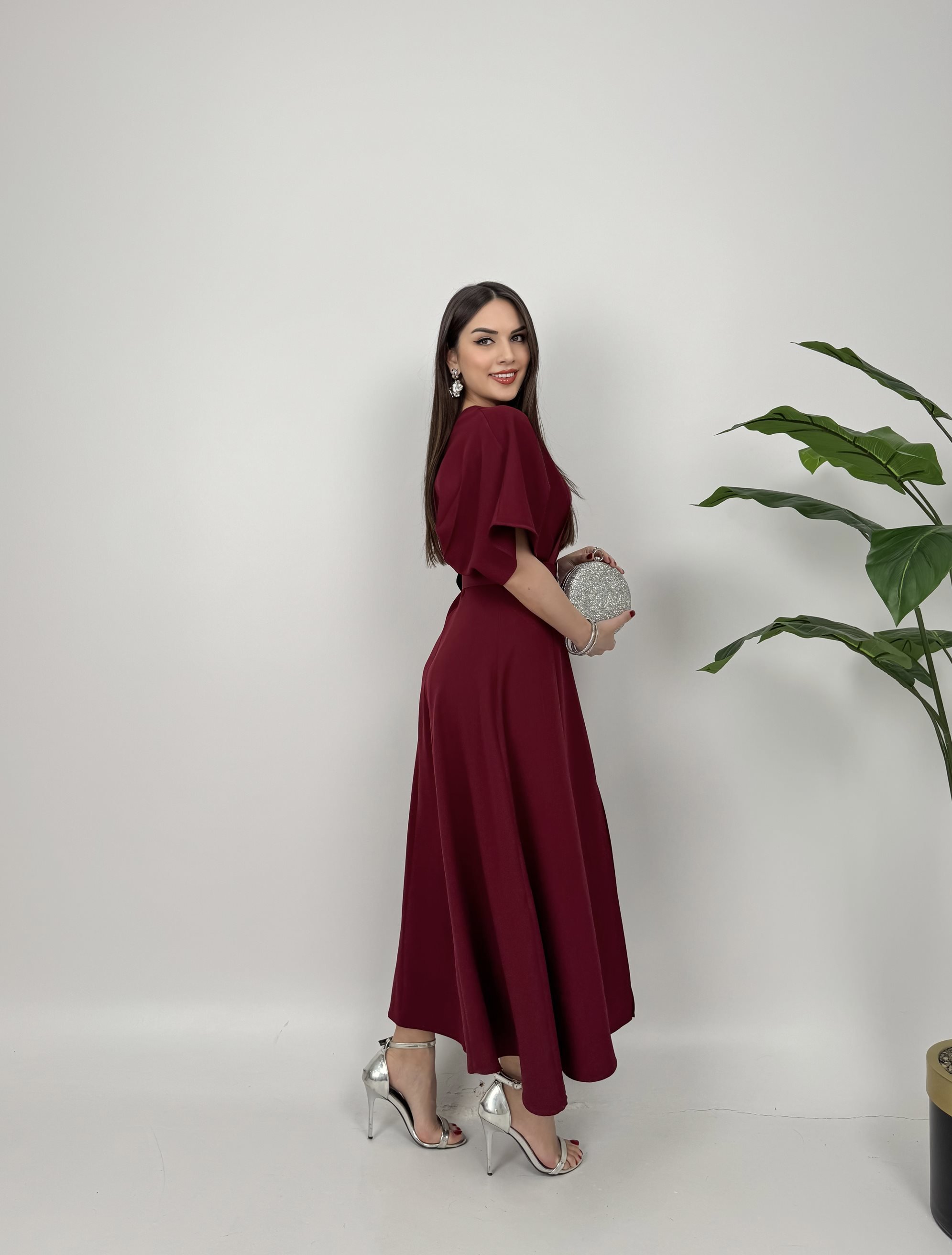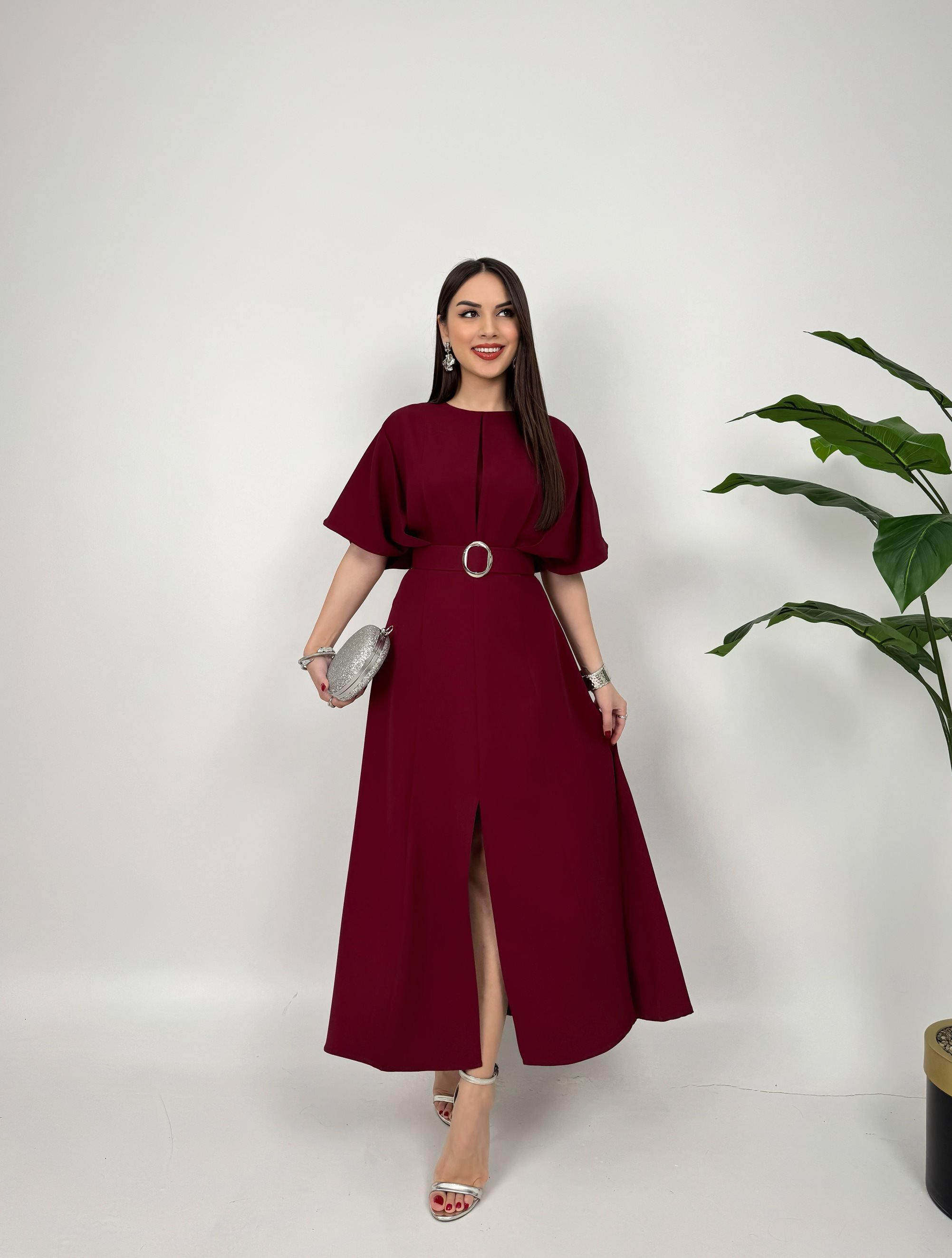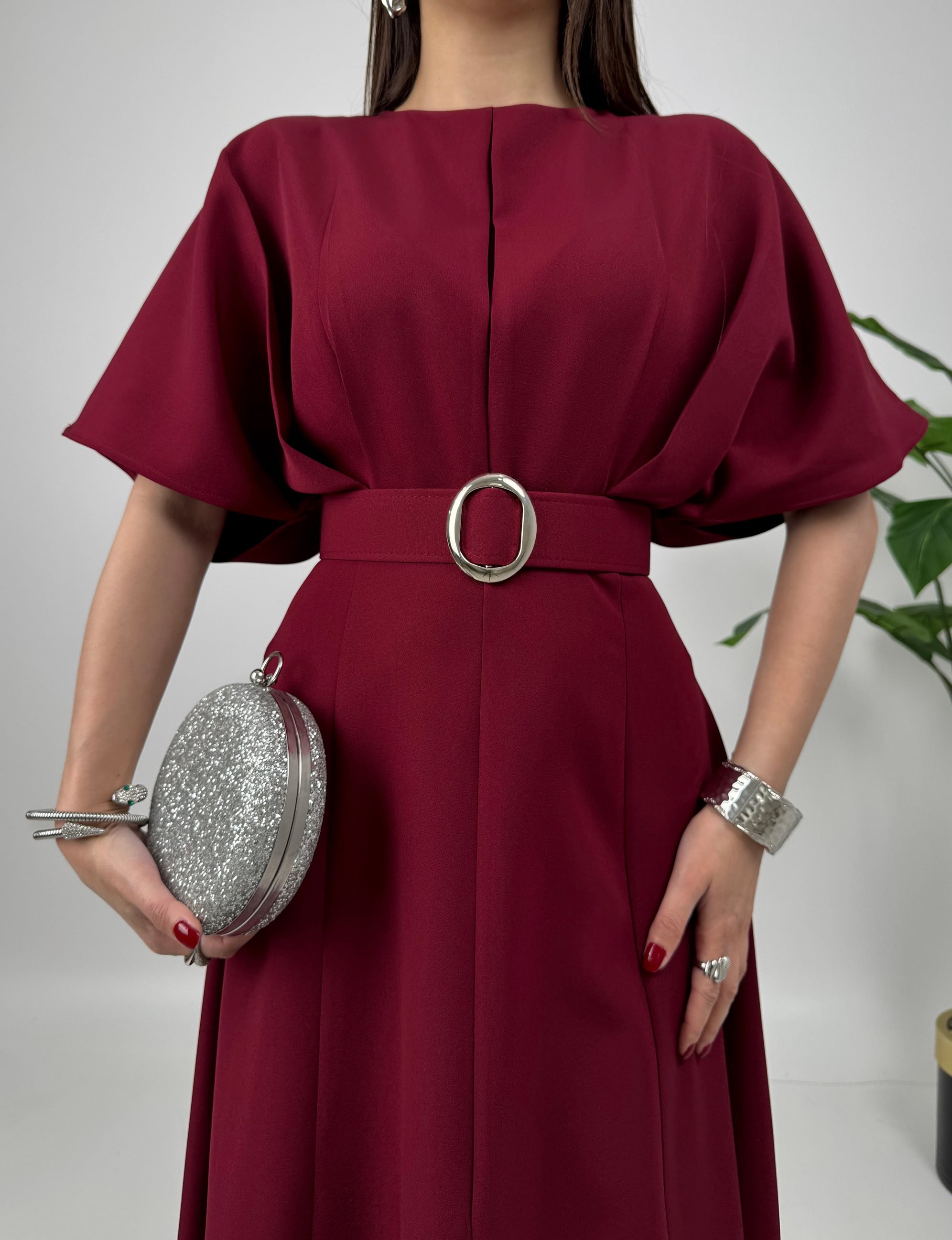 2056 ATLAS KUMAŞ KEMERLİ ELBİSE BURGUNDY - BORDO