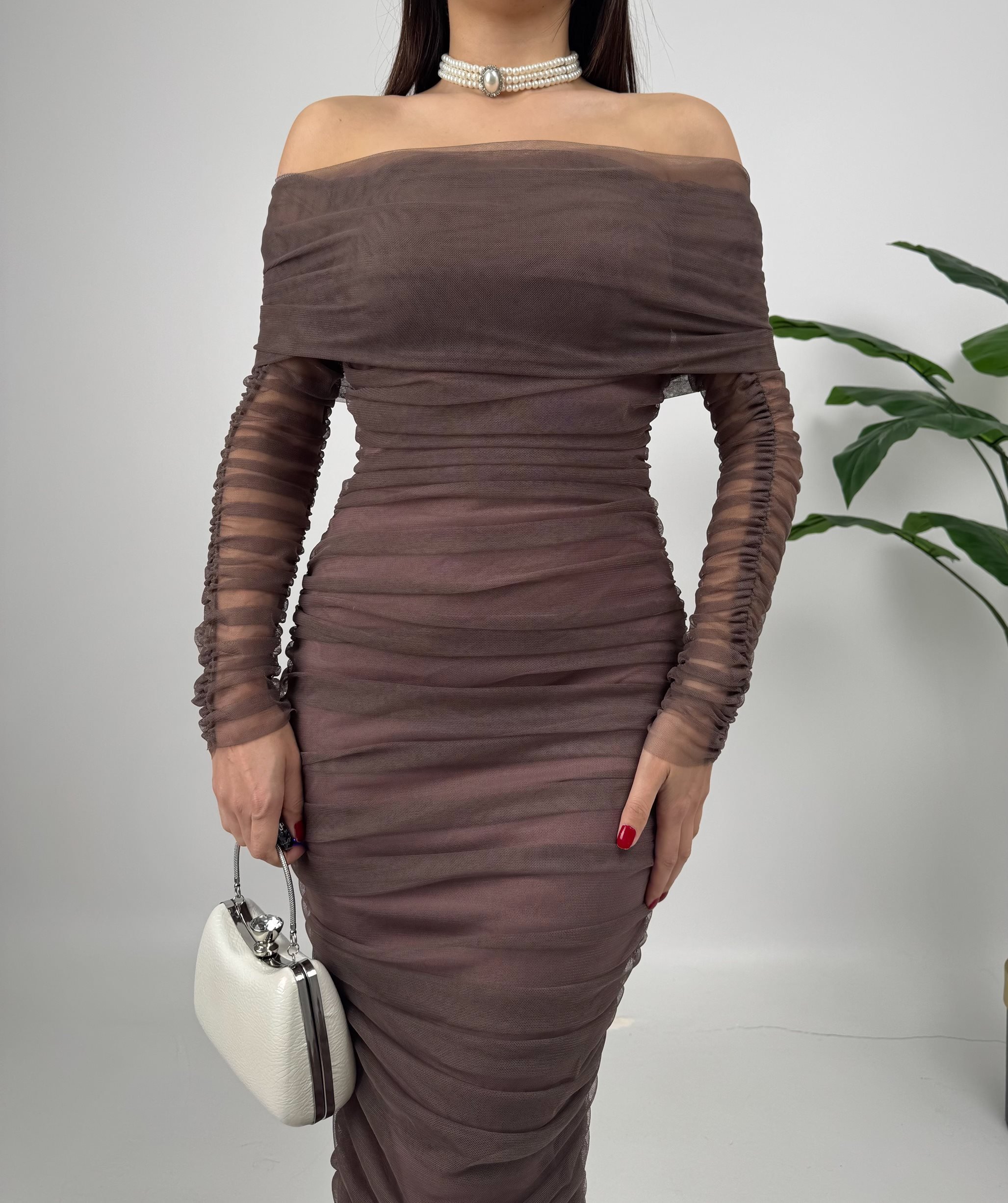2067 STRAPLEZ BÜZGÜLÜ UZUN KOL TÜL ELBİSE MİNK - VİZON