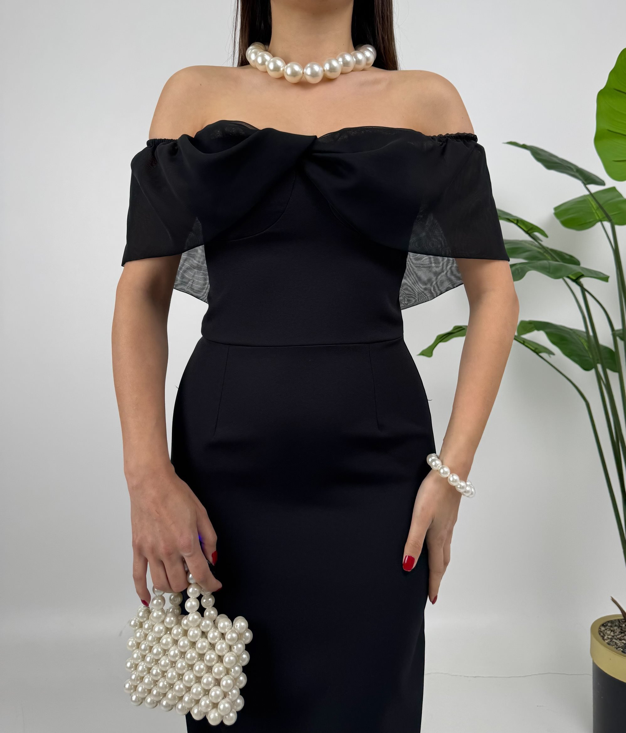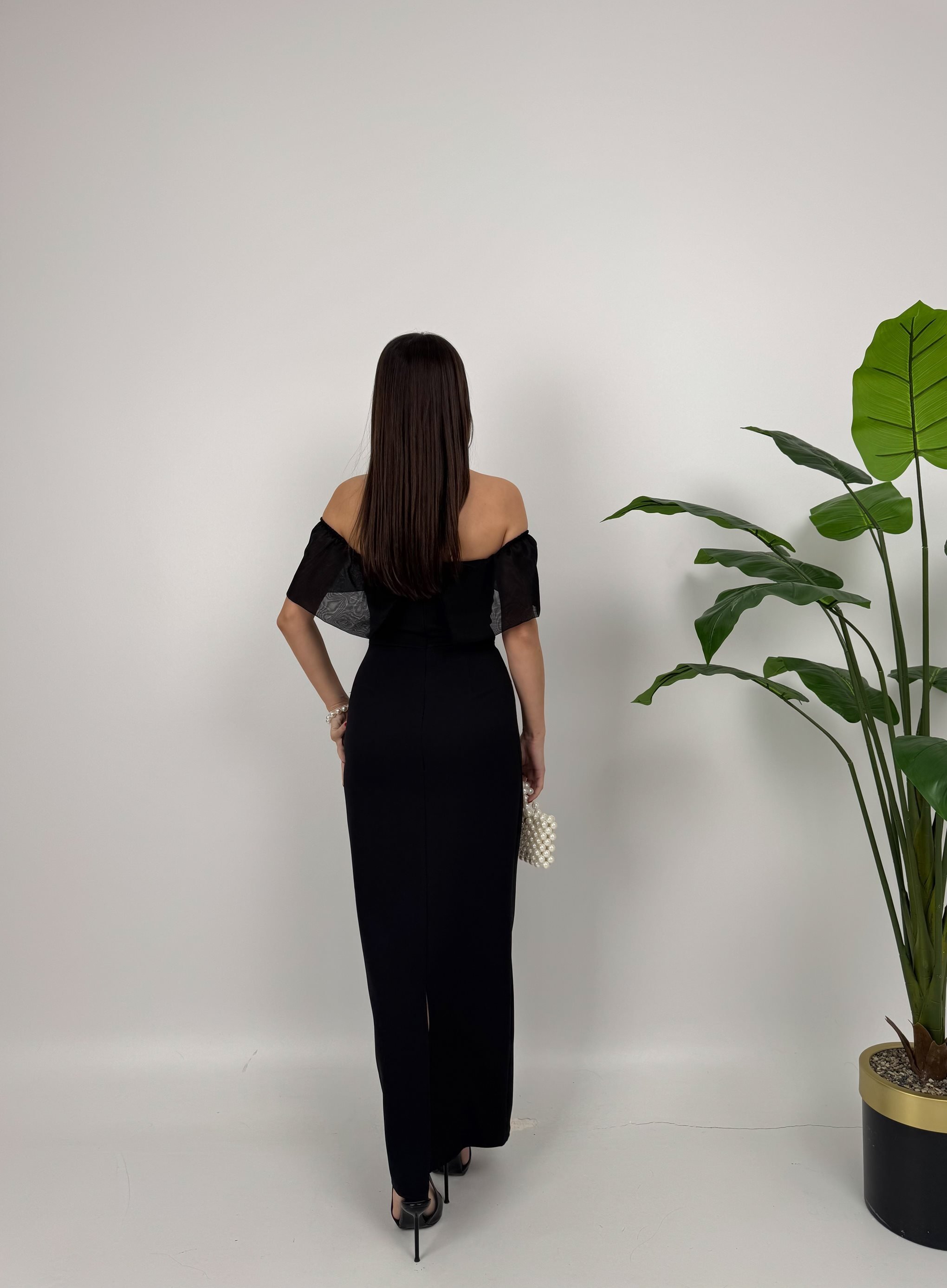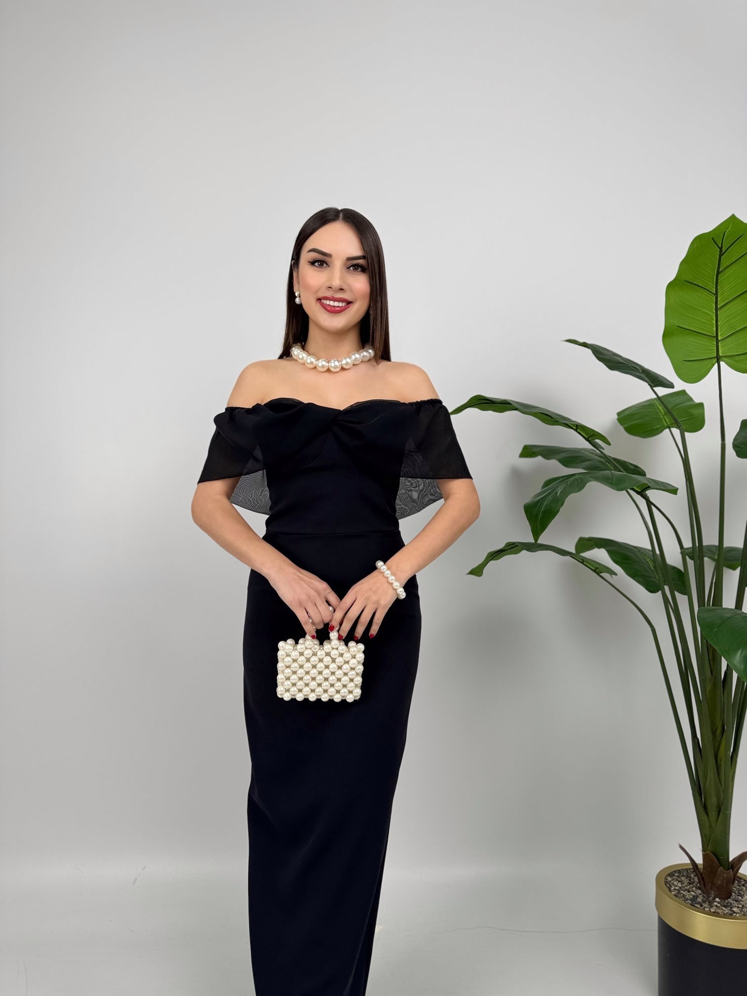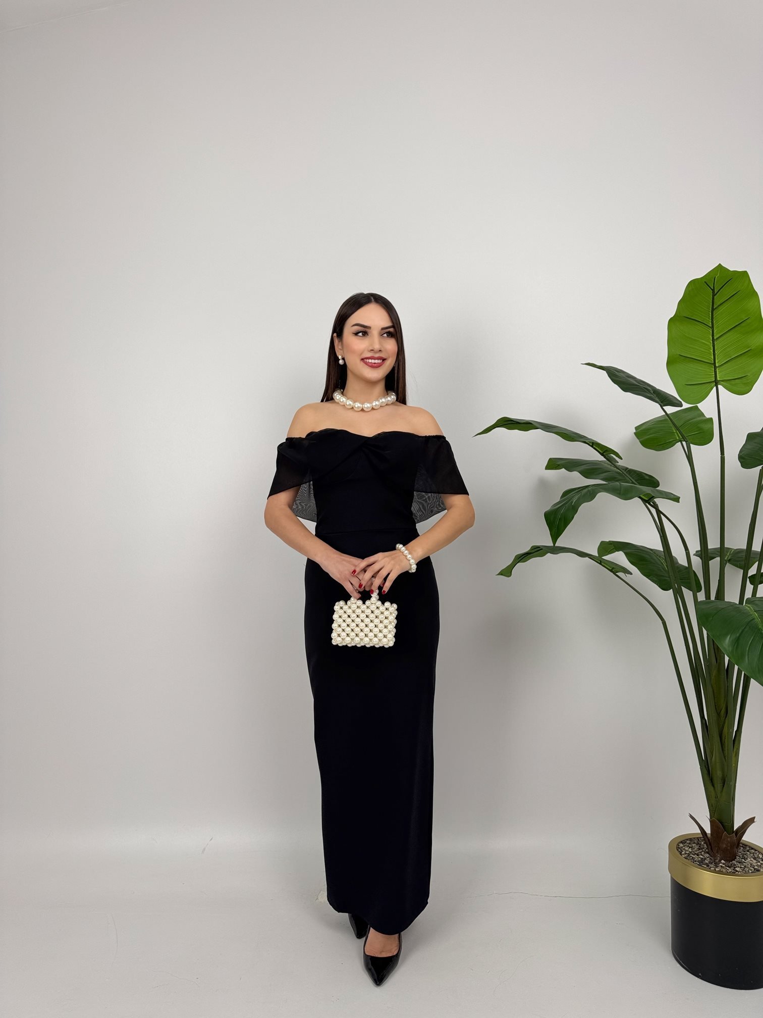 2091 STRAPLEZ ŞİFON GARNİLİ ATLAS GLOPLU ELBİSE BLACK - SİYAH