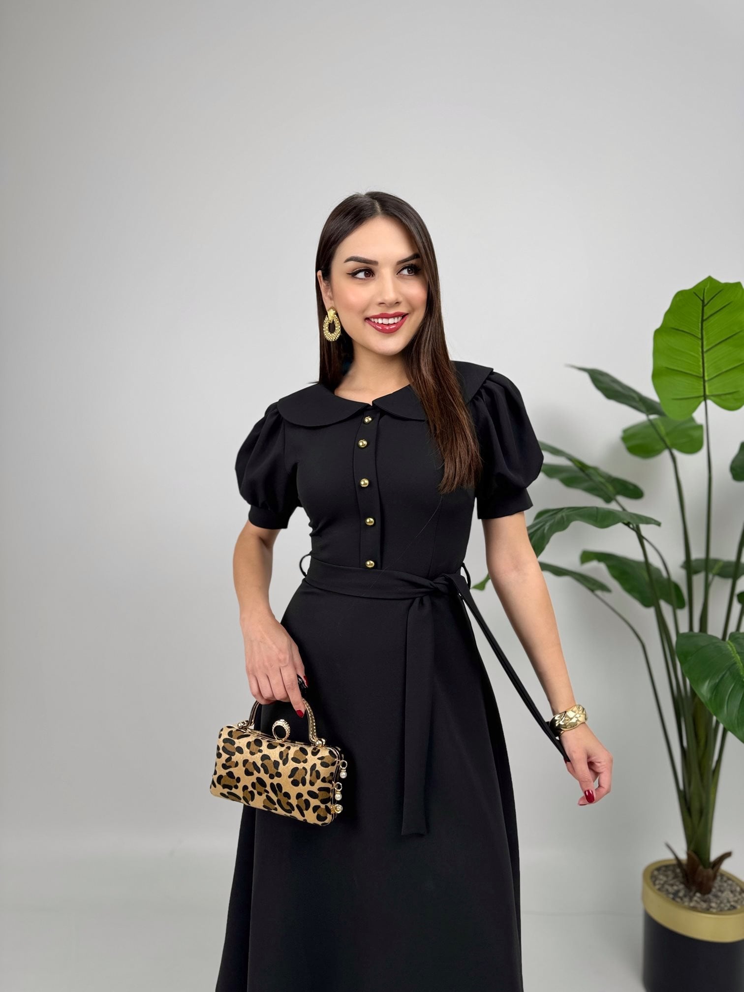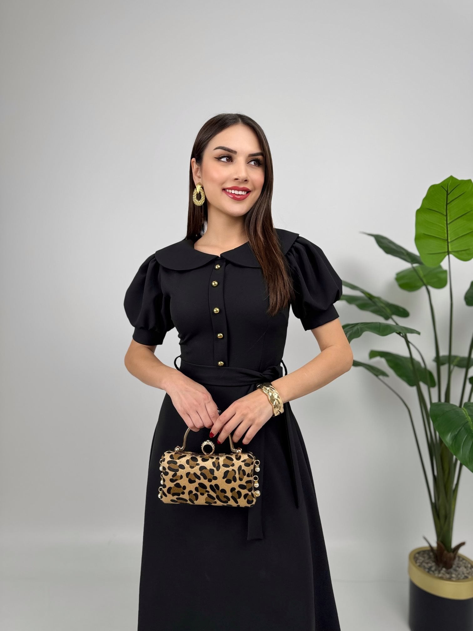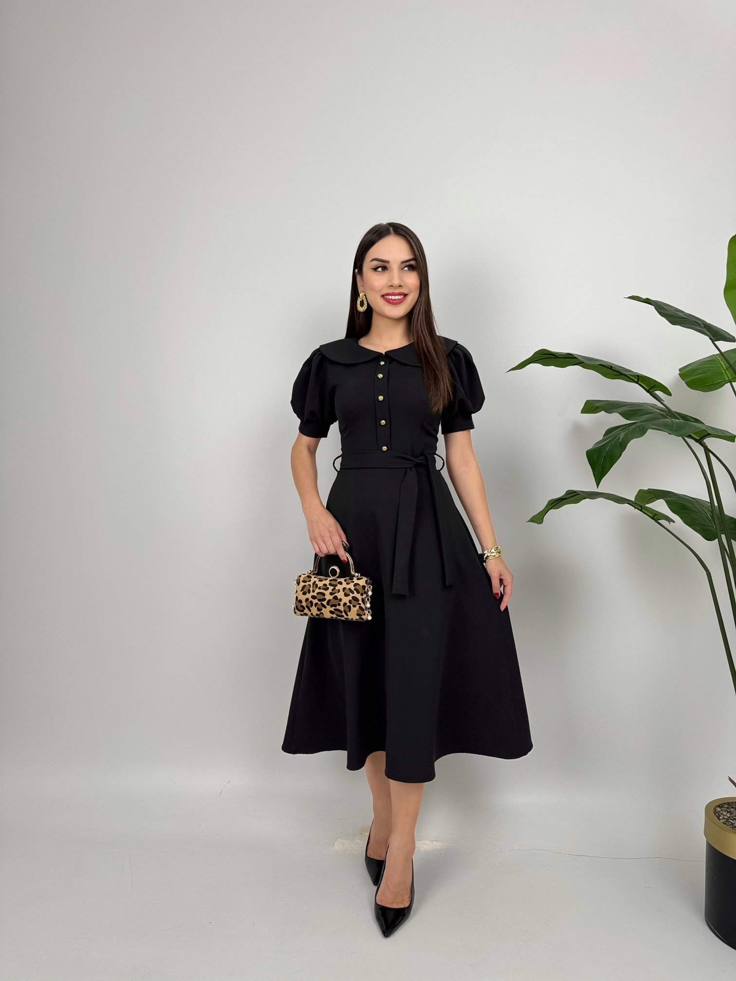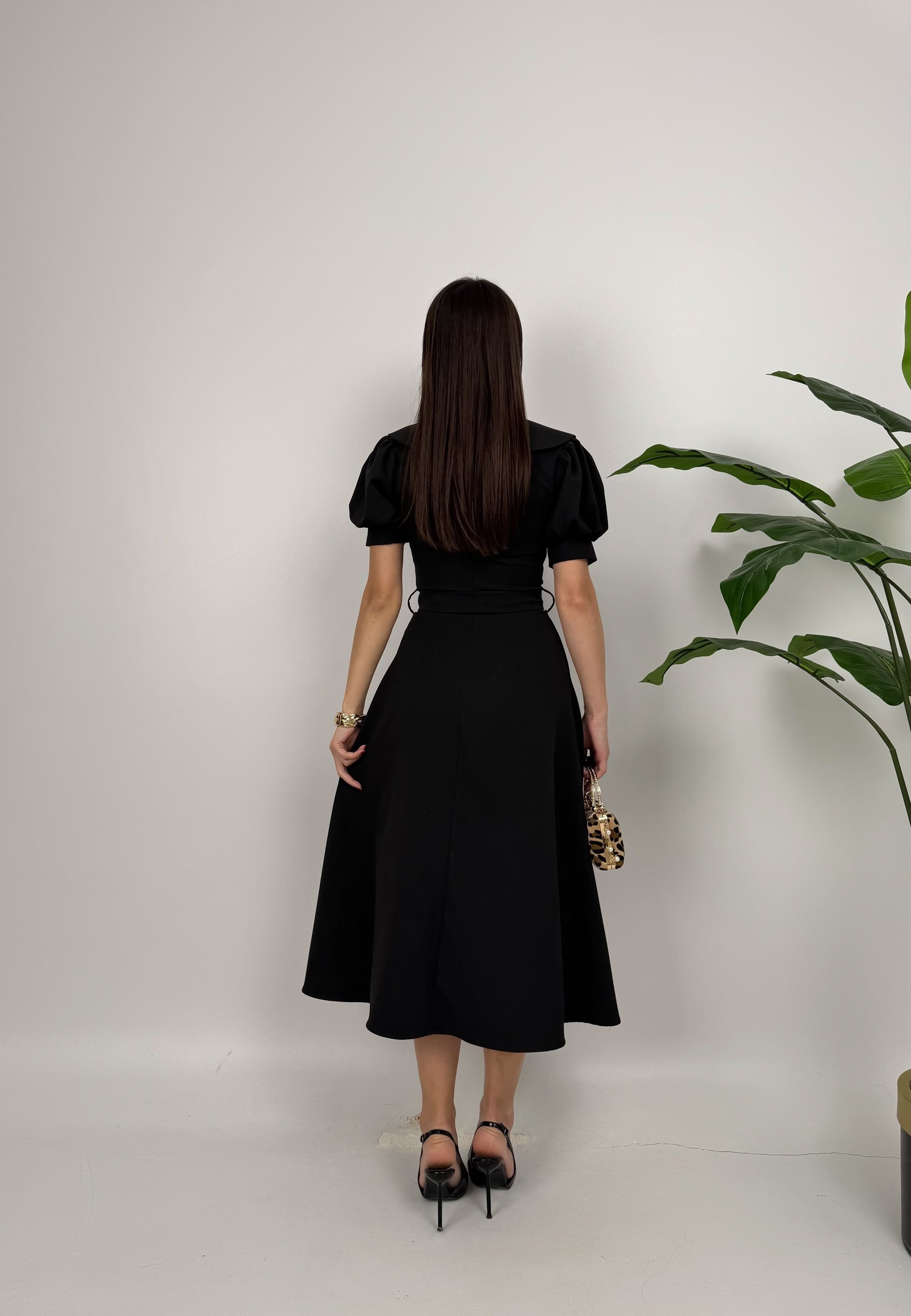 2111 BEBE YAKA KUŞAKLI MİDİ ELBİSE BLACK - SİYAH
