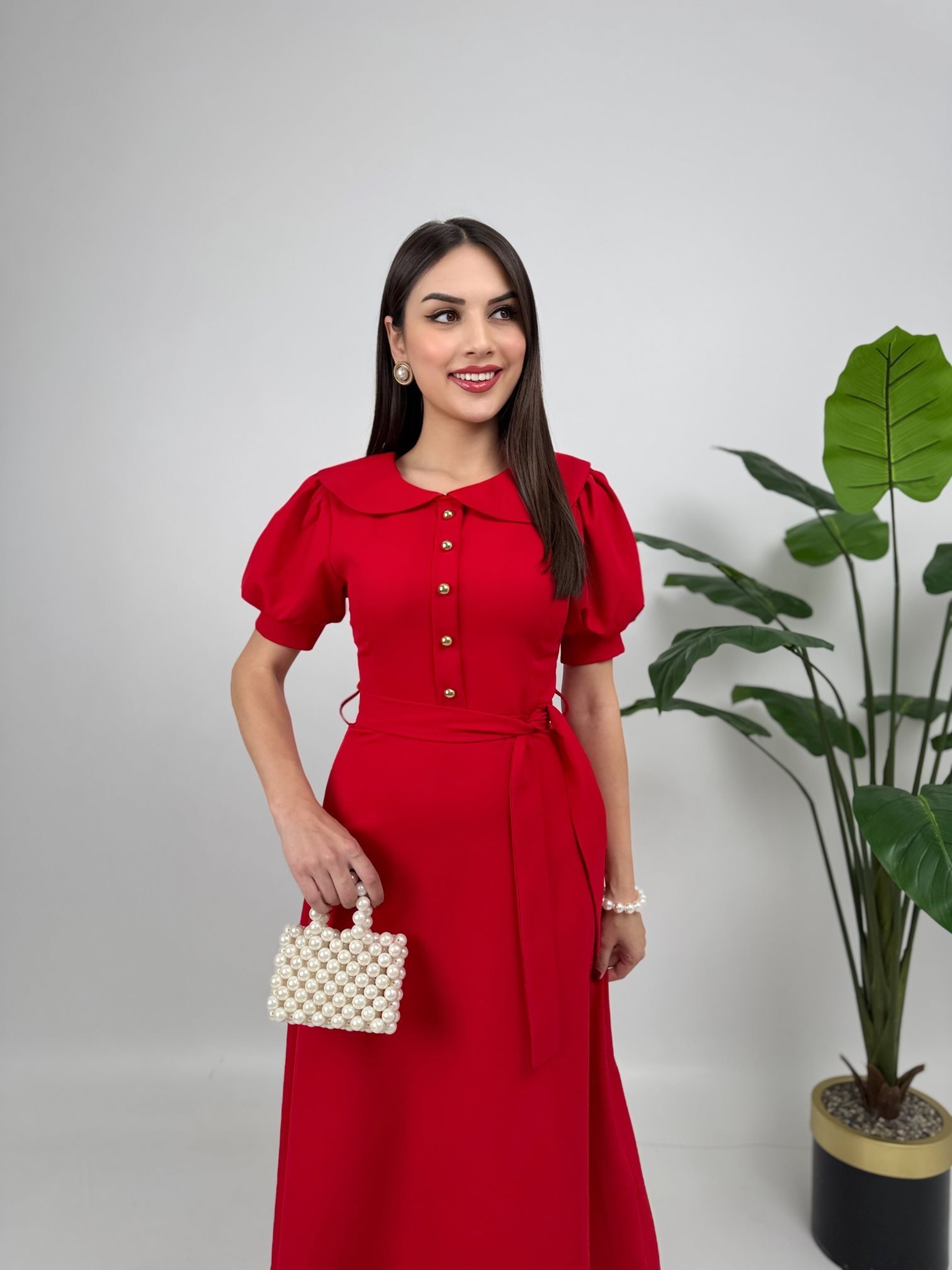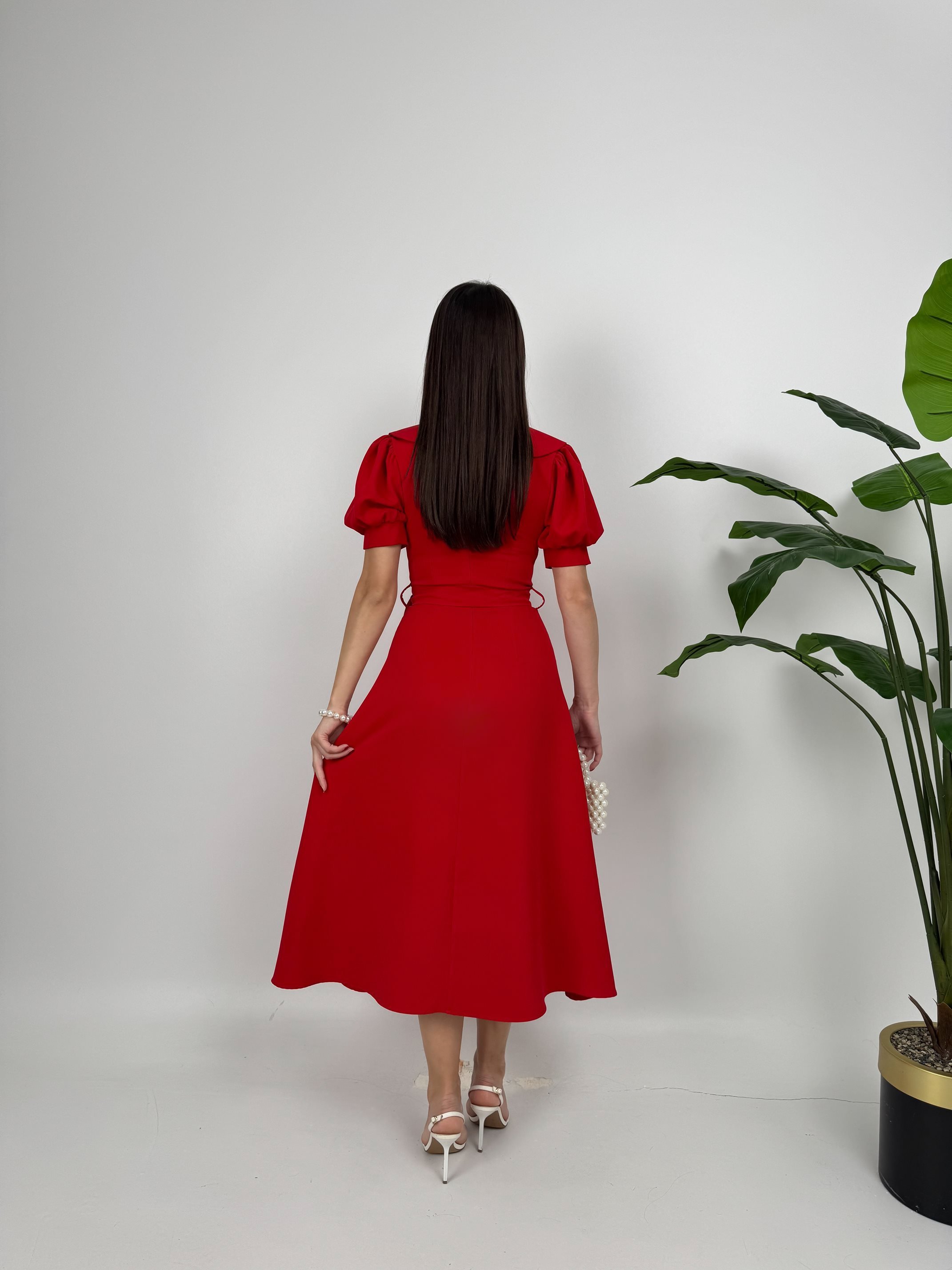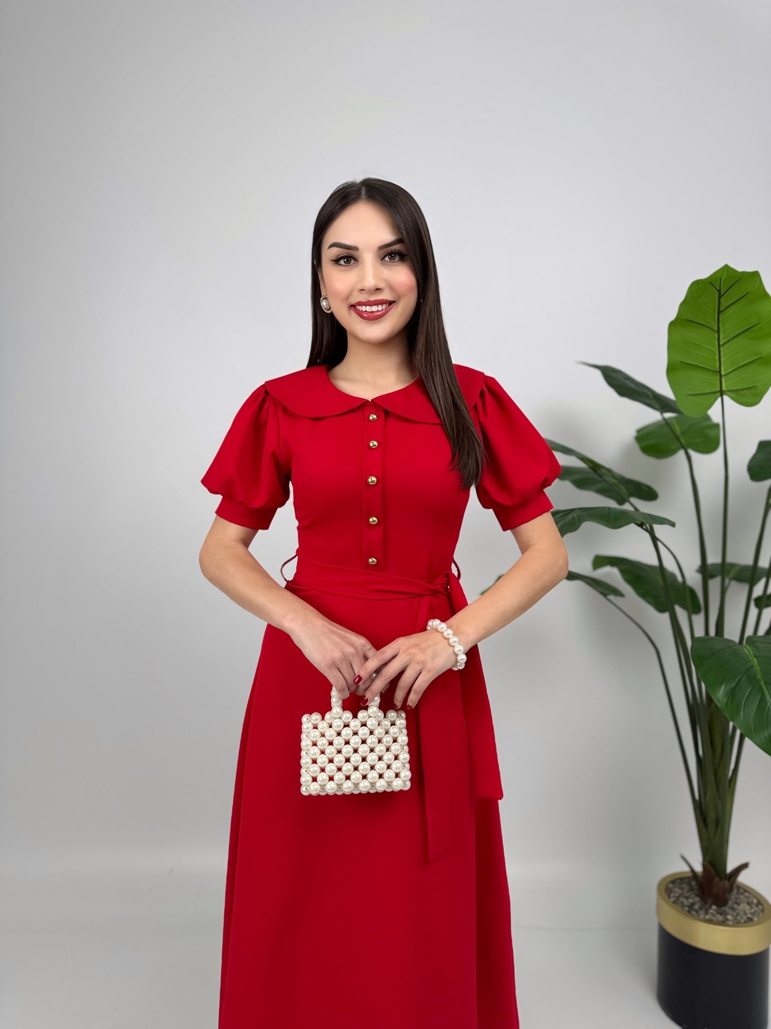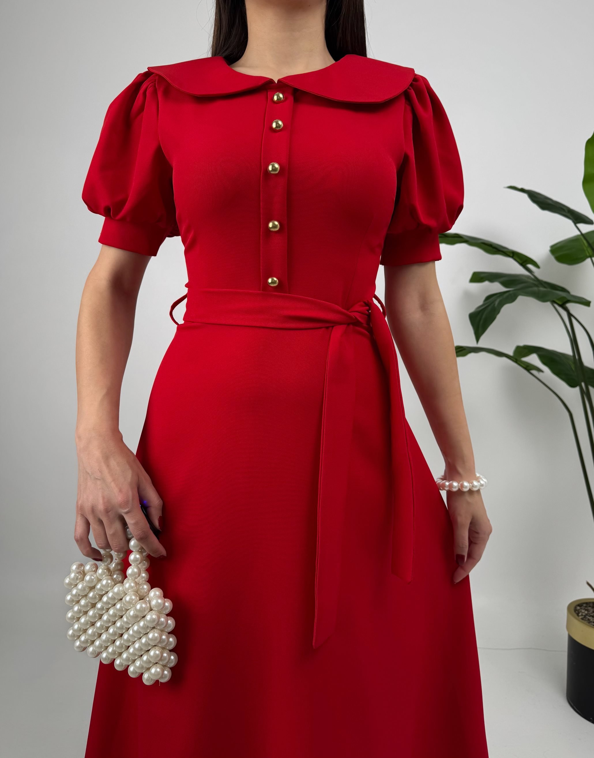 2111 BEBE YAKA KUŞAKLI MİDİ ELBİSE RED - KIRMIZI