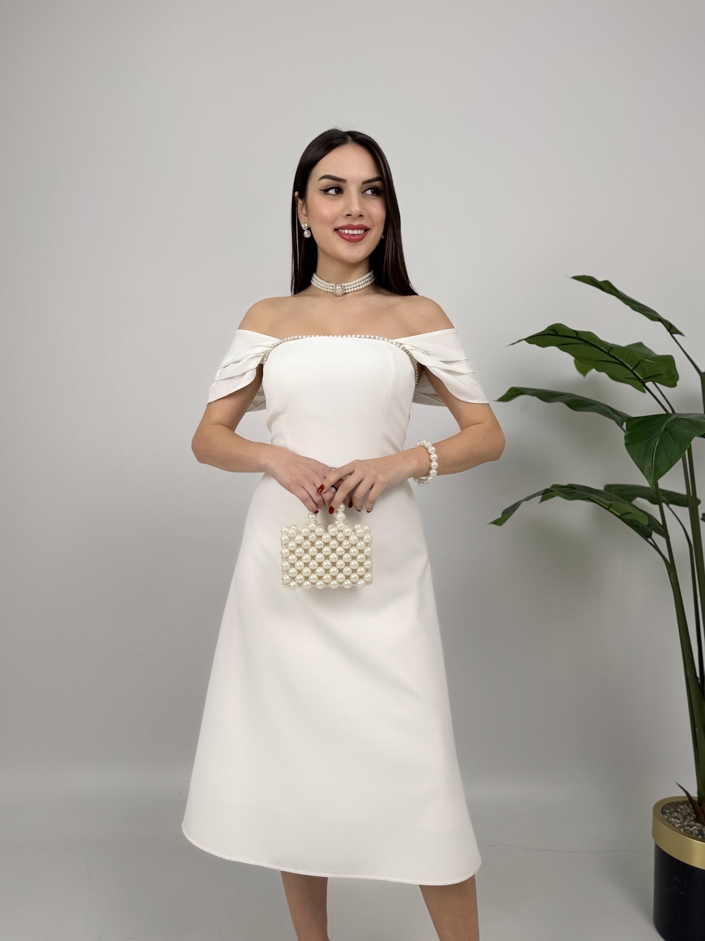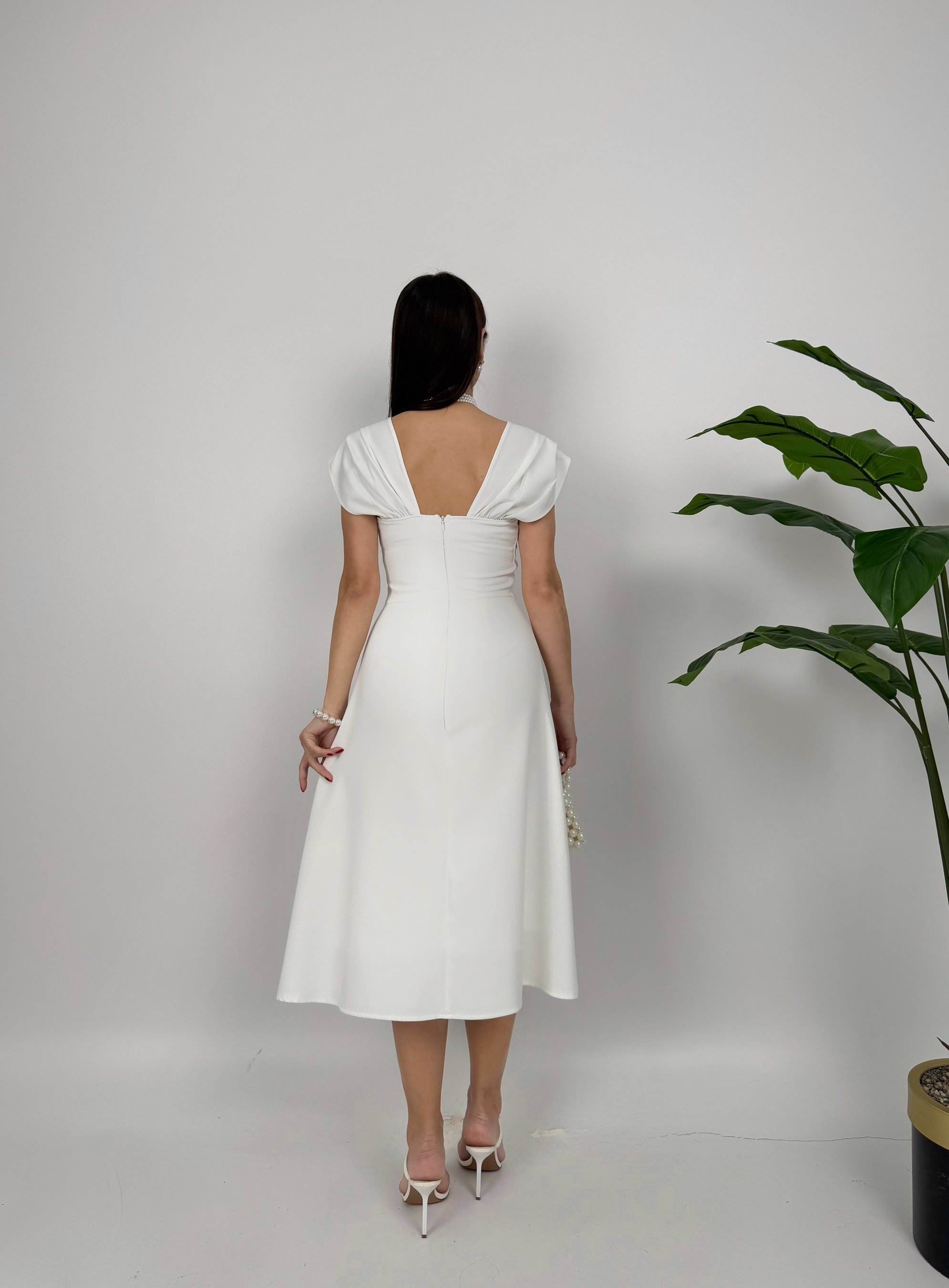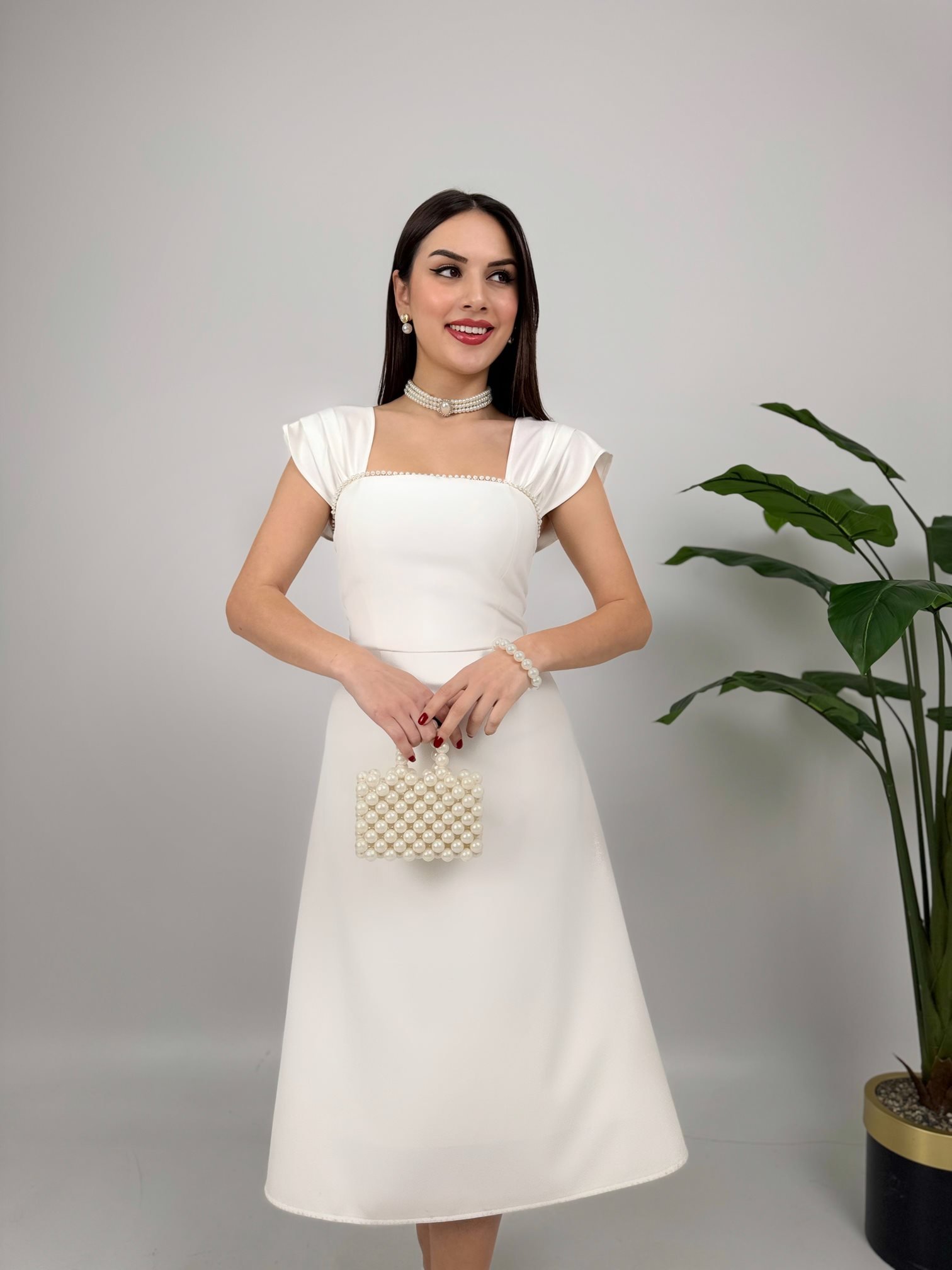 2117 GÖĞÜSÜ ŞERİT İNCİ DETAY ELBİSE WHİTE - BEYAZ