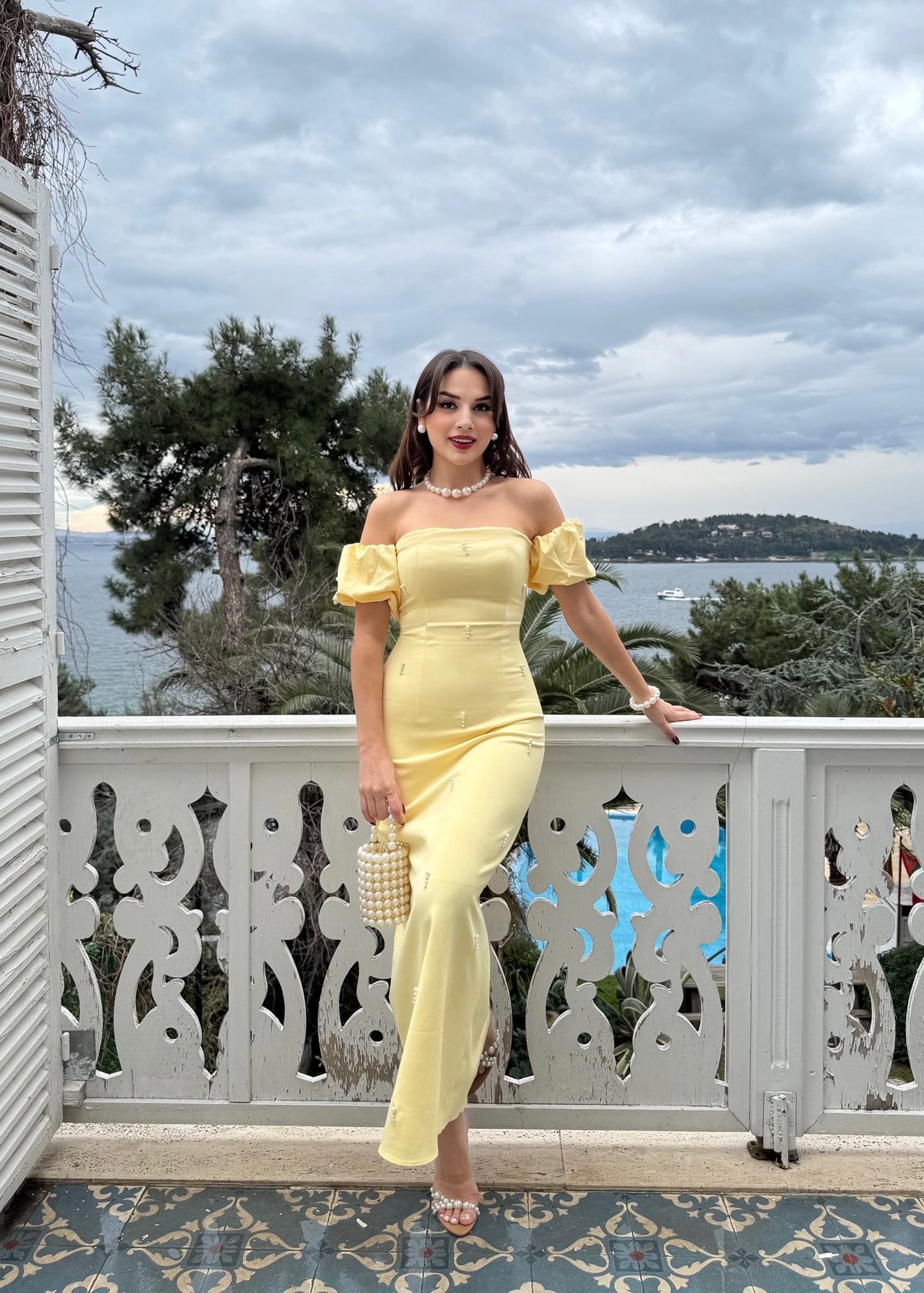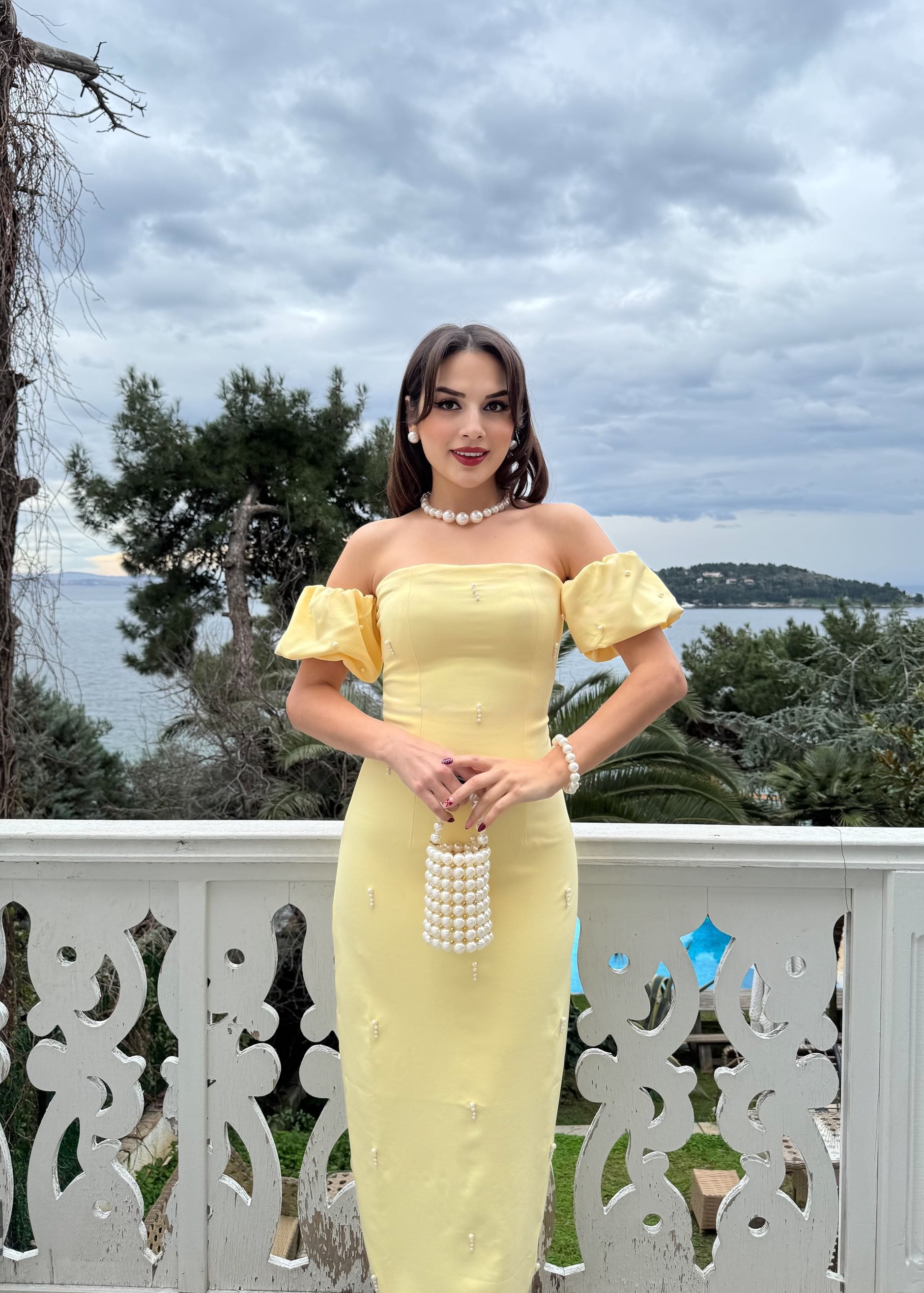 2125 ÖNLER İNCİ DETAY TASARIM ELBİSE YELLOW - SARI