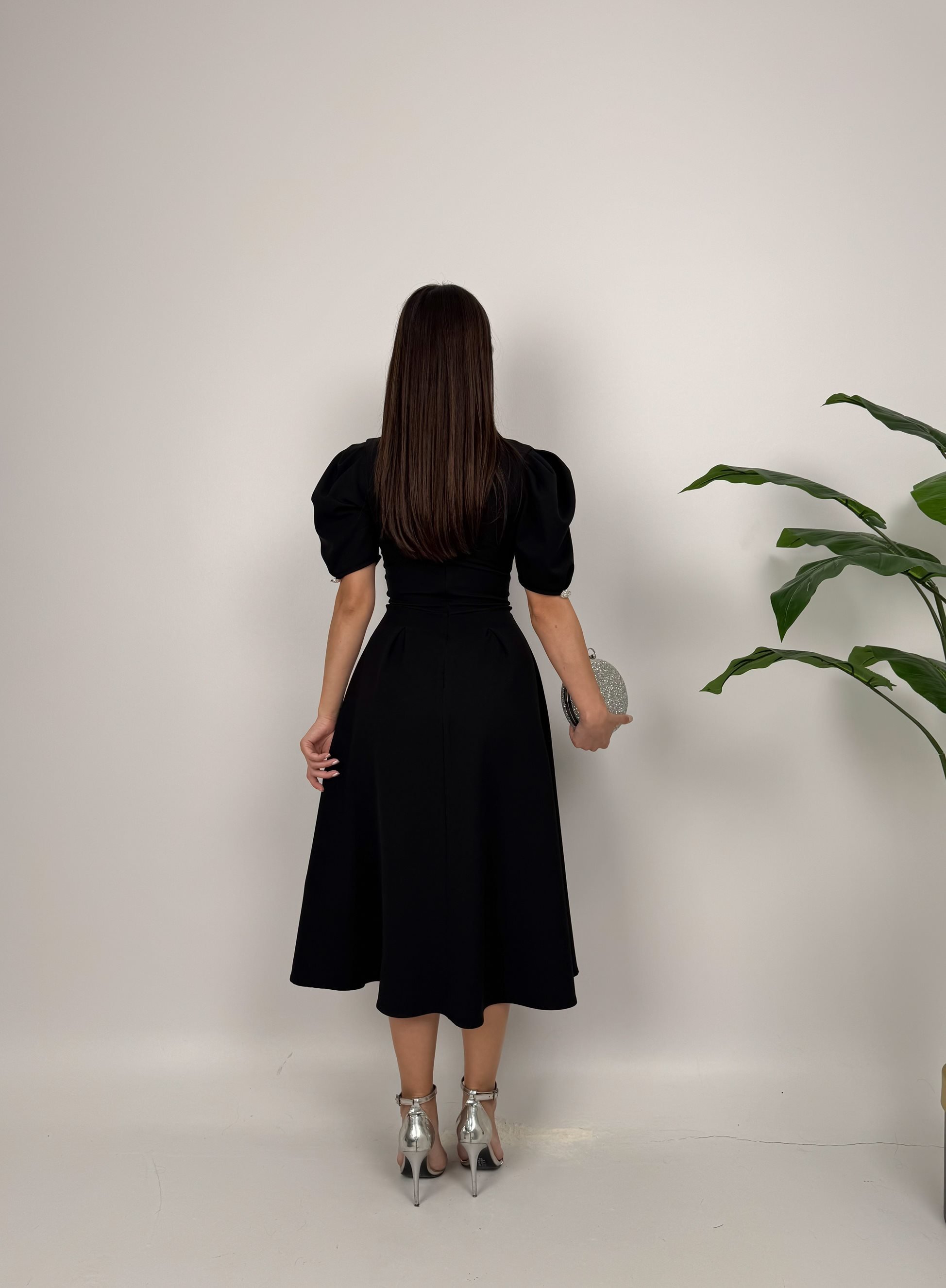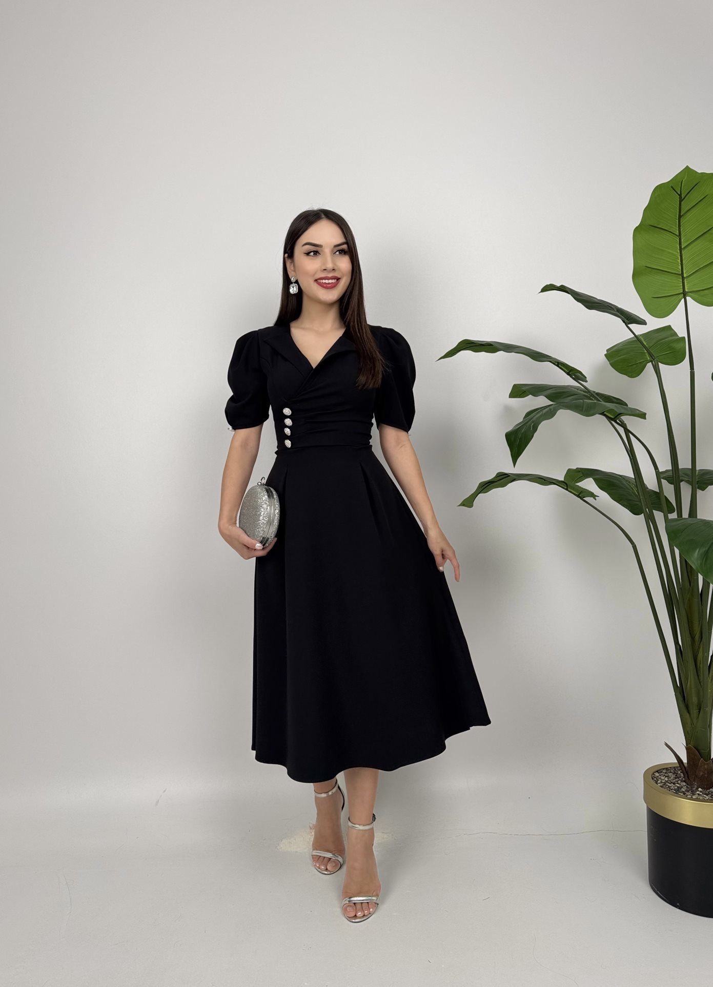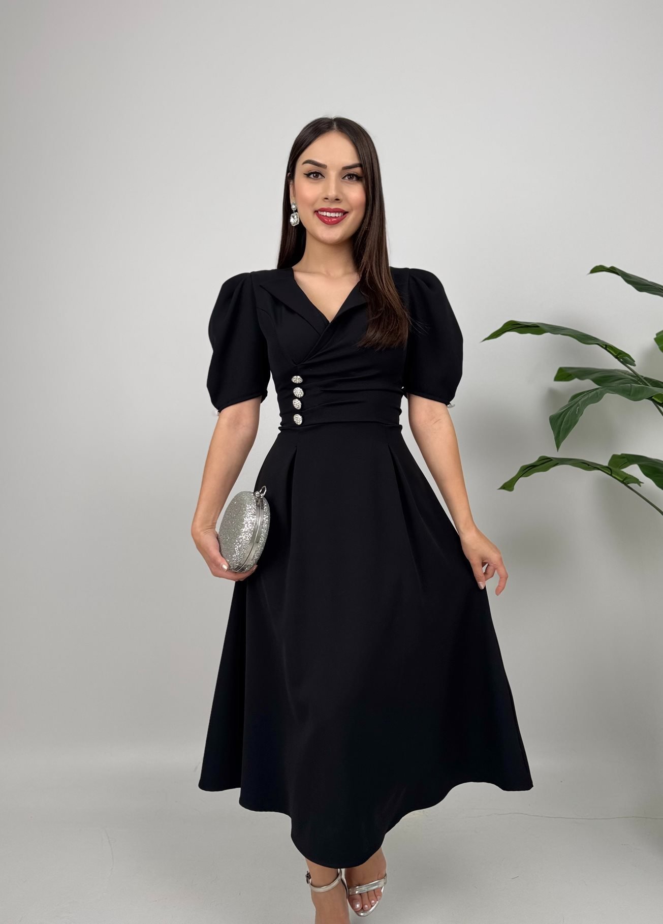 2130 CEKET YAKA BALON KOL DÜĞME DETAY ATLAS ELBİSE BLACK - SİYAH