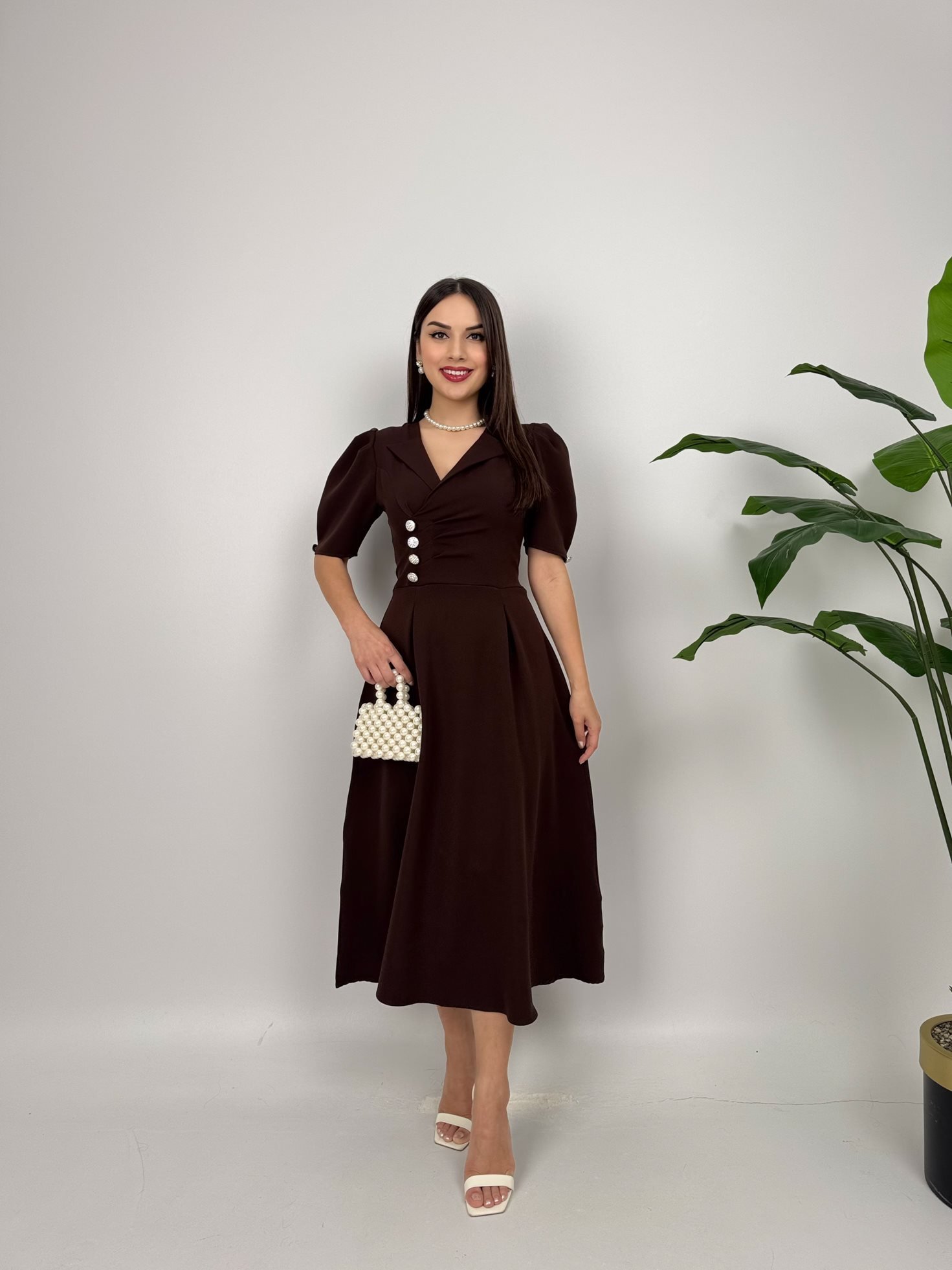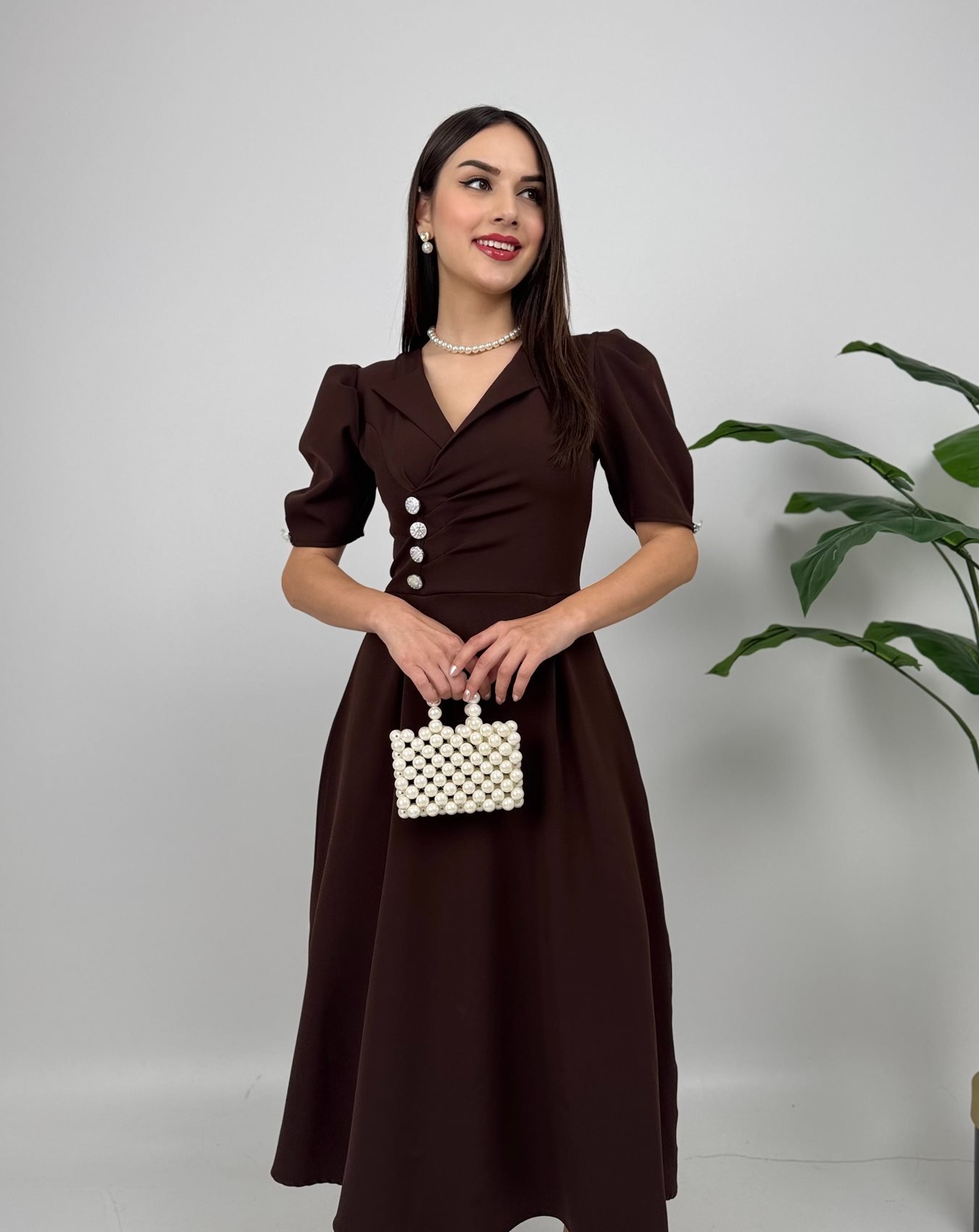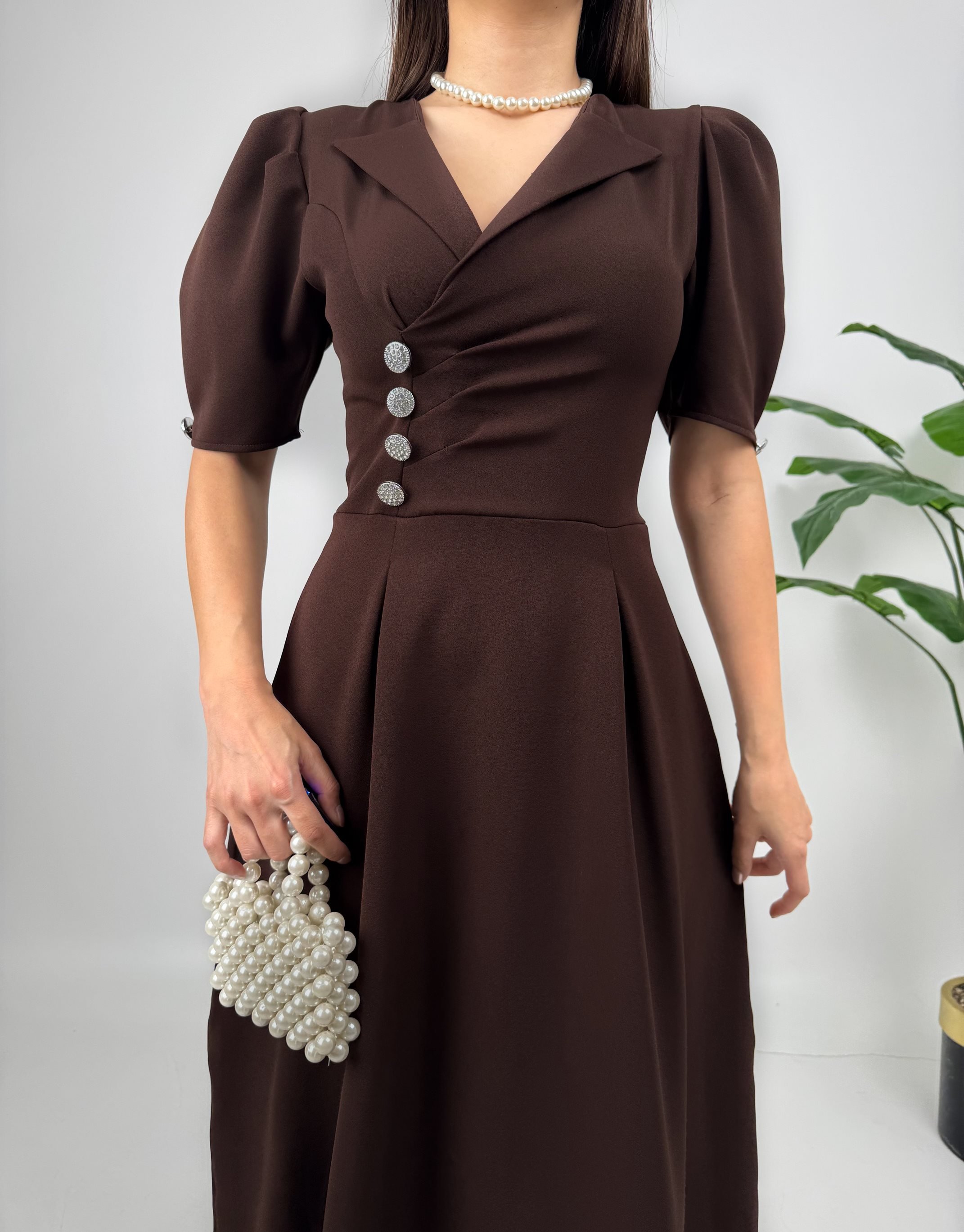 2130 CEKET YAKA BALON KOL DÜĞME DETAY ATLAS ELBİSE BROWN - KAHVE