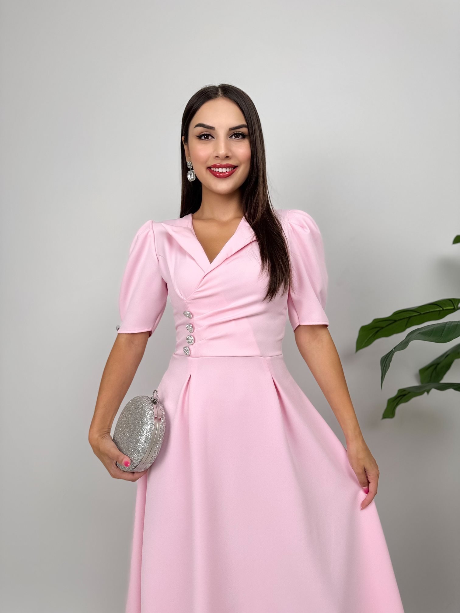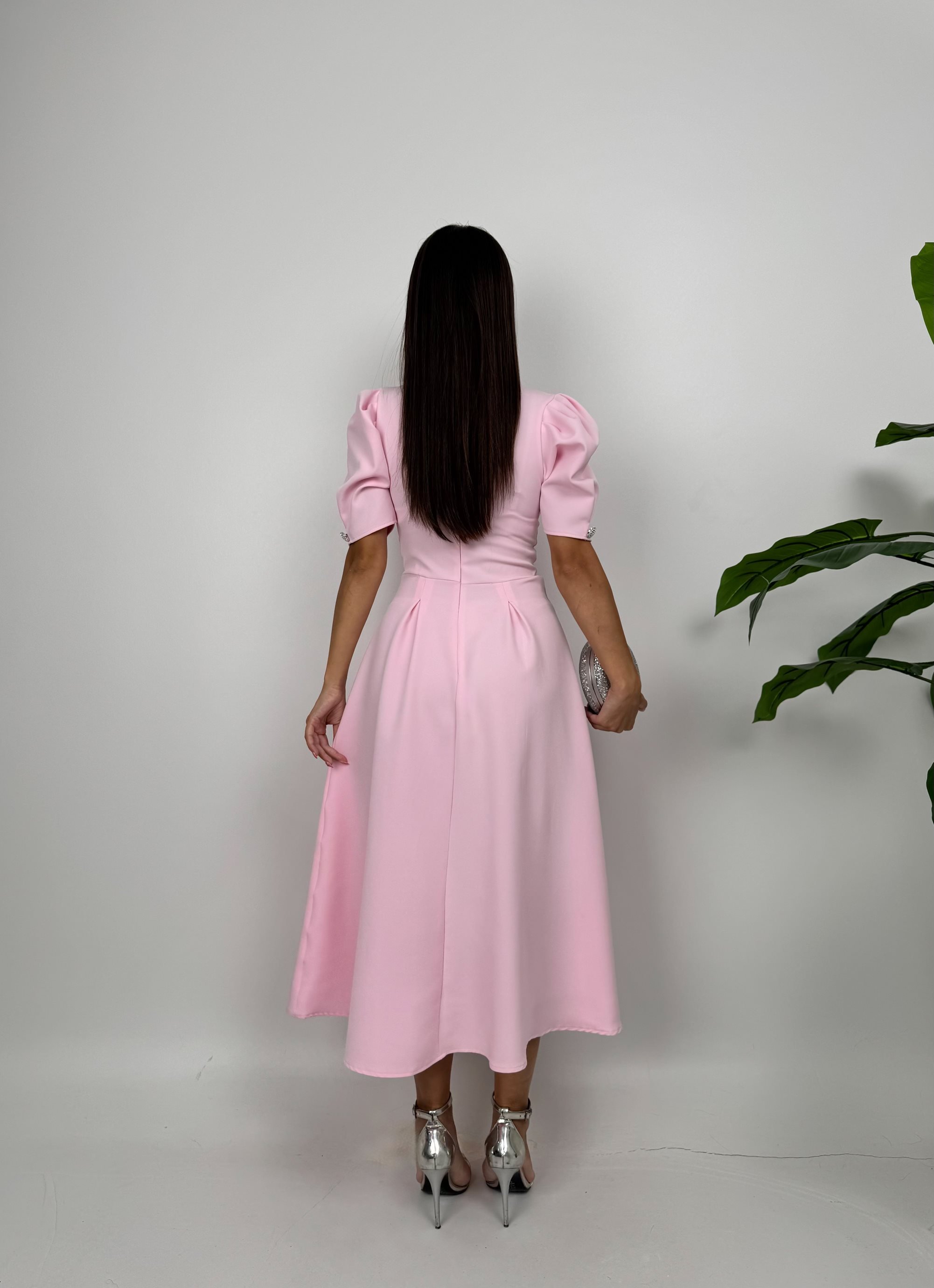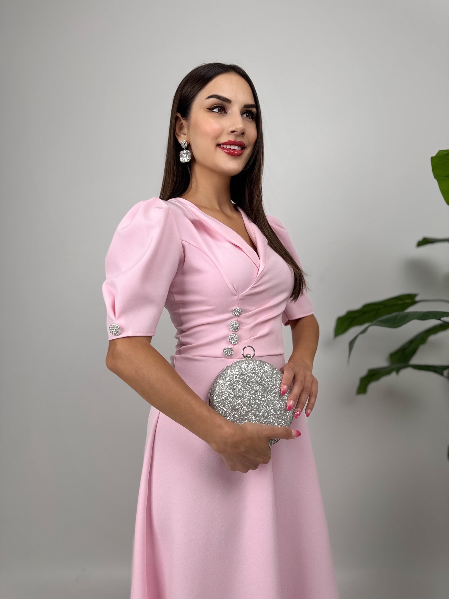 2130 CEKET YAKA BALON KOL DÜĞME DETAY ATLAS ELBİSE PİNK - PEMBE