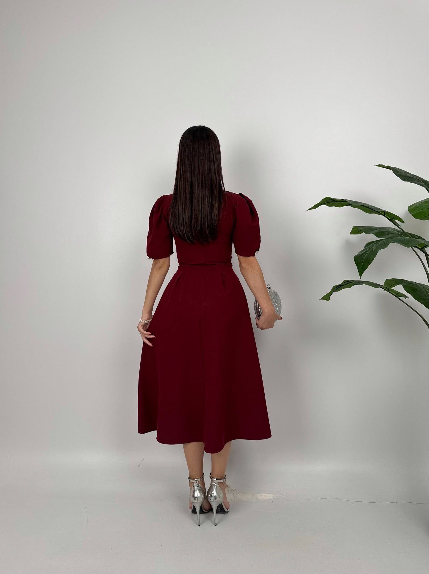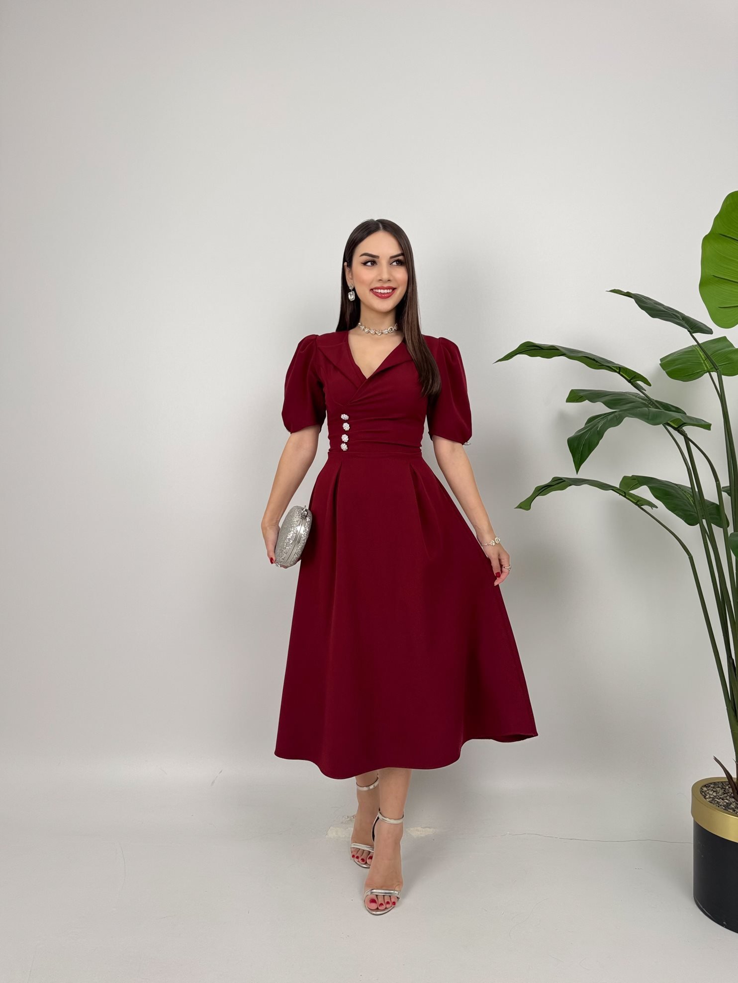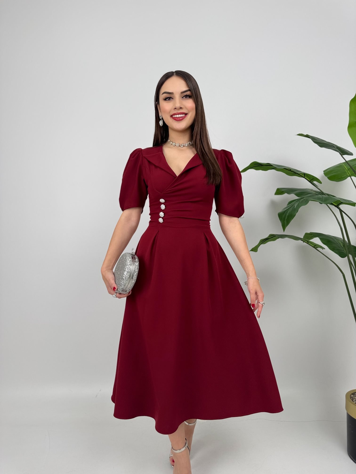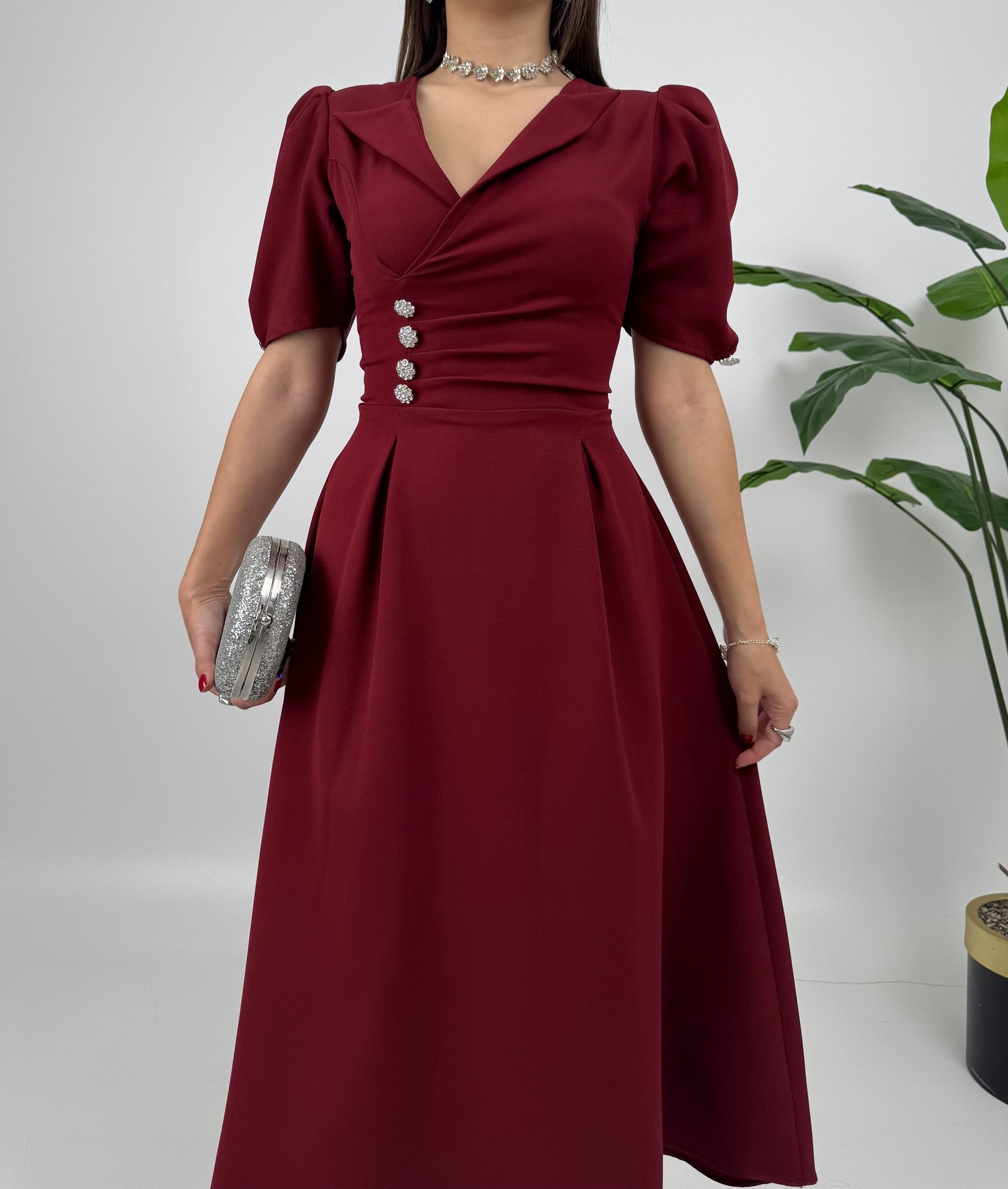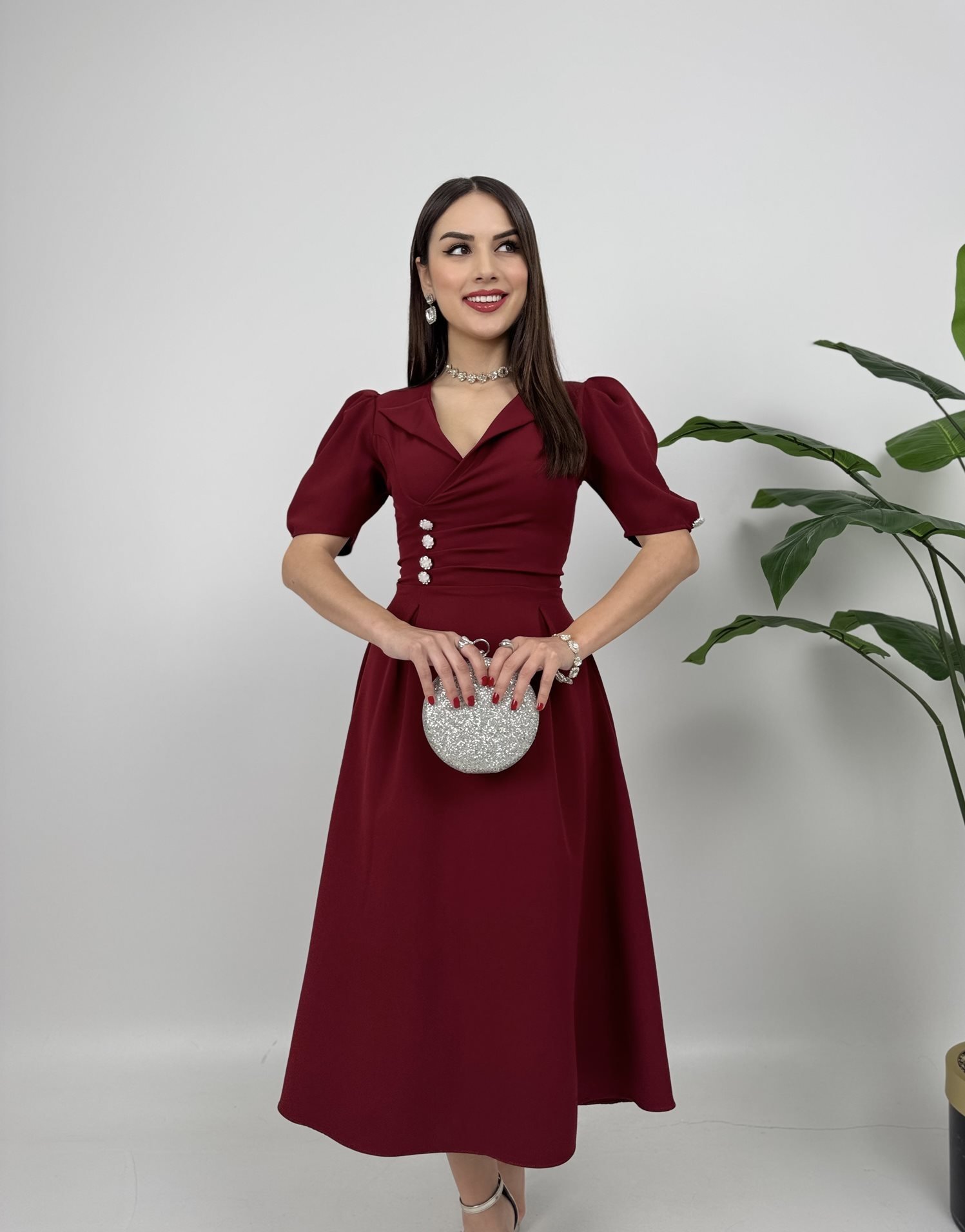 2130 CEKET YAKA BALON KOL DÜĞME DETAY ATLAS ELBİSE BURGUNDY - BORDO
