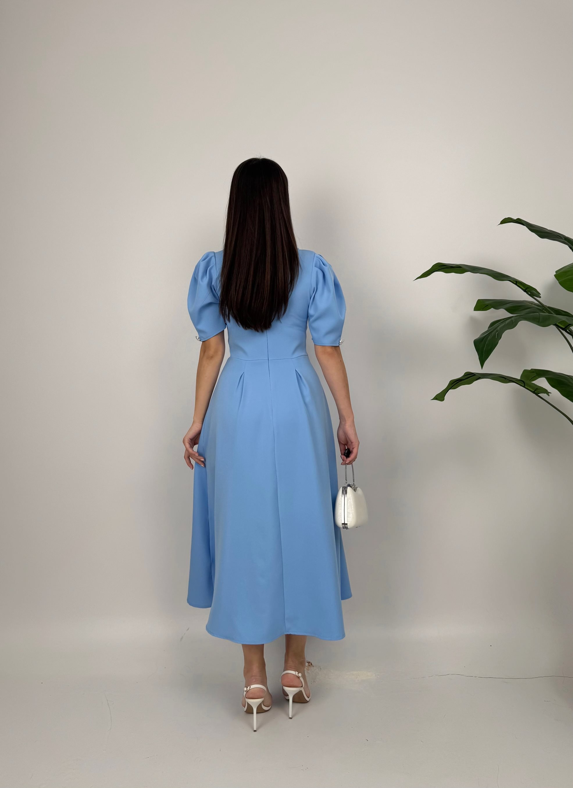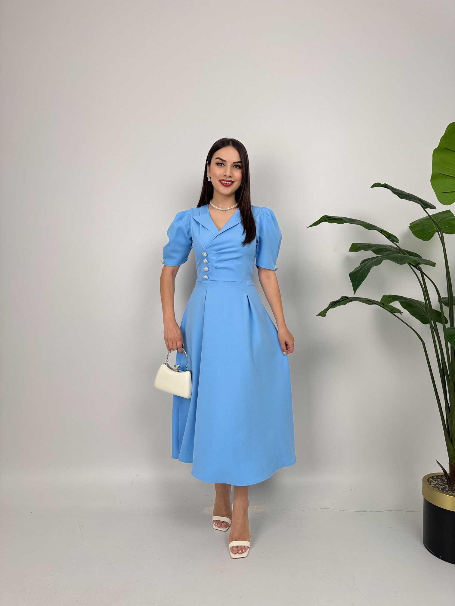 2130 CEKET YAKA BALON KOL DÜĞME DETAY ATLAS ELBİSE BABY BLUE - BEBE MAVİ