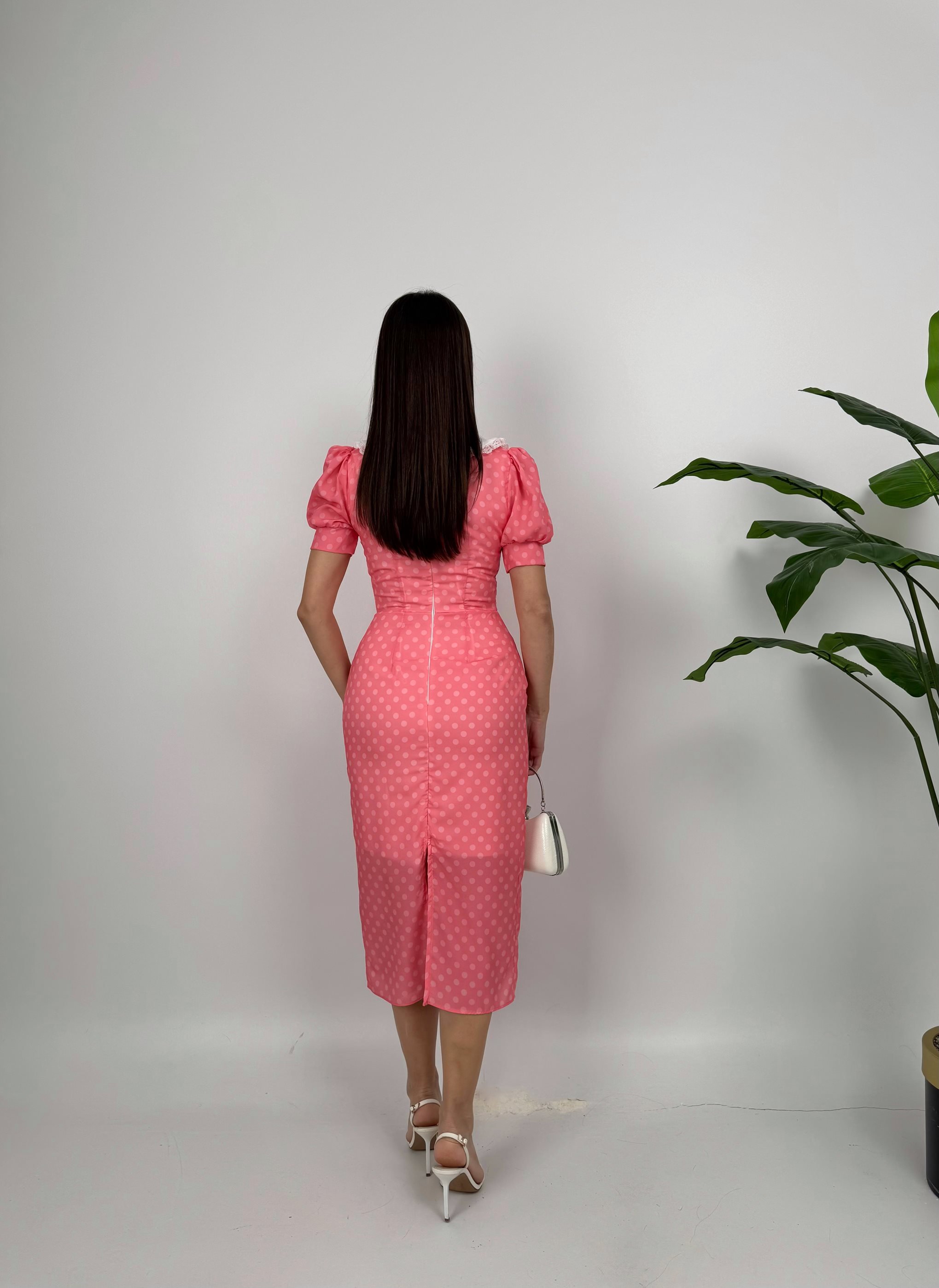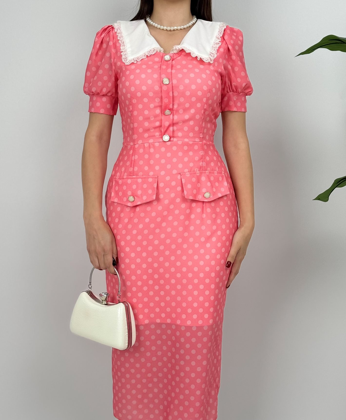 2144 YAKA DANTEL DETAY PUANTİYELİ ELBİSE PİNK - PEMBE