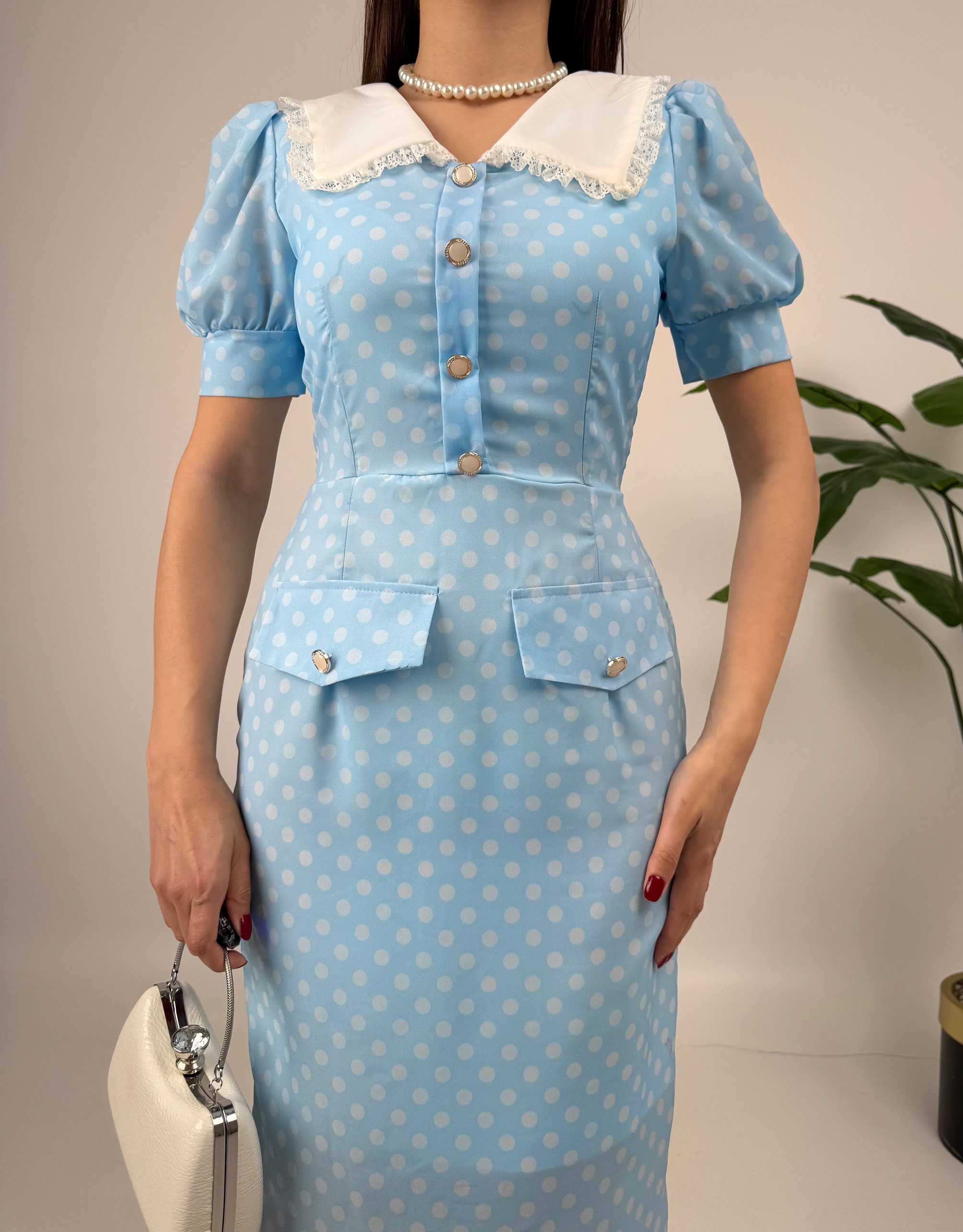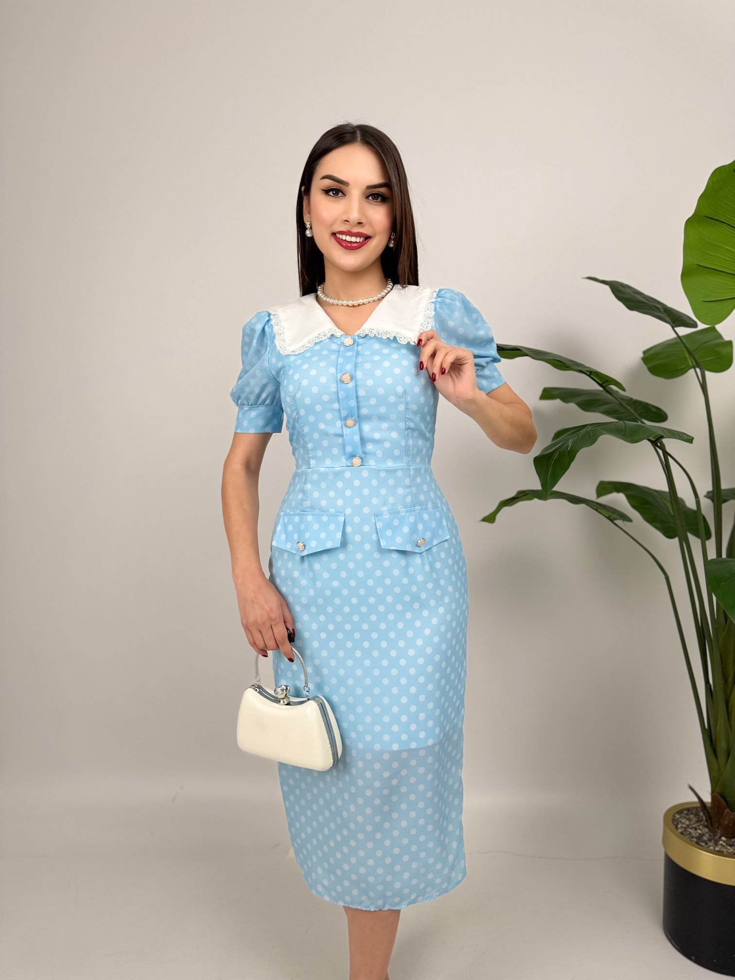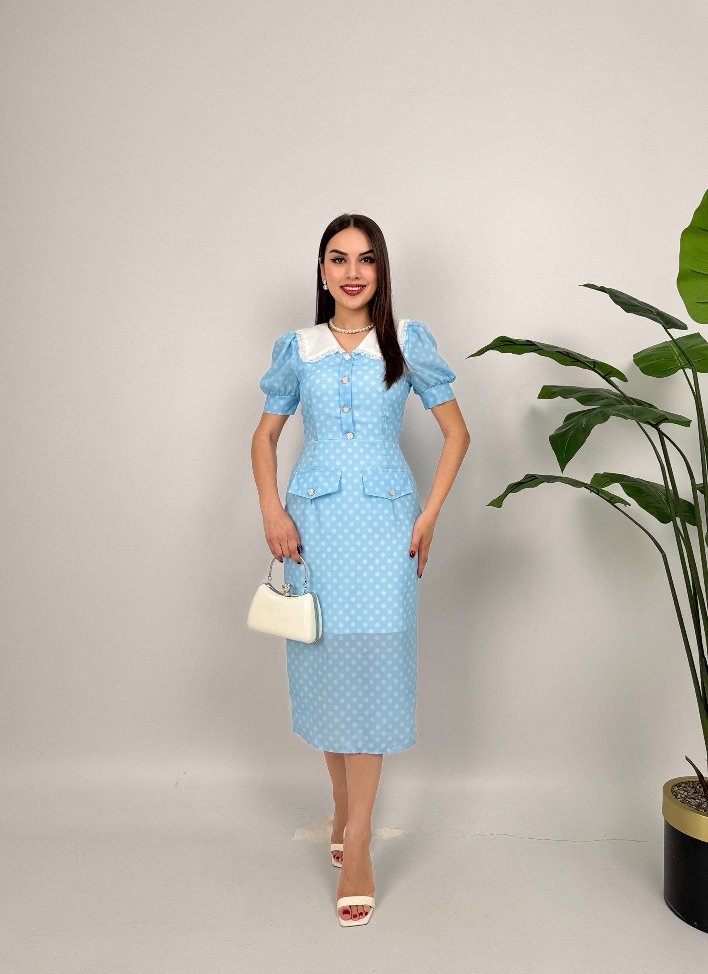 2144 YAKA DANTEL DETAY PUANTİYELİ ELBİSE BABY BLUE - BEBE MAVİ