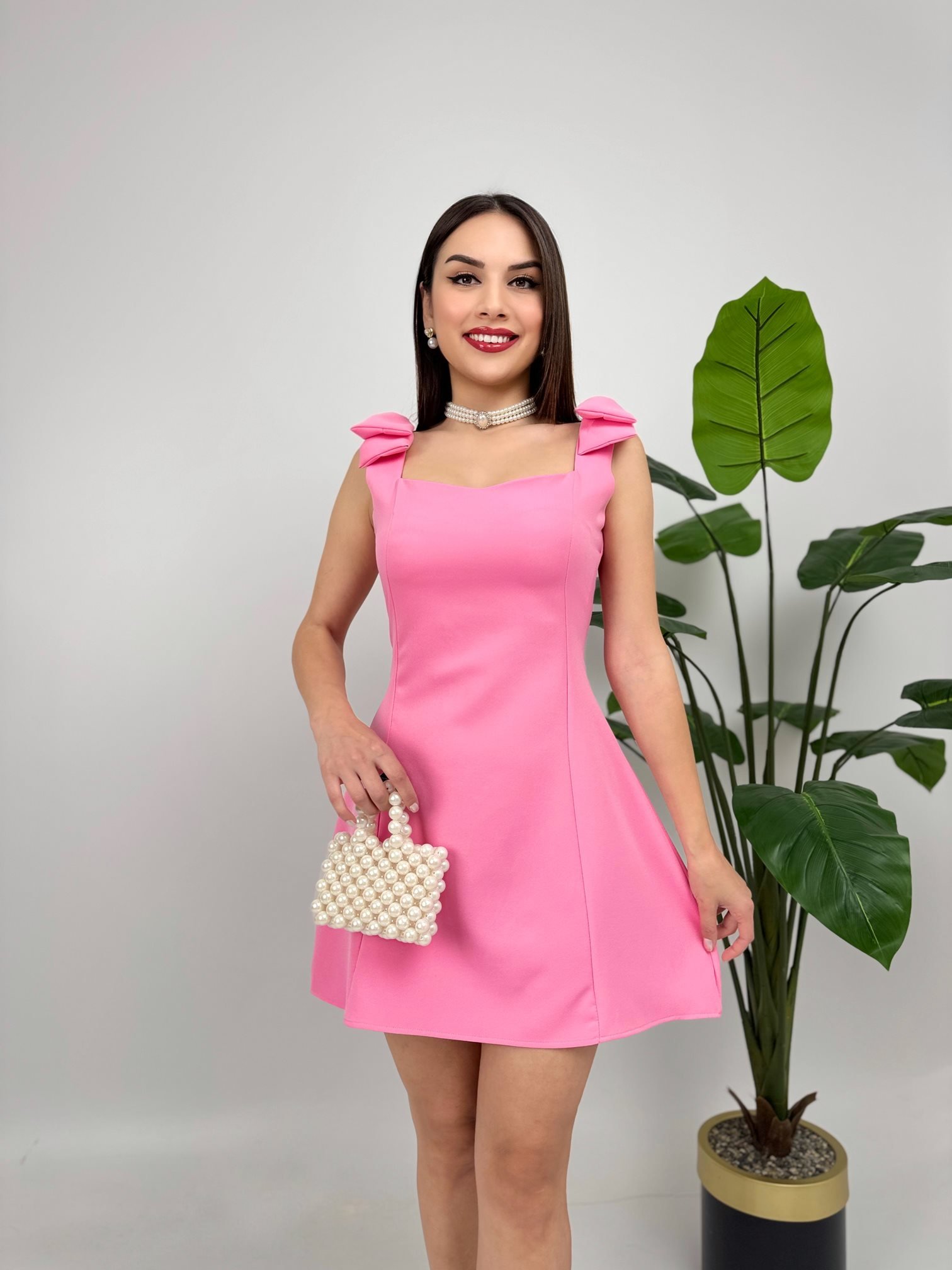 3001 OMUZDAN FİYONKLU MİNİ ELBİSE PİNK - PEMBE