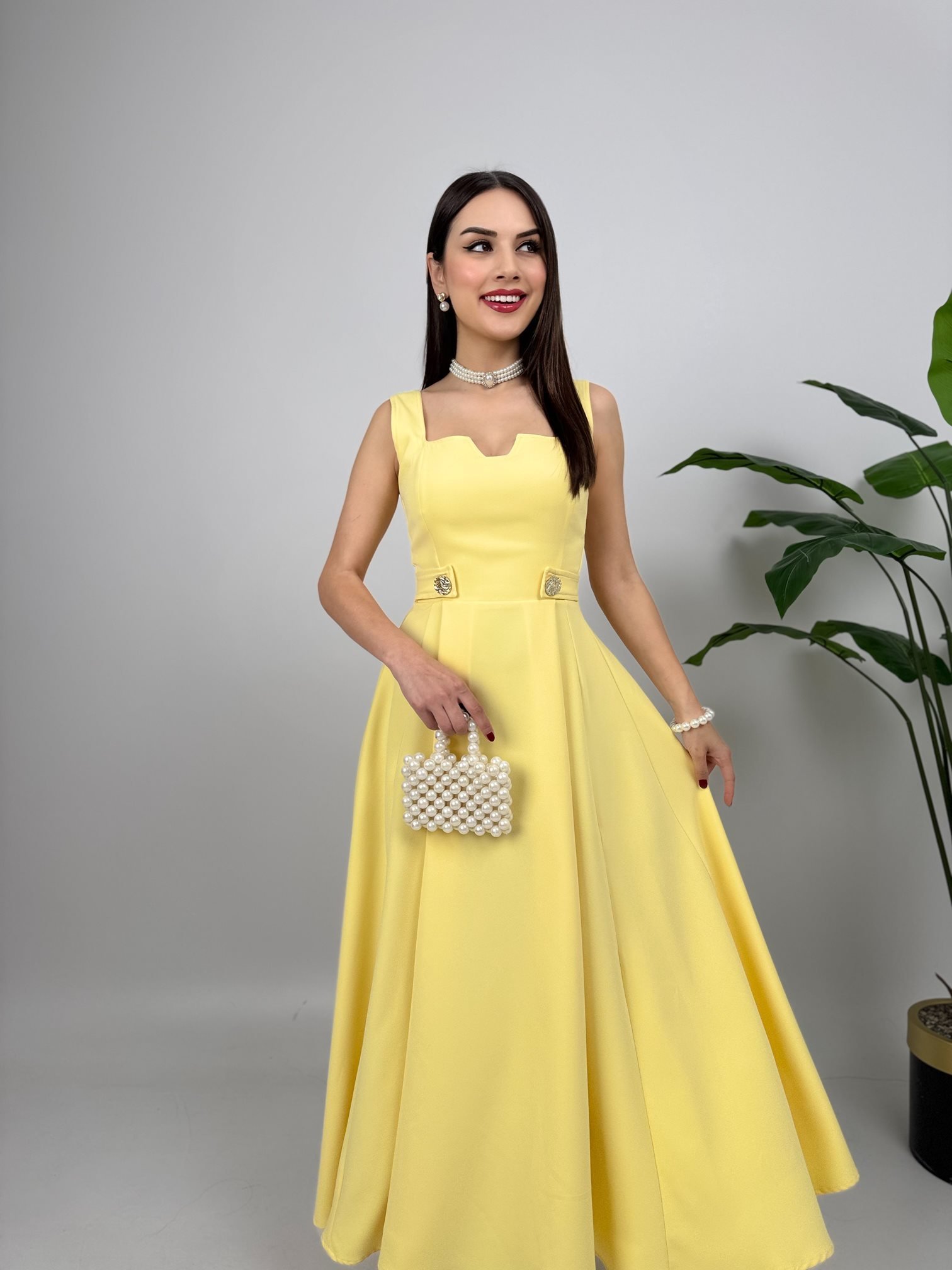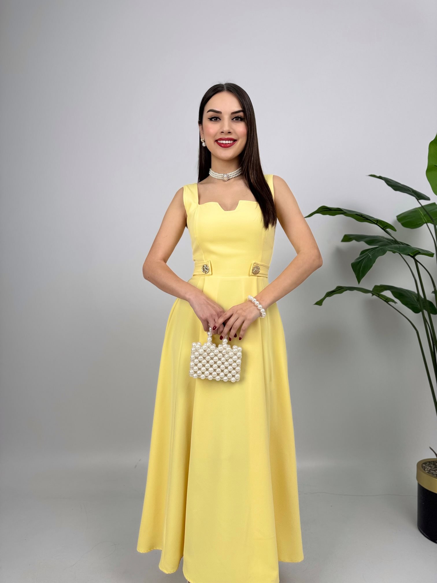 3023 KEMERİ DÜĞMELİ ELBİSE YELLOW - SARI