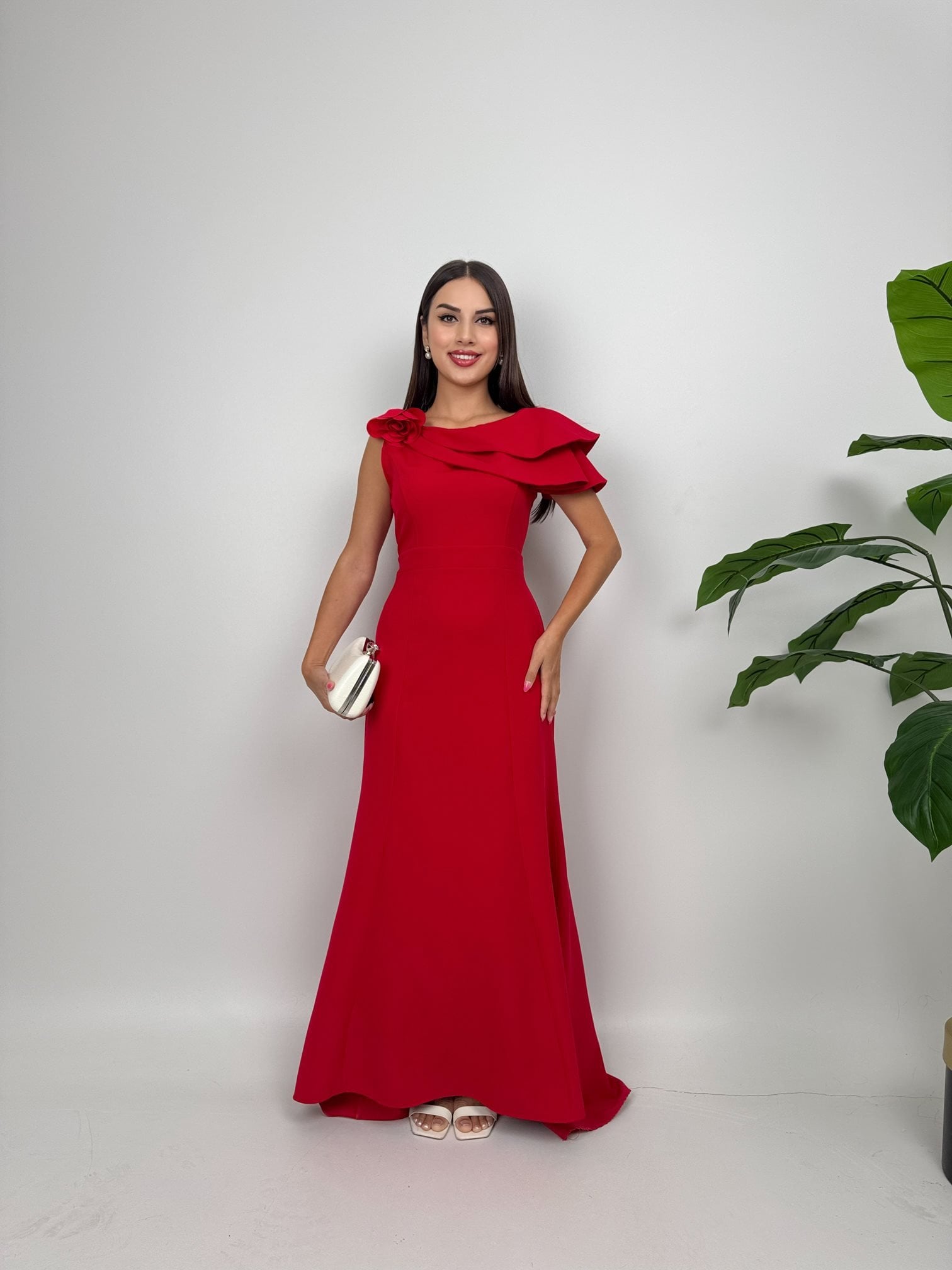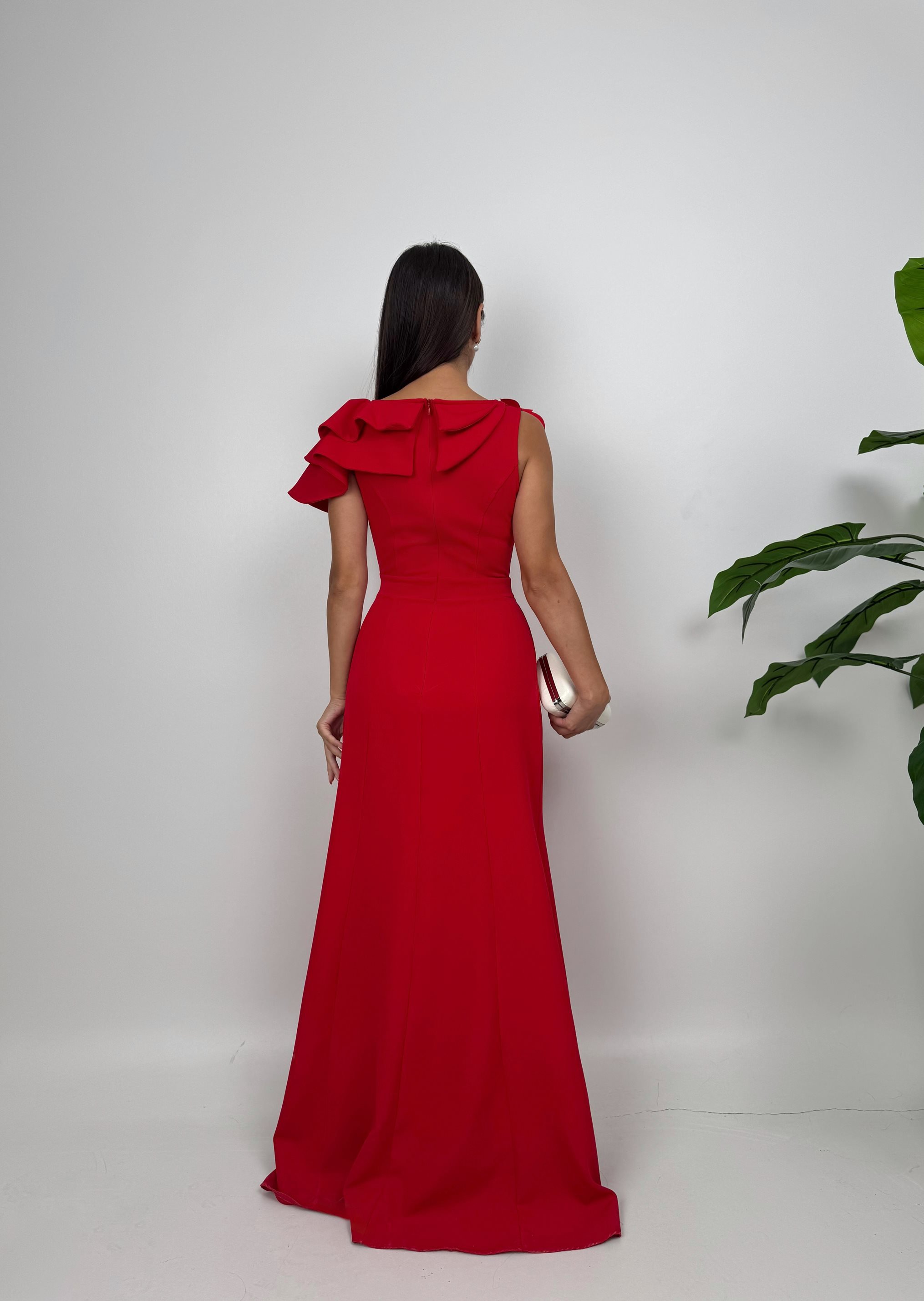 3025 OMUZ FIRFIRLI GÜLLÜ ELBİSE RED - KIRMIZI