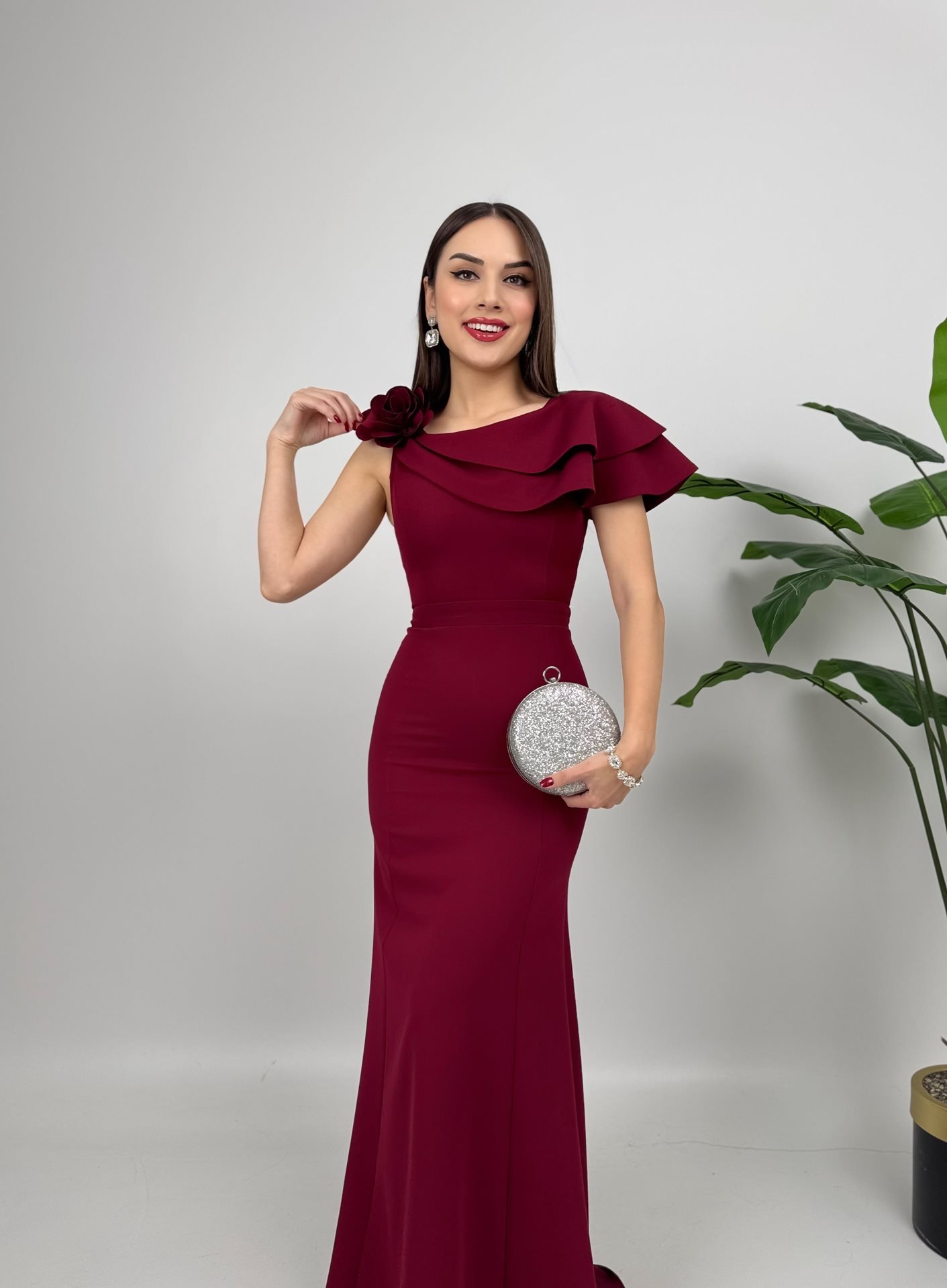 3025 OMUZ FIRFIRLI GÜLLÜ ELBİSE BURGUNDY - BORDO