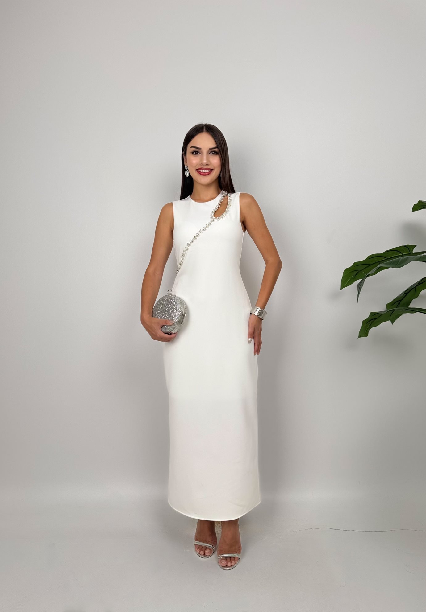 3048 OMUZ DEKOLTELİ ELBİSE WHİTE - BEYAZ