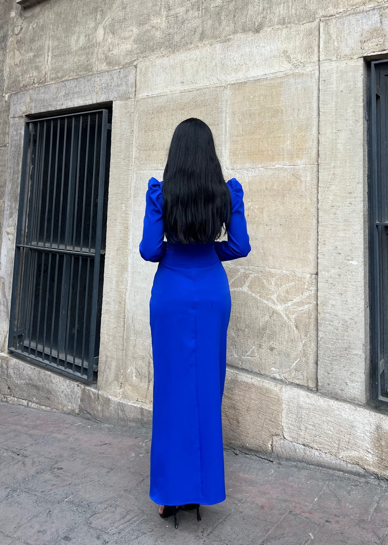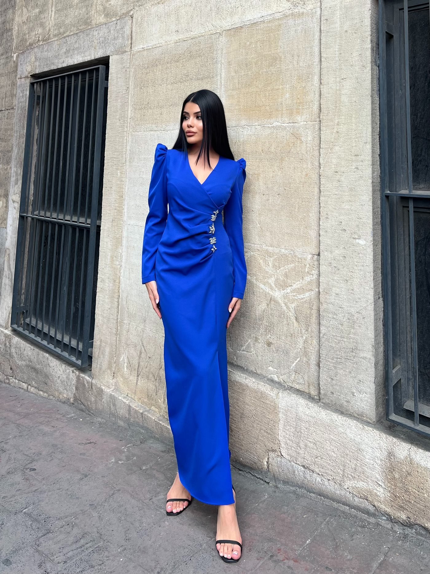 3057 V YAKA AKSESUARLI ELBİSE SAXE - SAX