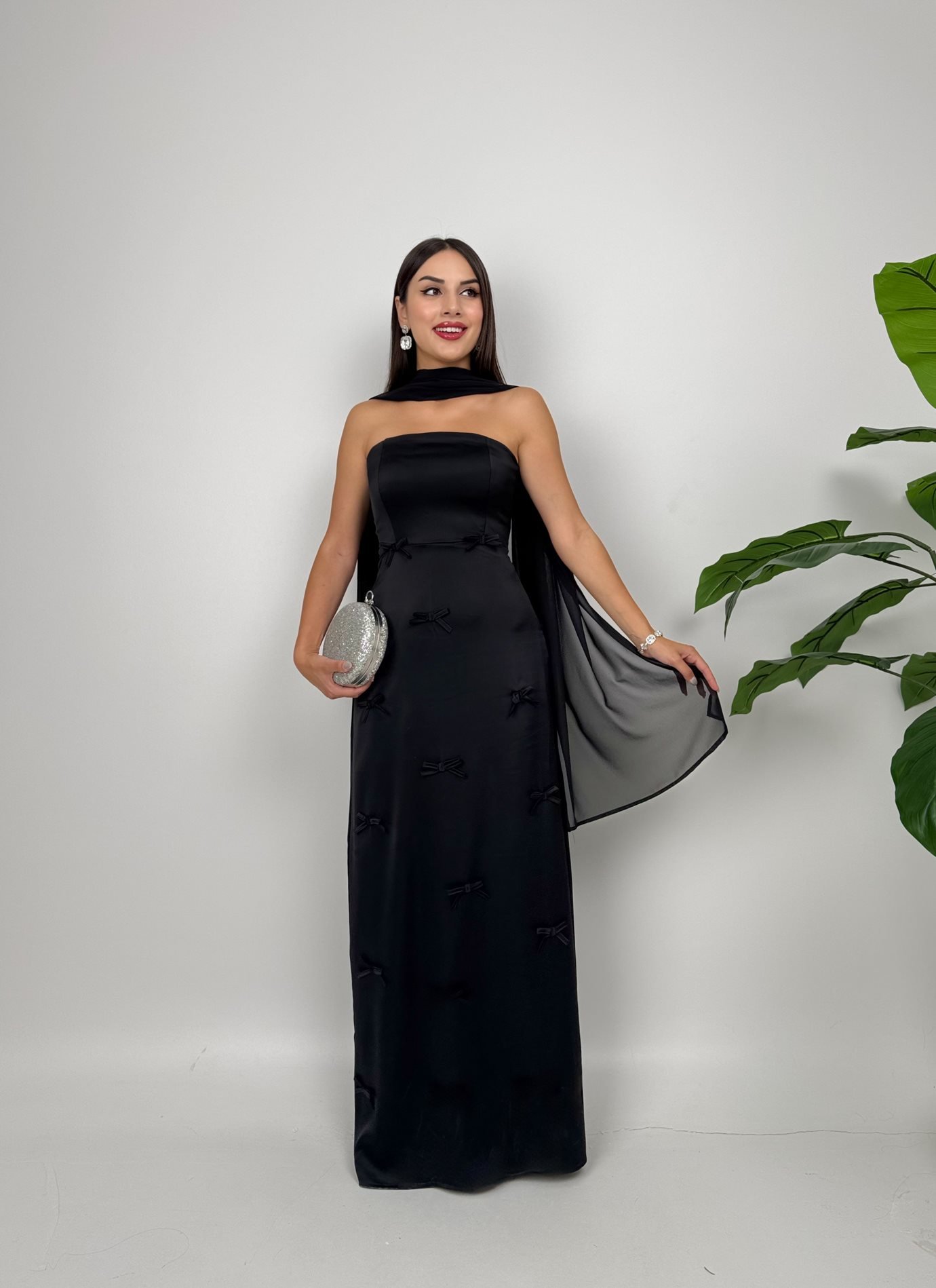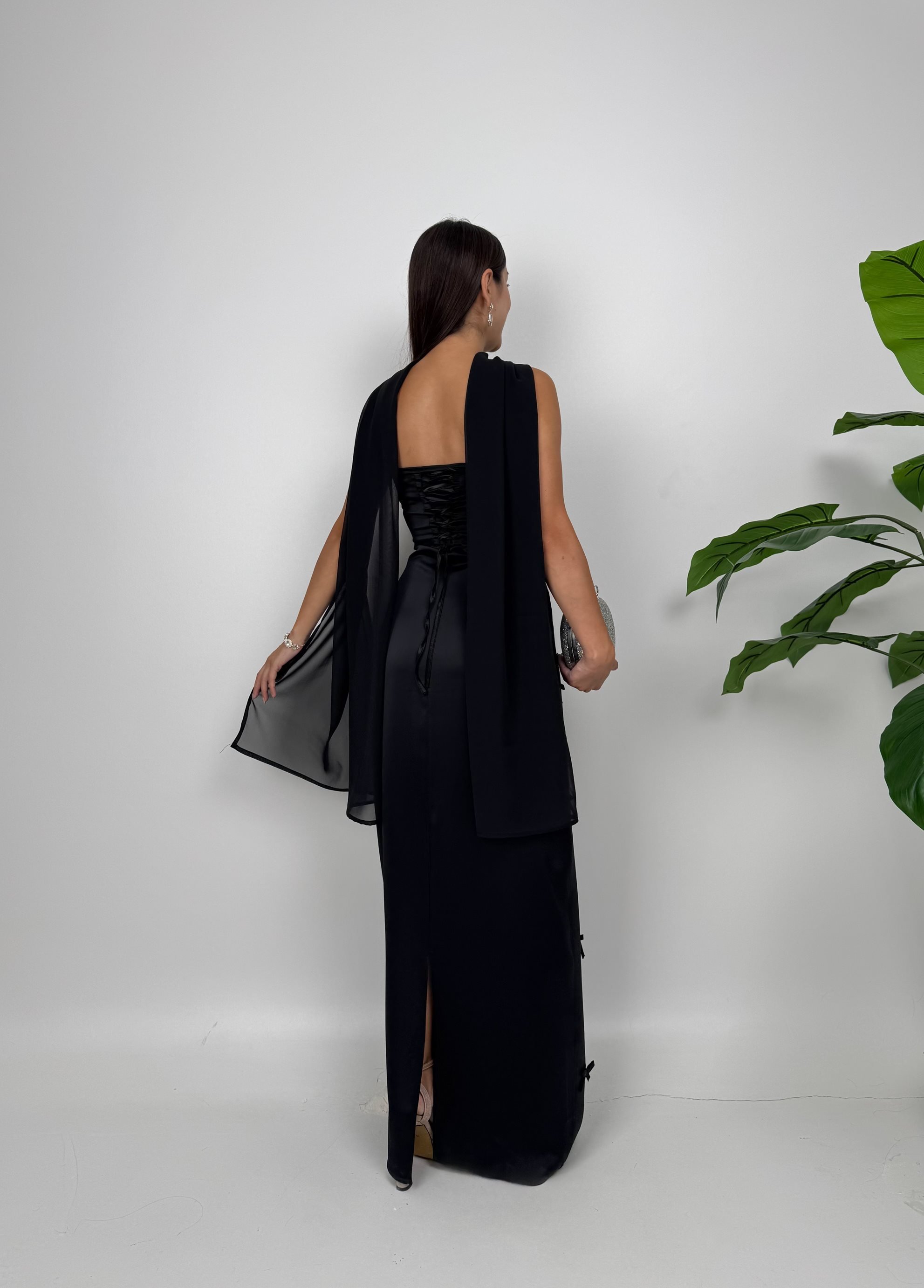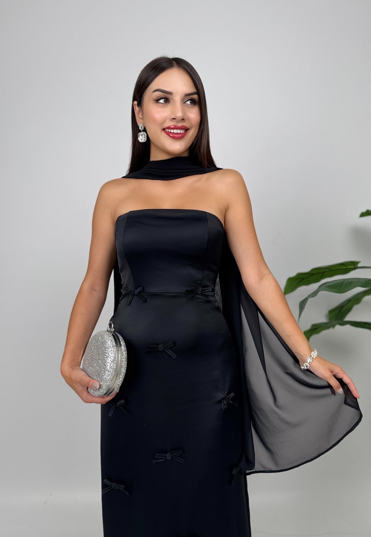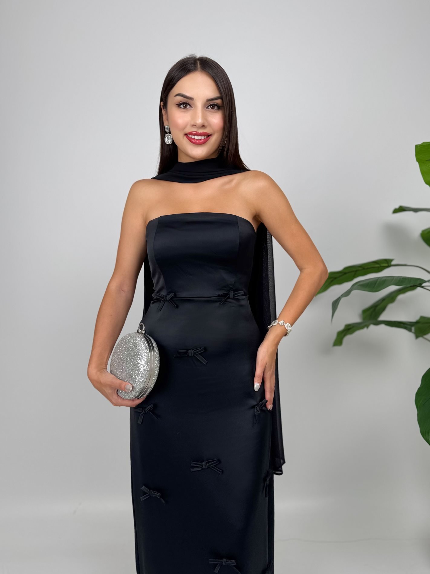 3060 SATEN KURDELELİ ELBİSE BLACK - SİYAH