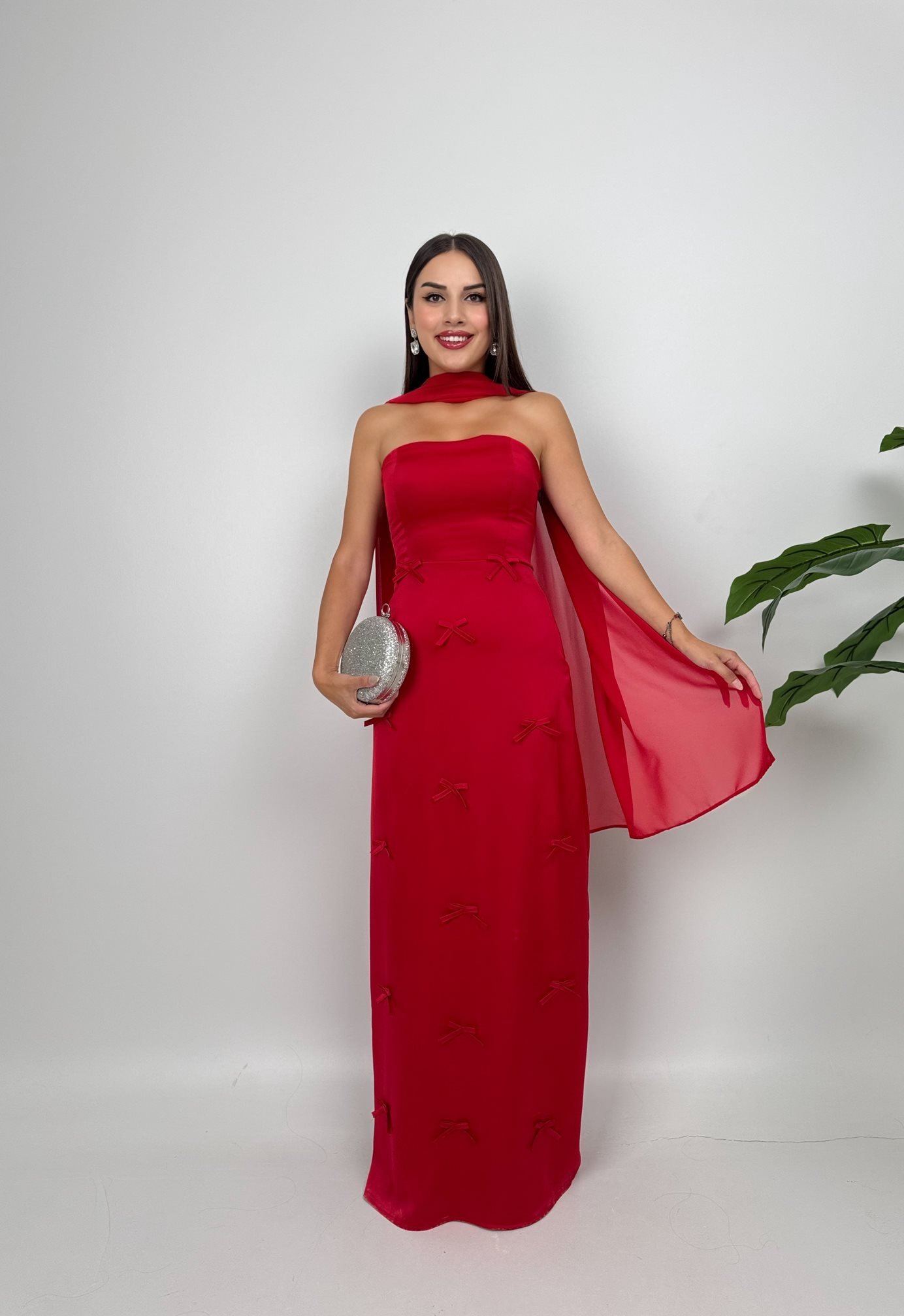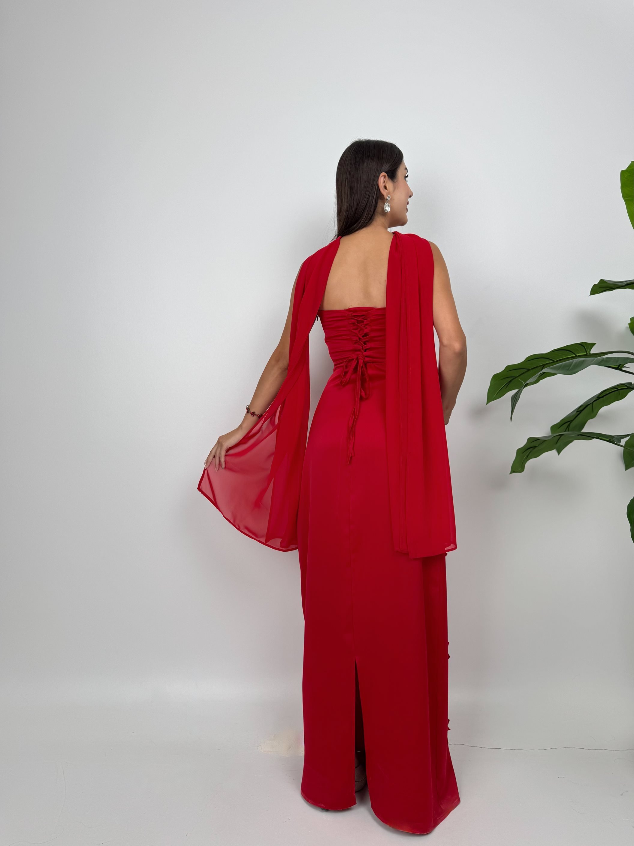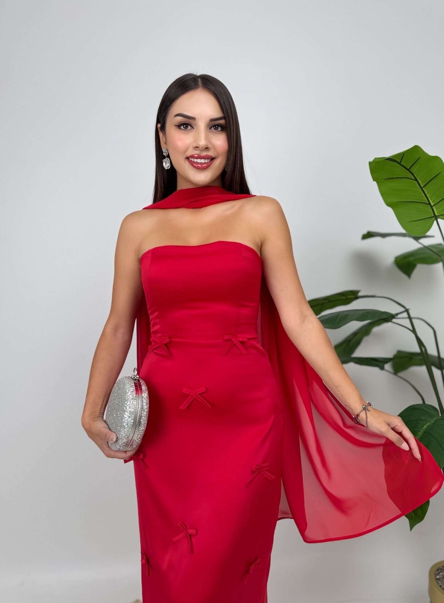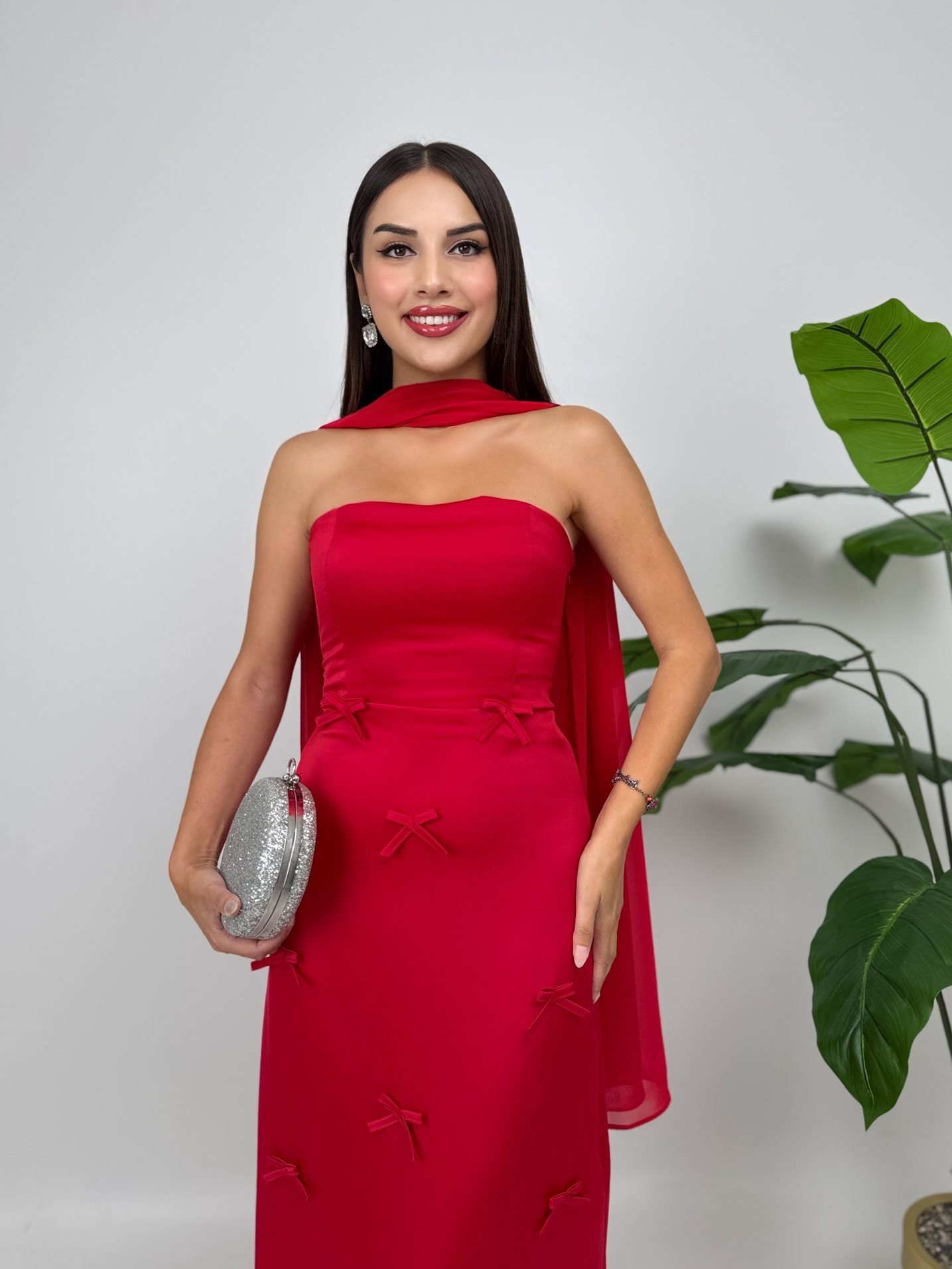 3060 SATEN KURDELELİ ELBİSE RED - KIRMIZI