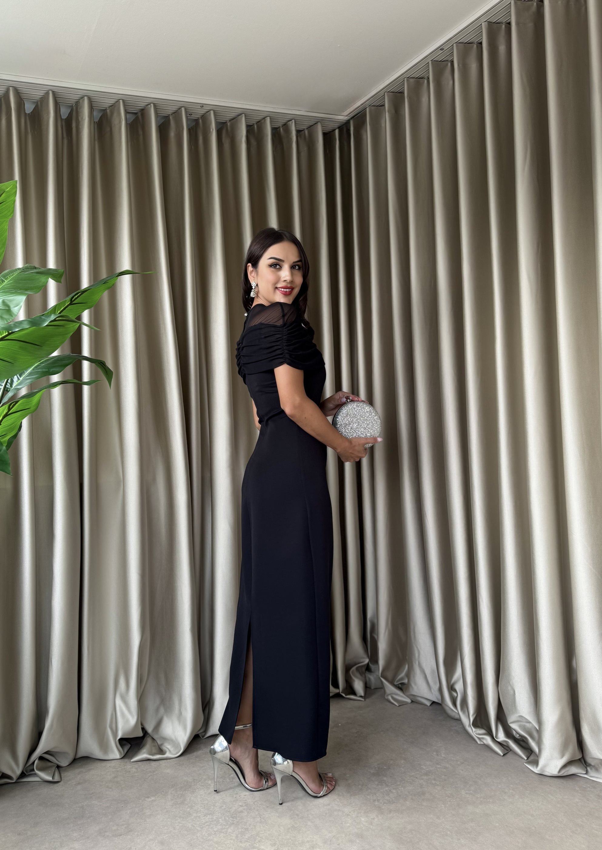3065 TÜL YAKA AKSESUARLI ELBİSE BLACK - SİYAH