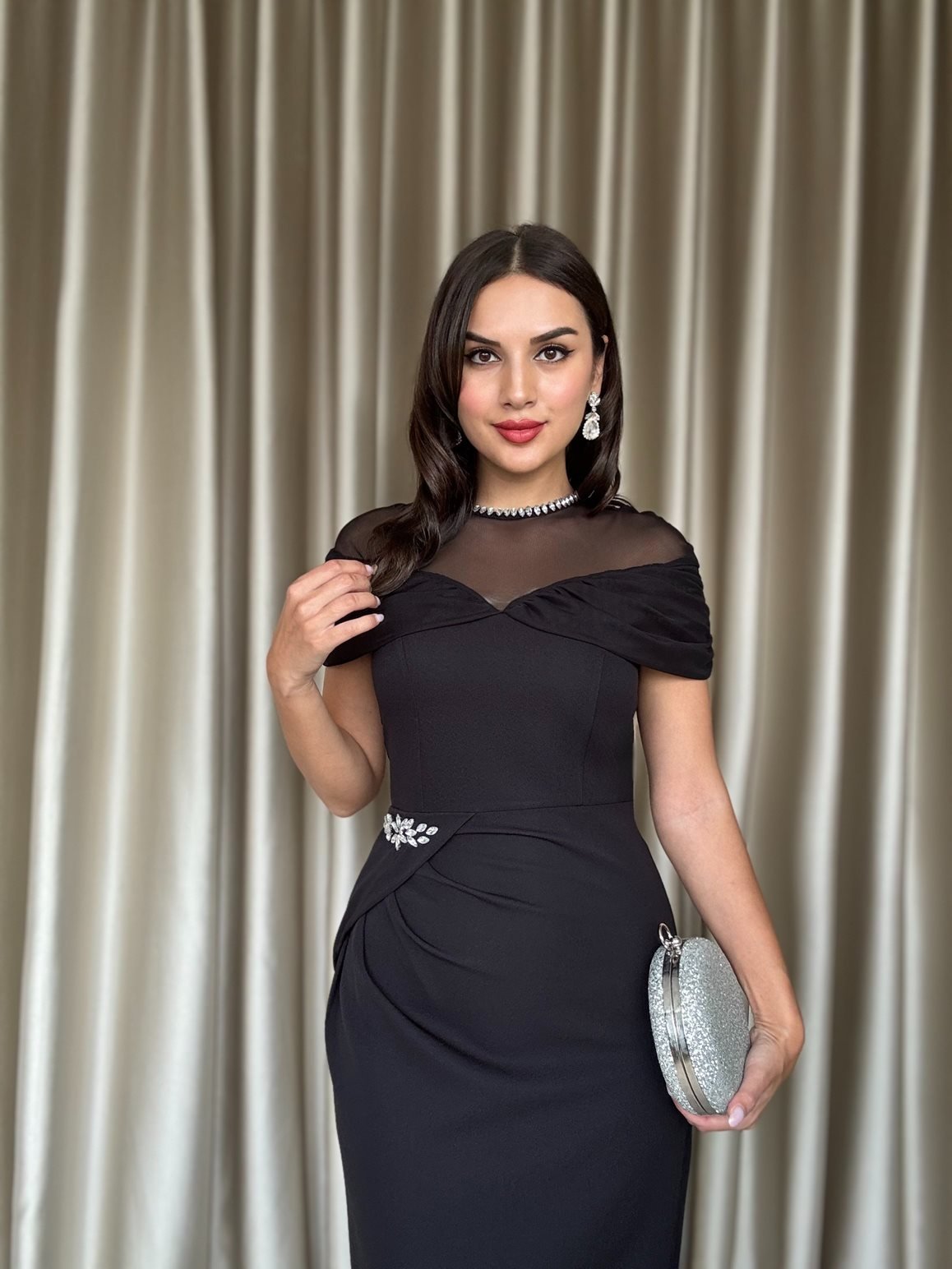 3065 TÜL YAKA AKSESUARLI ELBİSE