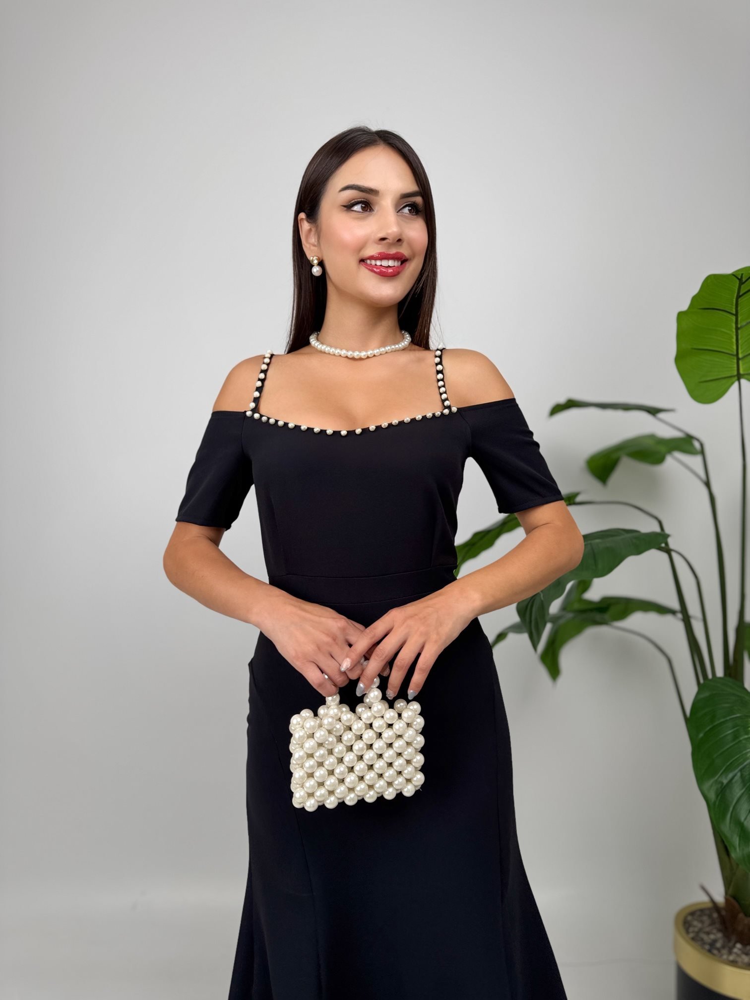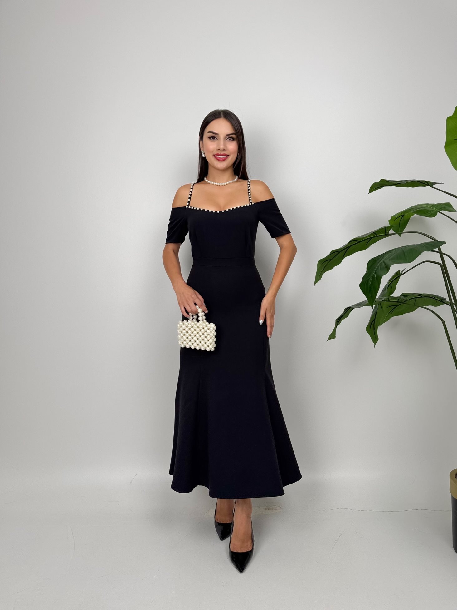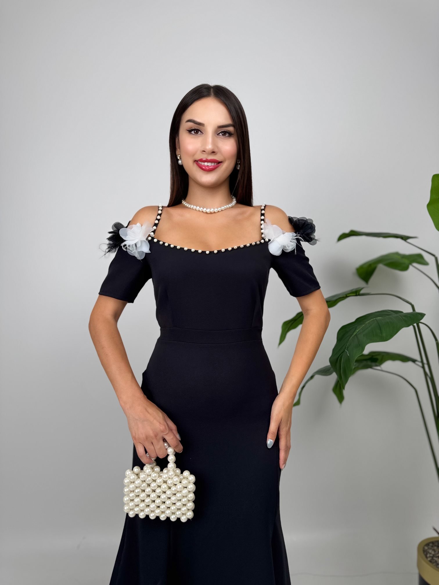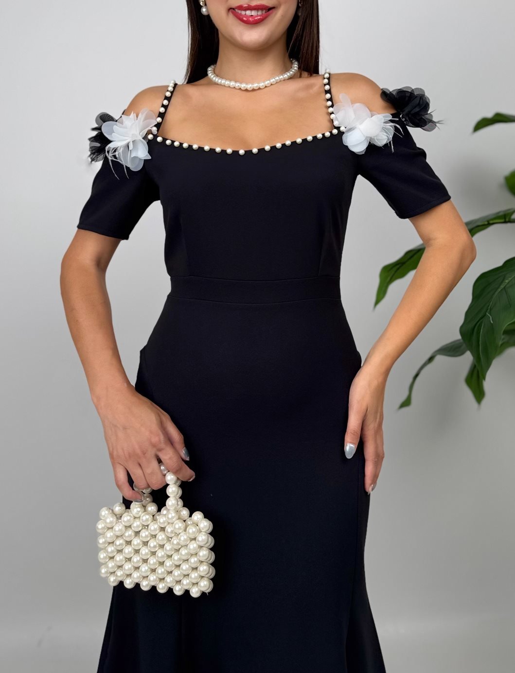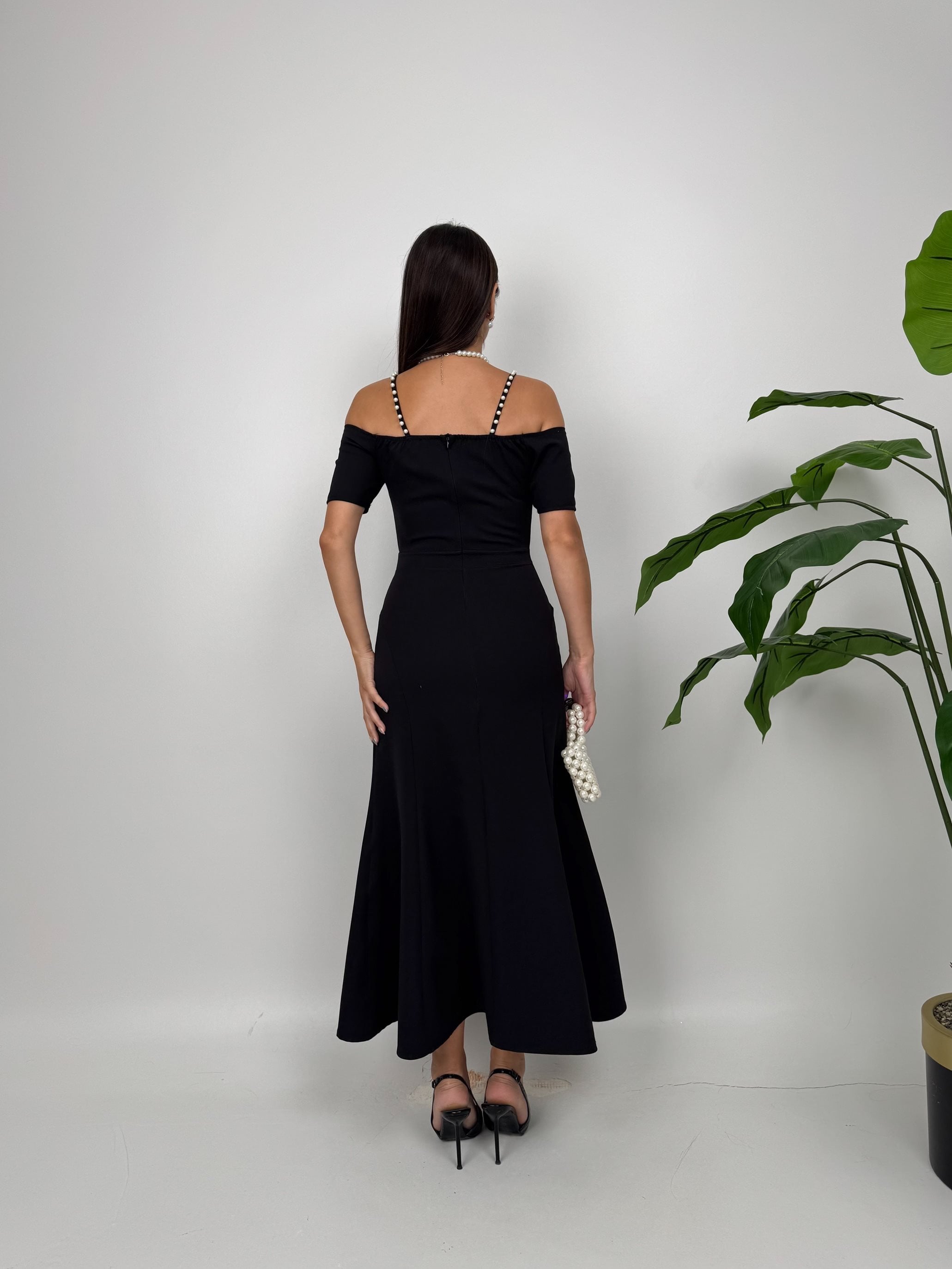 4010 İNCİ DETAYLI KOL GÜLLÜ ASKILI ELBİSE BLACK - SİYAH
