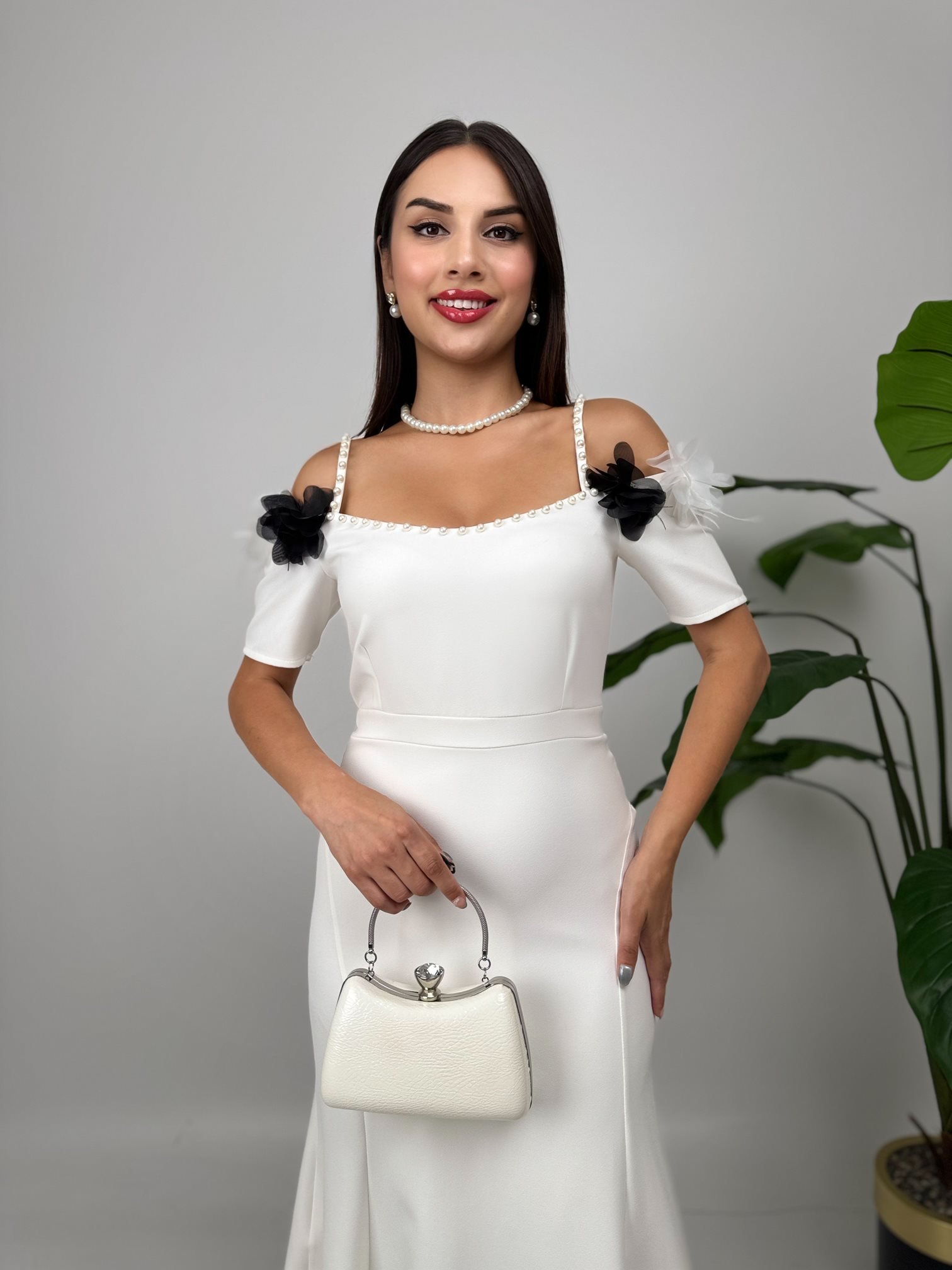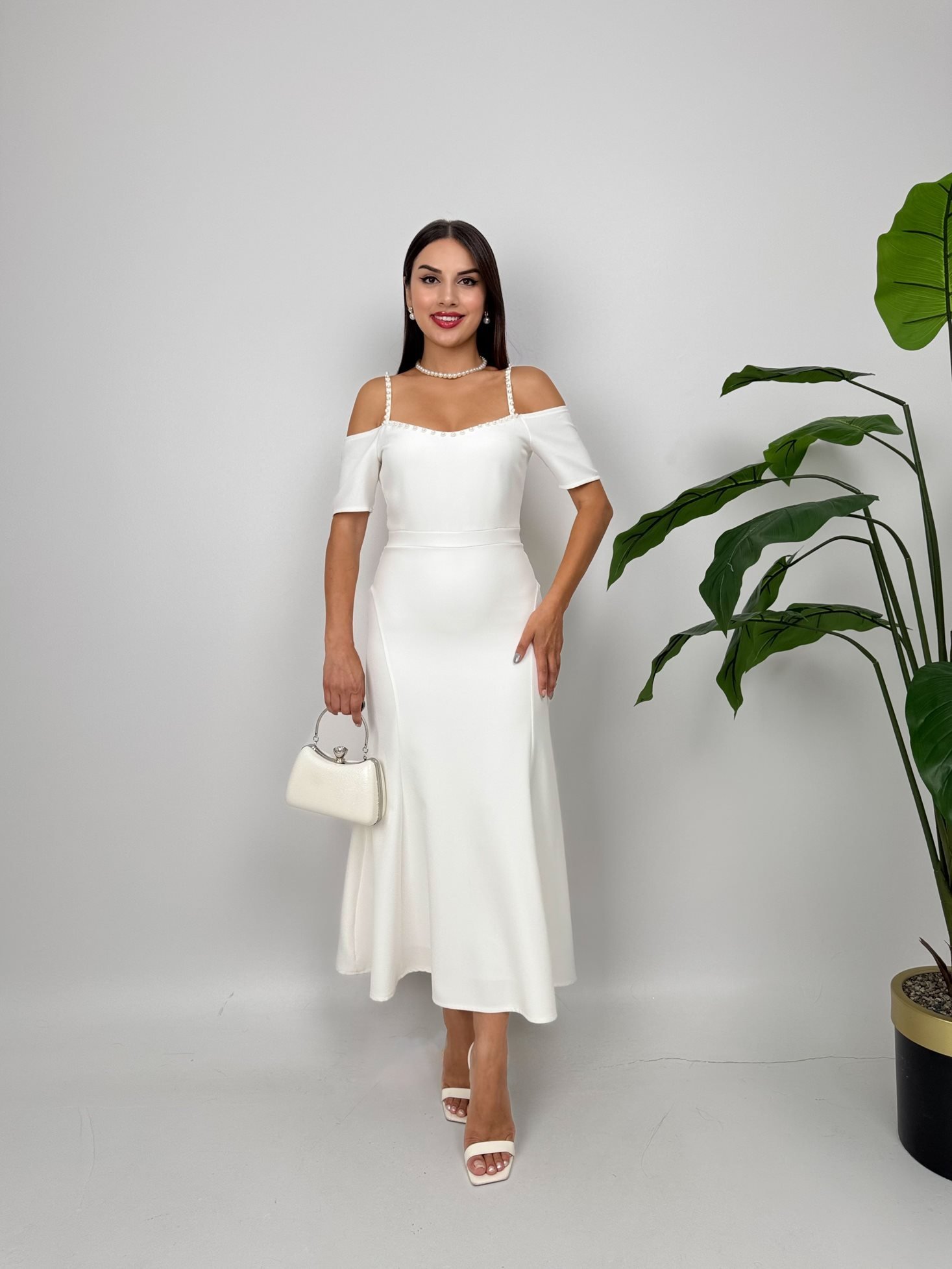 4010 İNCİ DETAYLI KOL GÜLLÜ ASKILI ELBİSE WHİTE - BEYAZ