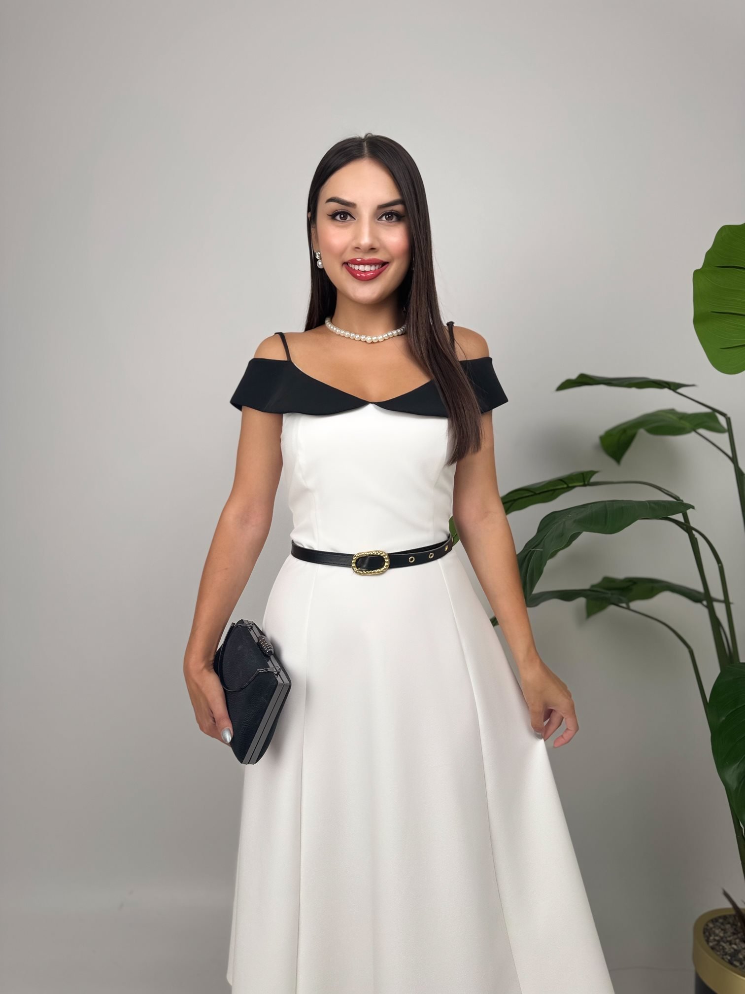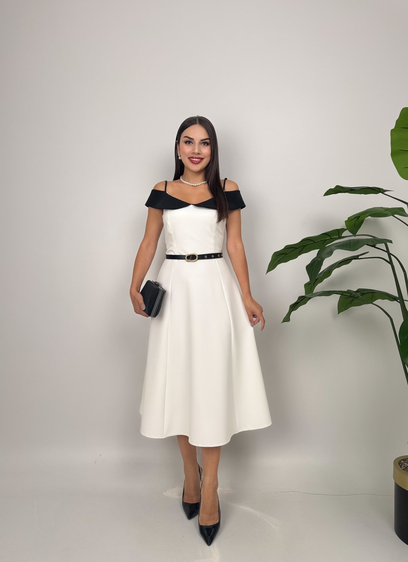 4012 ASKILI GÖGÜS ALERLİ KEMER DETAYLI ELBİSE WHİTE - BEYAZ