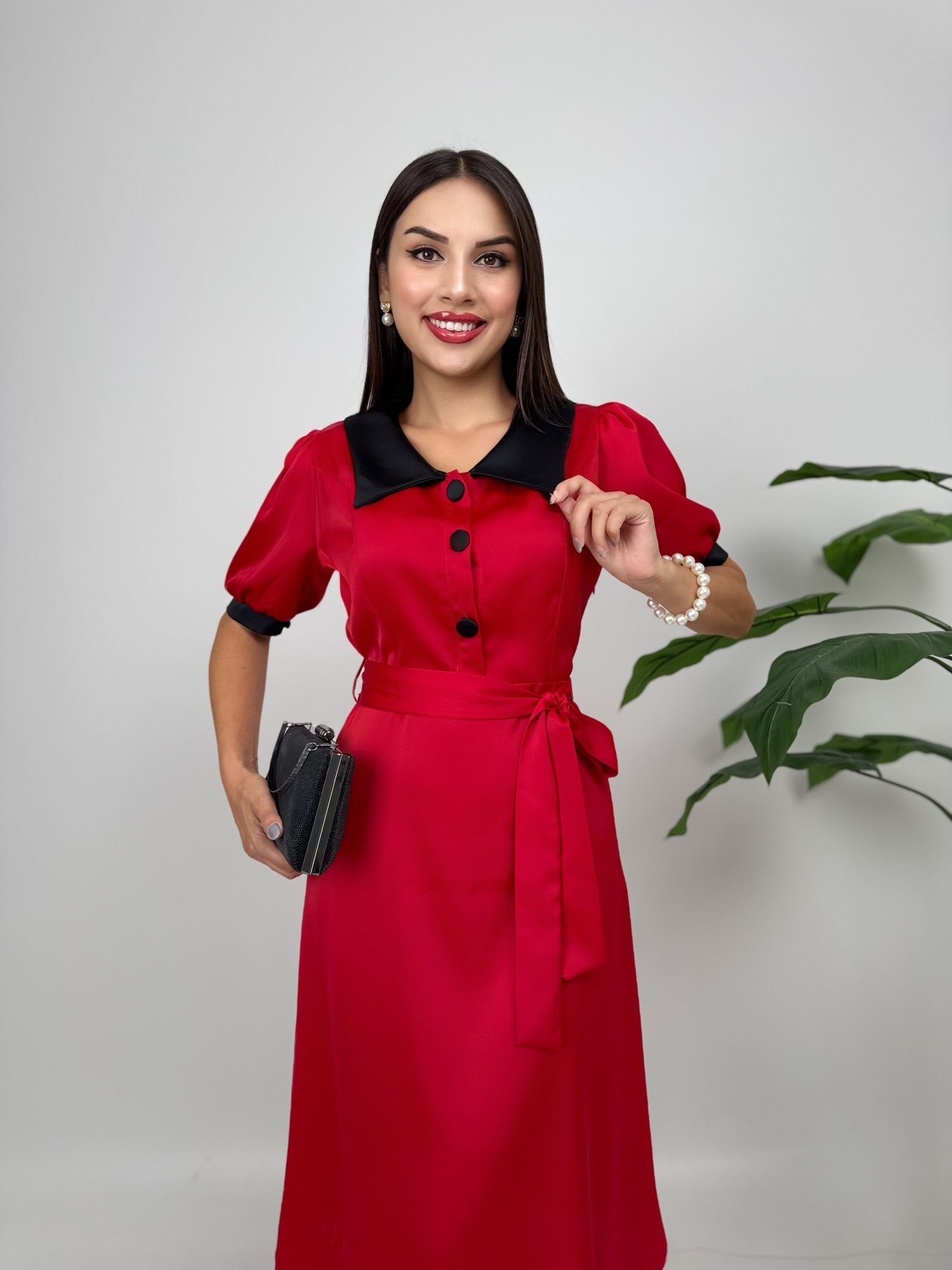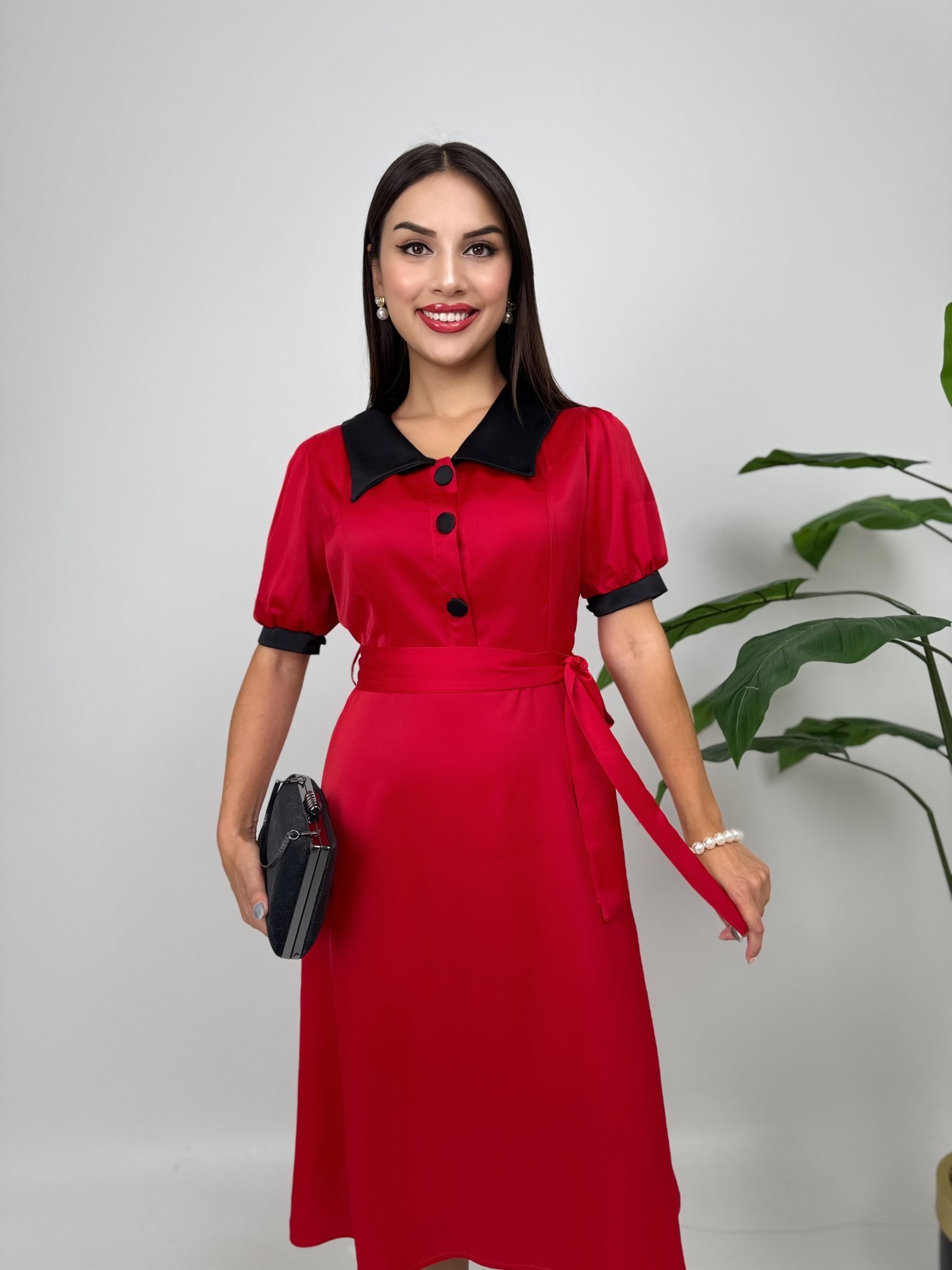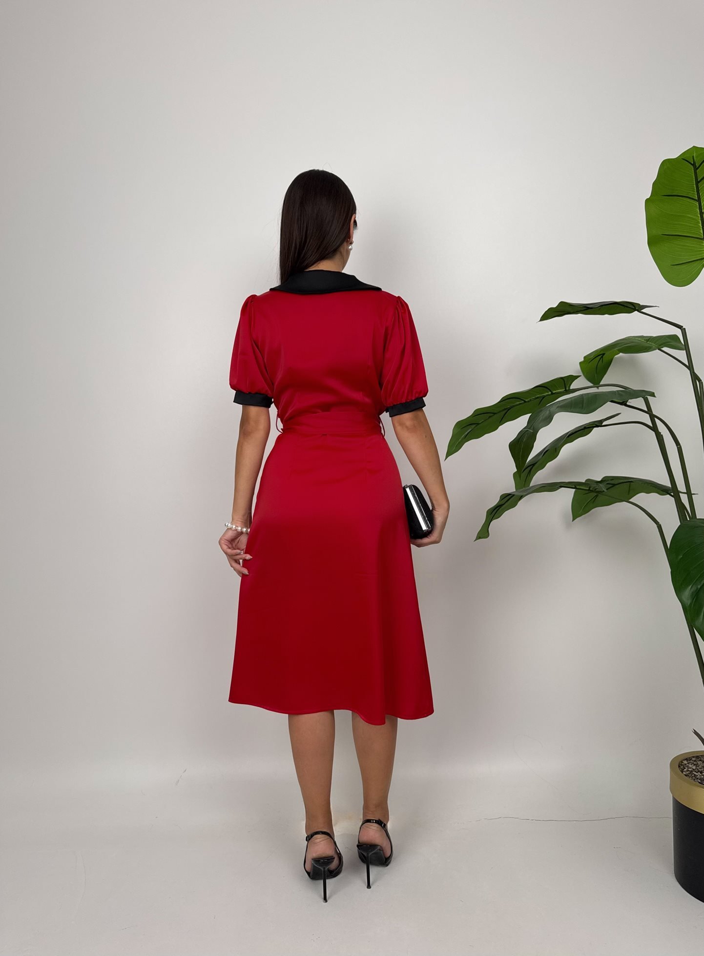 4020 BAĞLAMA KEMERLİ V YAKA GARNİ DÜĞME ELBİSE RED - KIRMIZI