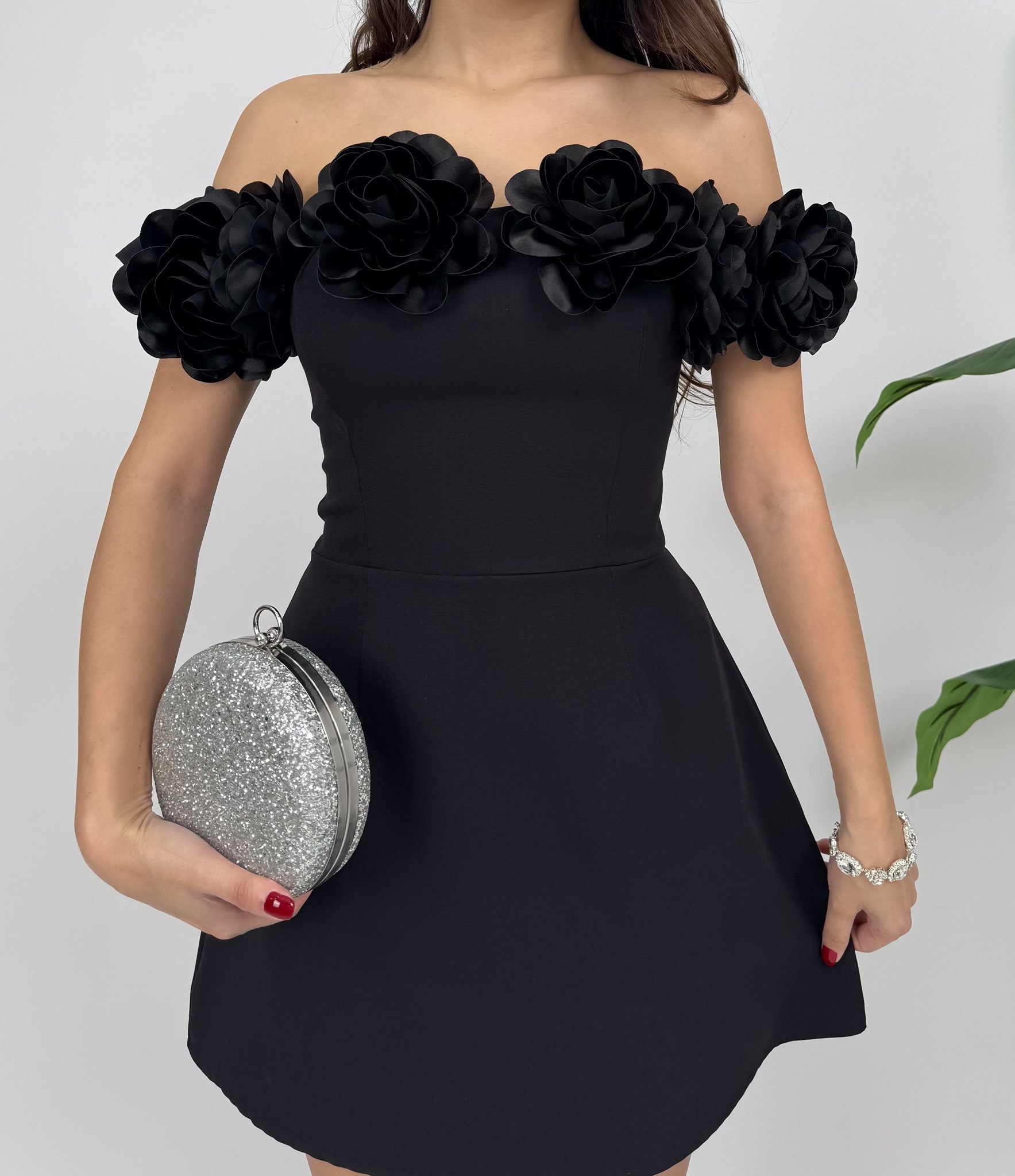 4022 STRAPLEZ YAKA GÜLLÜ MİNİ ELBİSE BLACK - SİYAH
