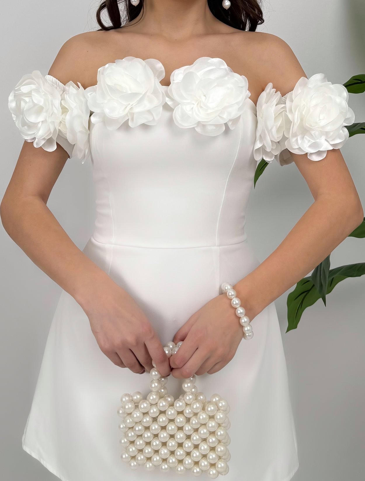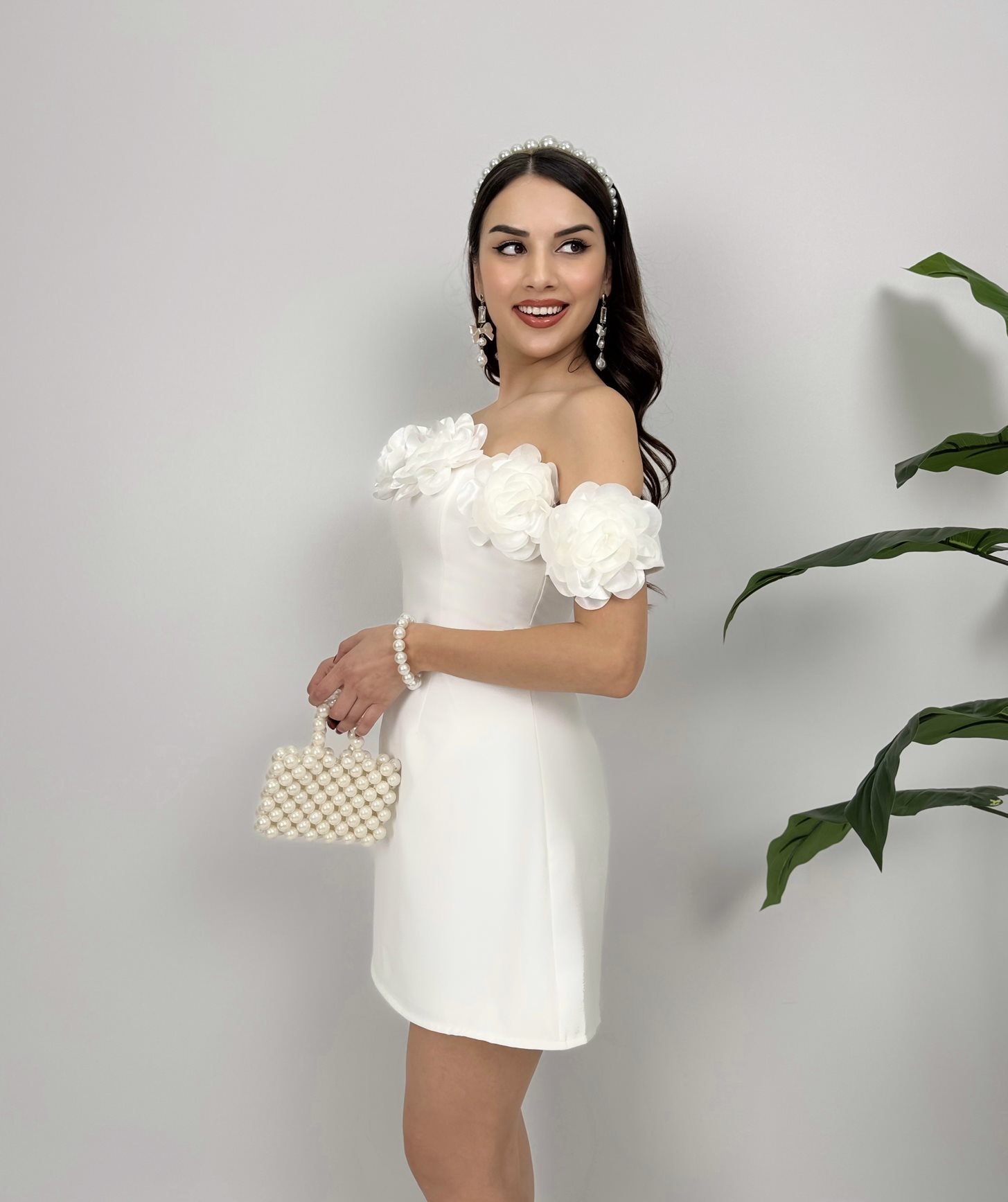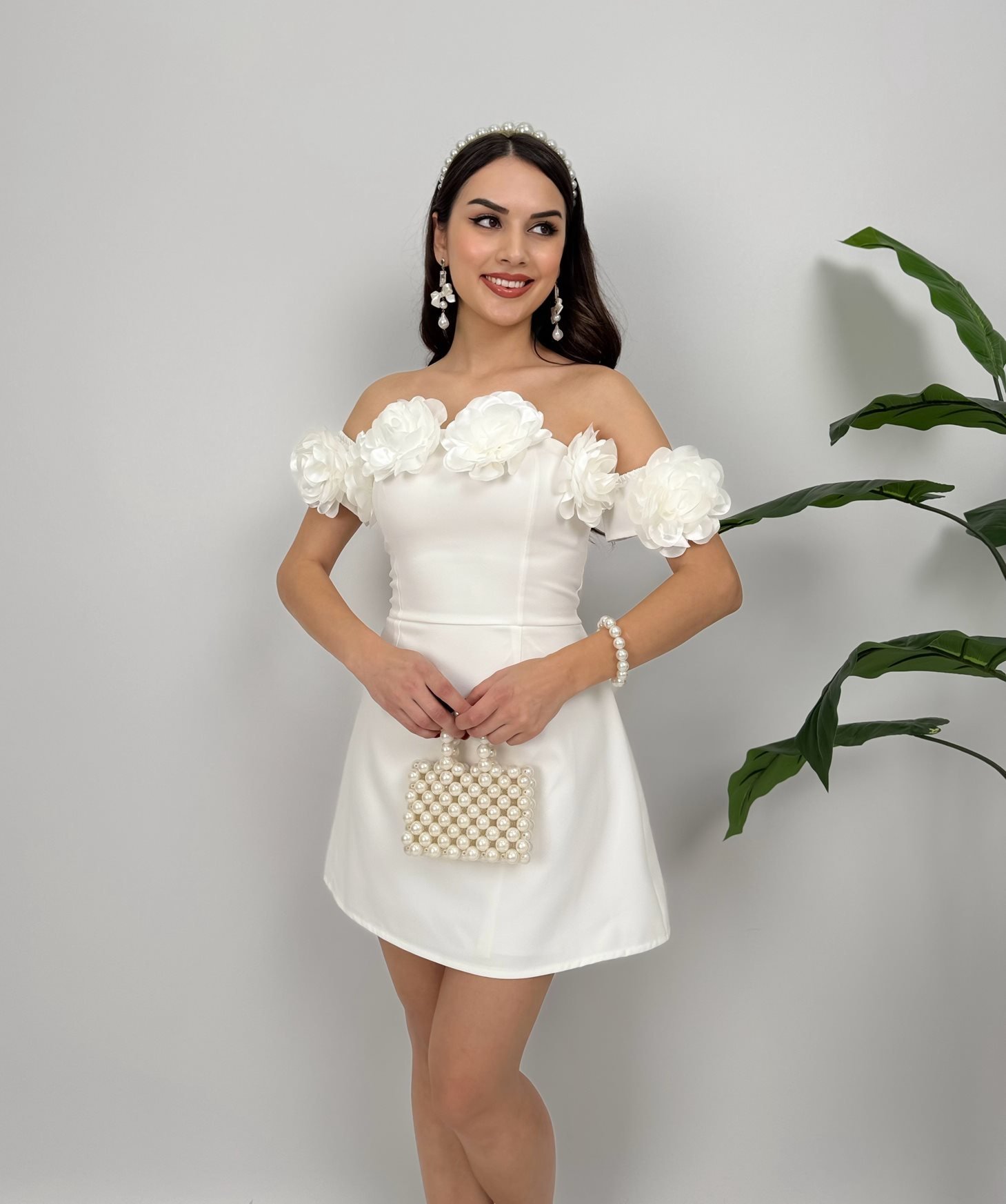 4022 STRAPLEZ YAKA GÜLLÜ MİNİ ELBİSE WHİTE - BEYAZ