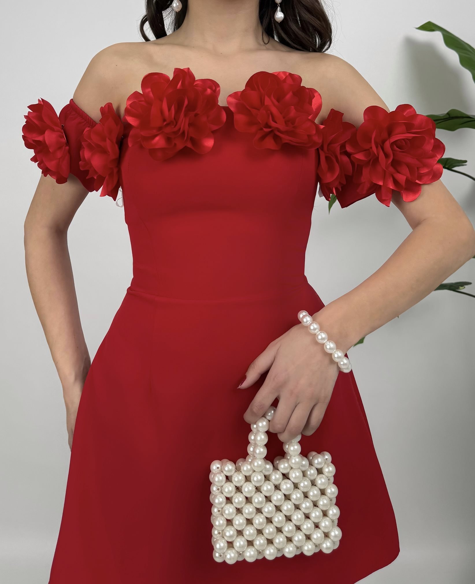 4022 STRAPLEZ YAKA GÜLLÜ MİNİ ELBİSE RED - KIRMIZI