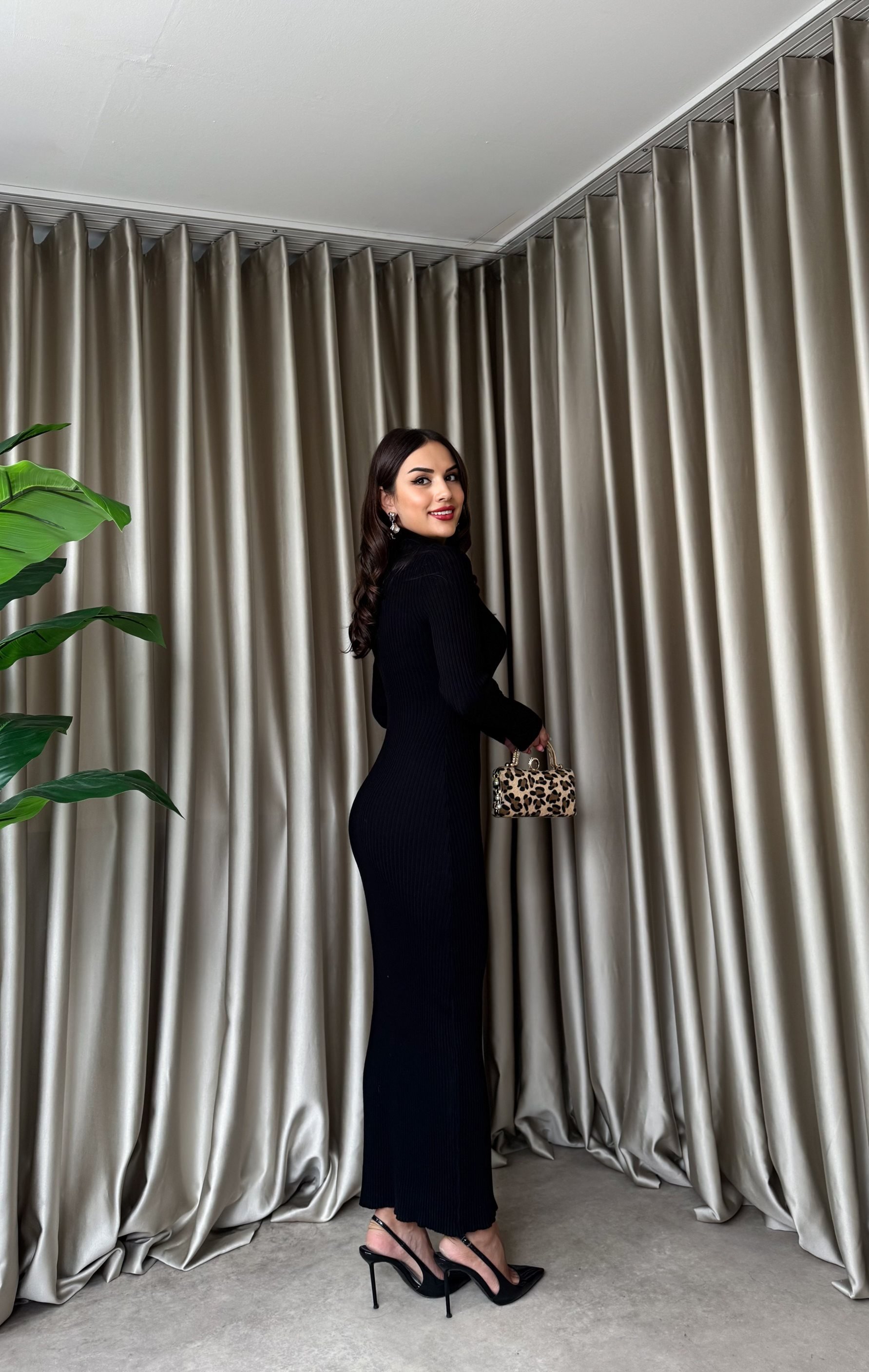 5029 BOĞAZ FERMUARLI İNCE FİTTİLLİ UZUN TRİKO ELBİSE BLACK - SİYAH